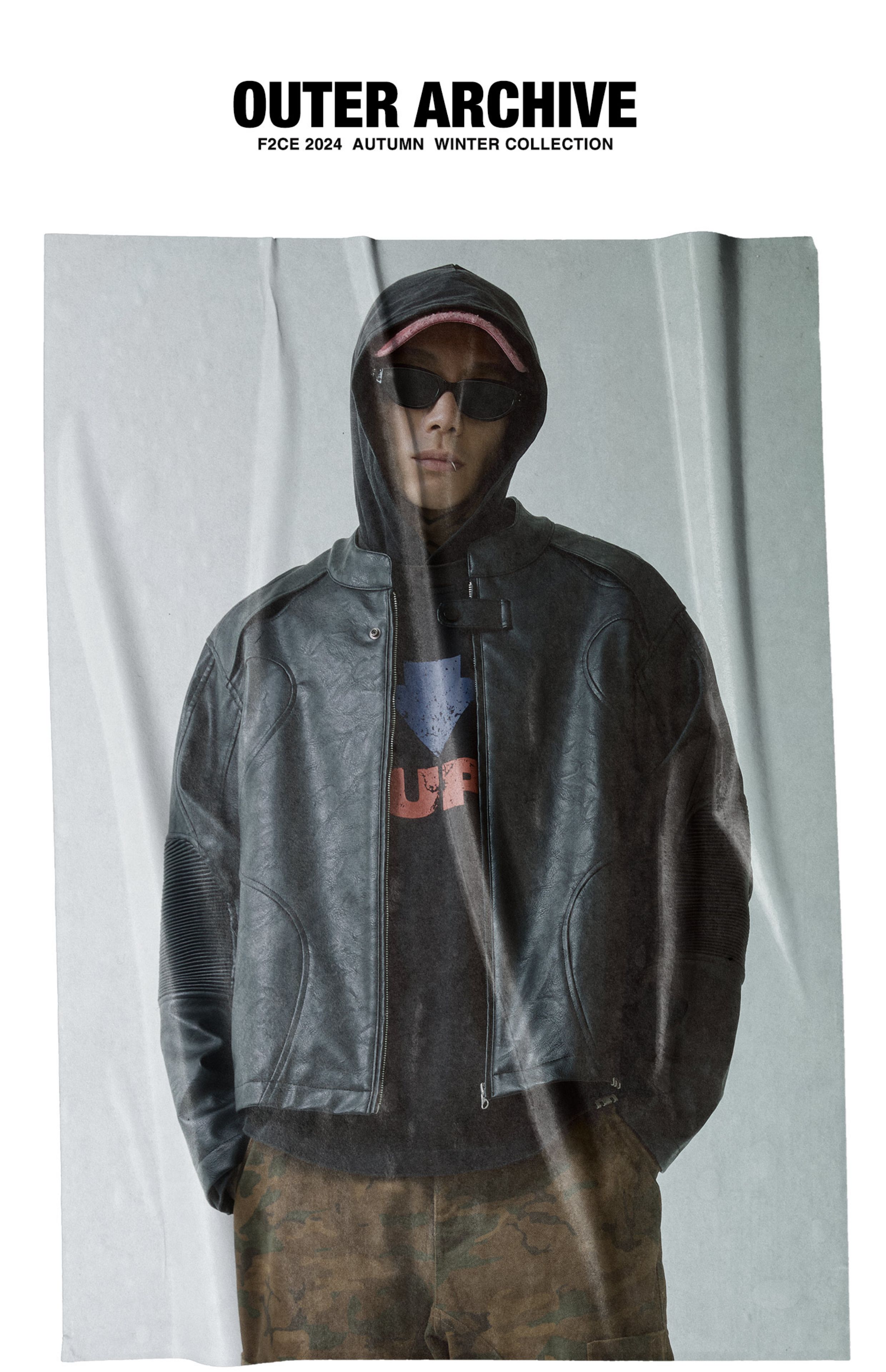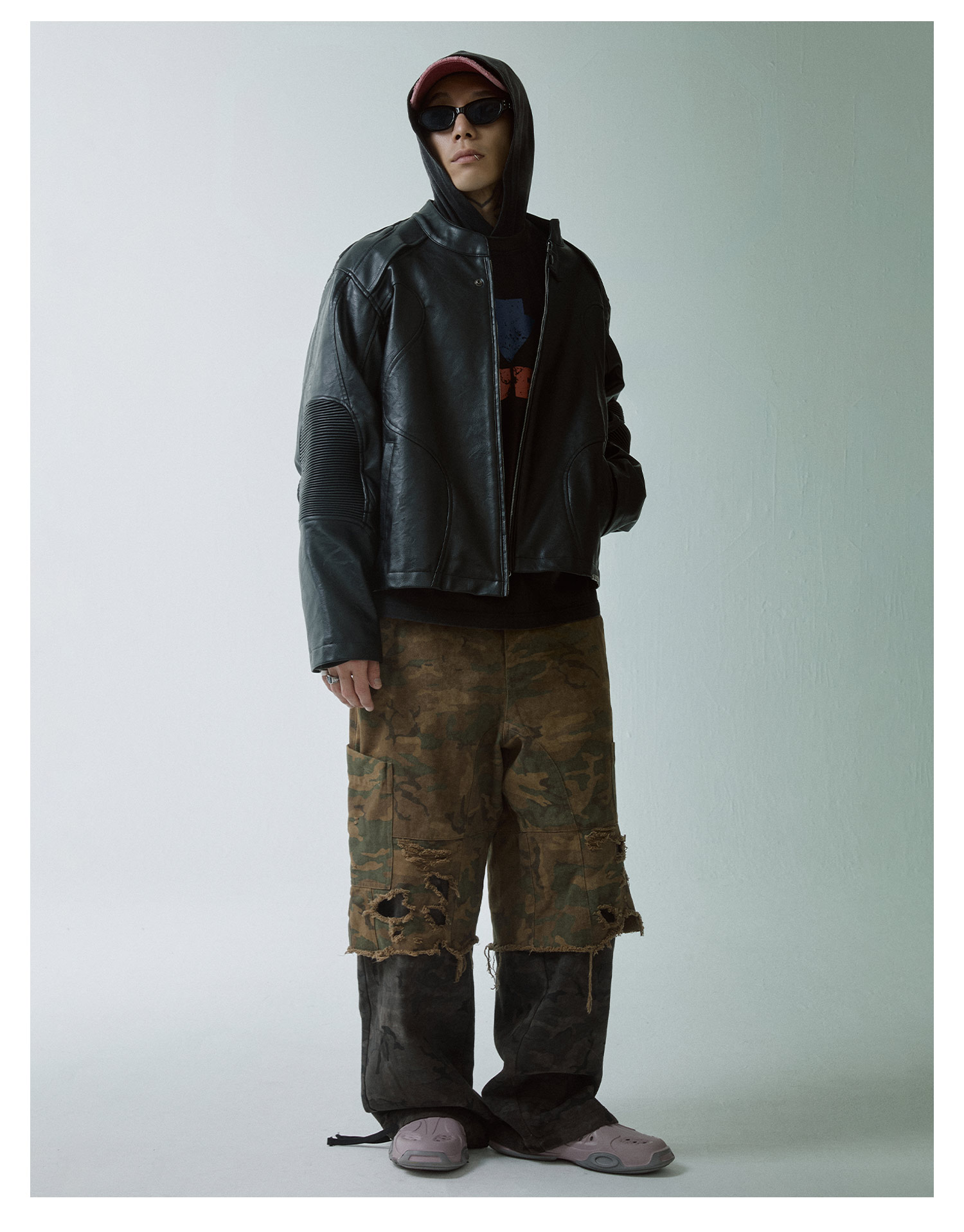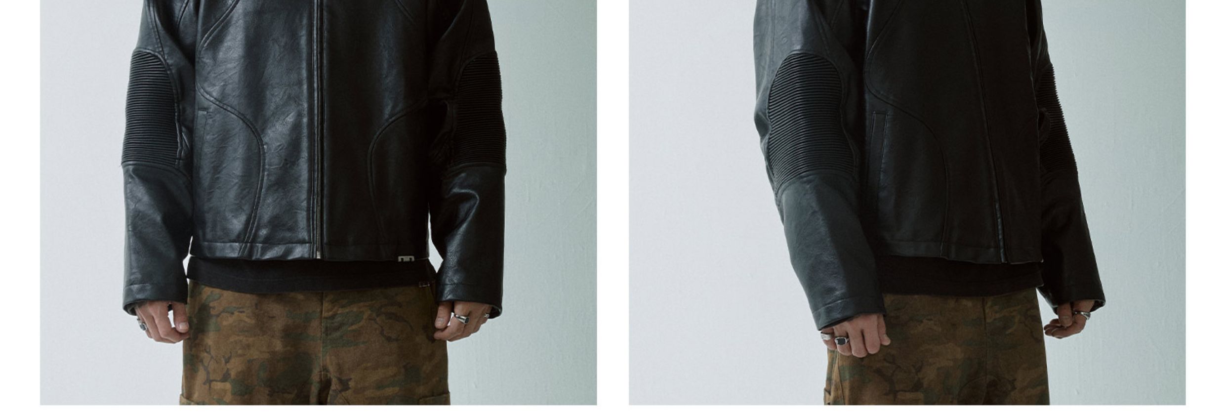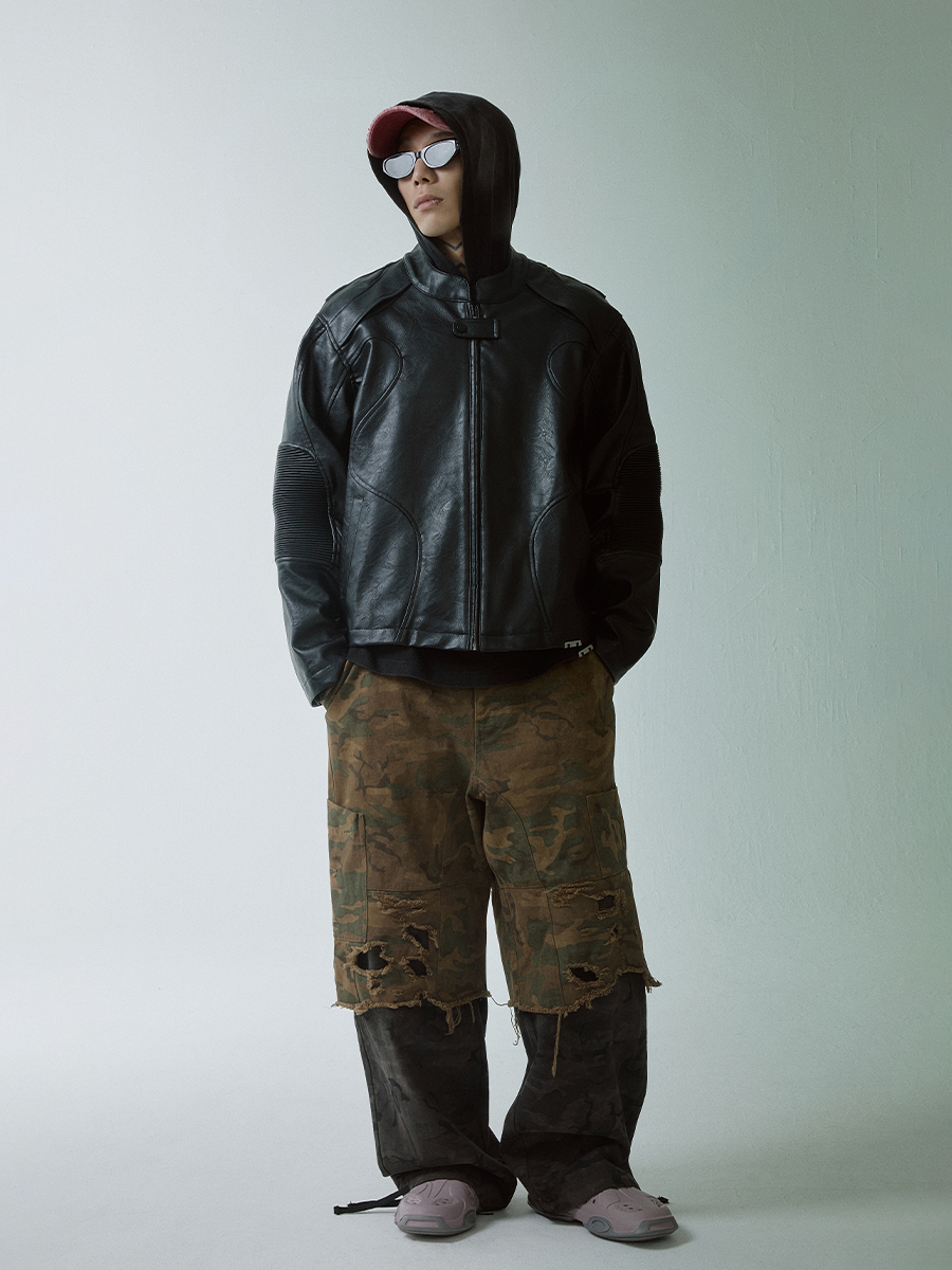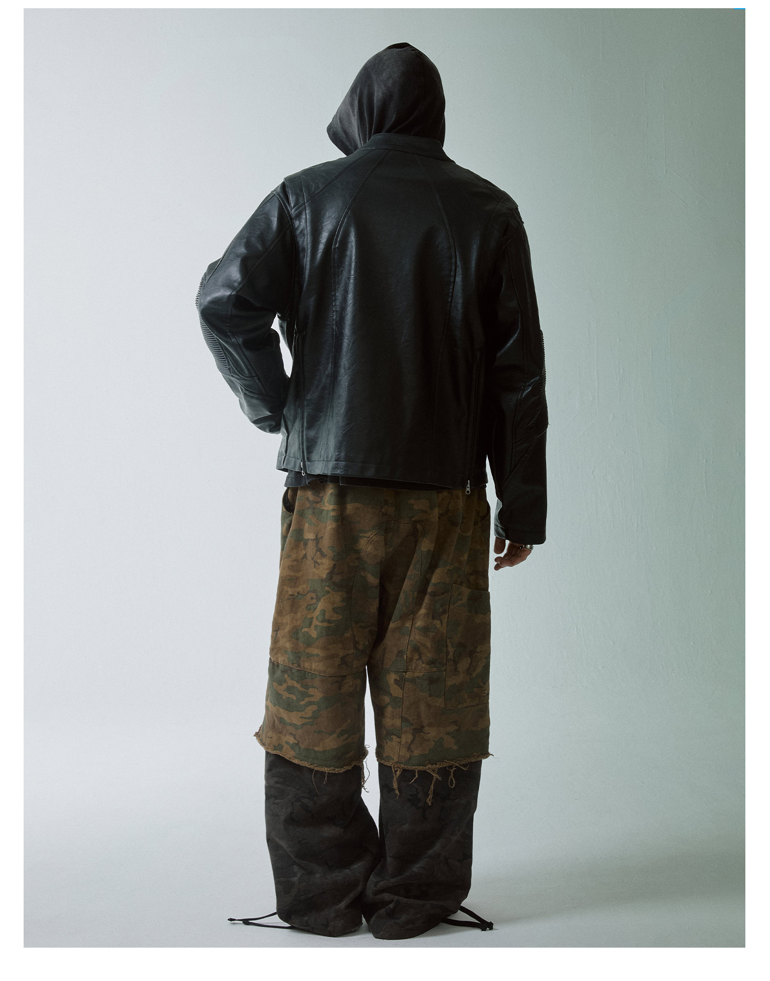 Deconstructed Patchwork Heavyweight High-Neck PU Leather Jacket WN12170