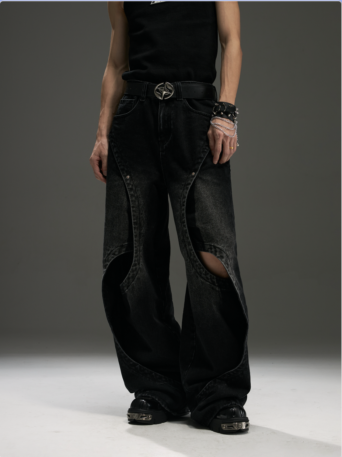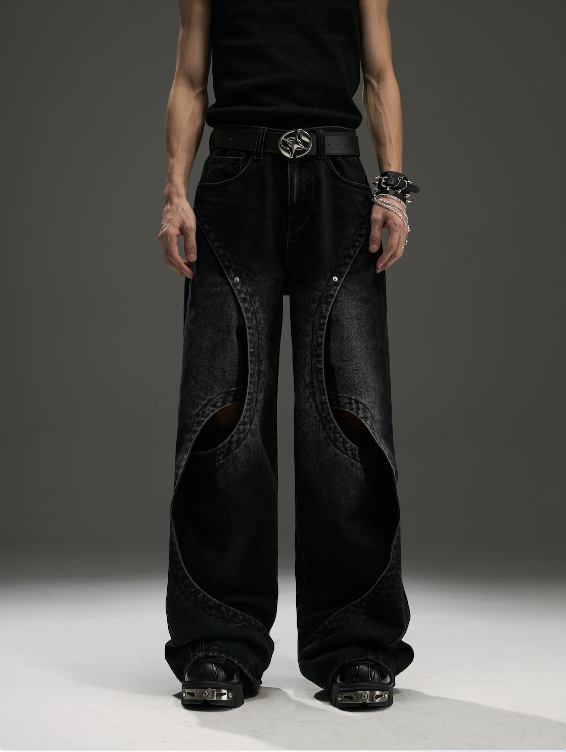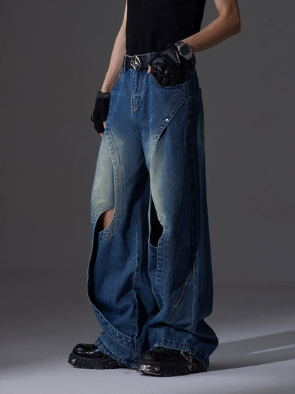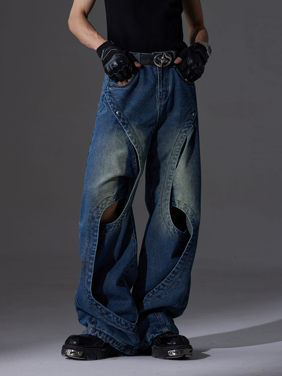 Ribbon Patchwork Washed Wide-leg Denim Jeans WN13432