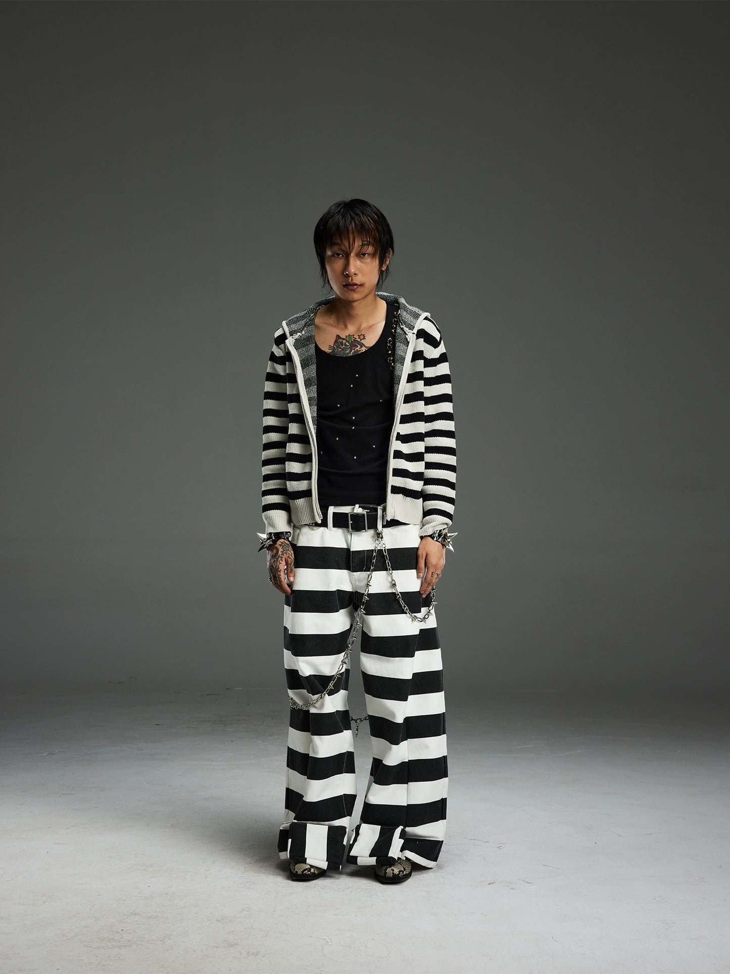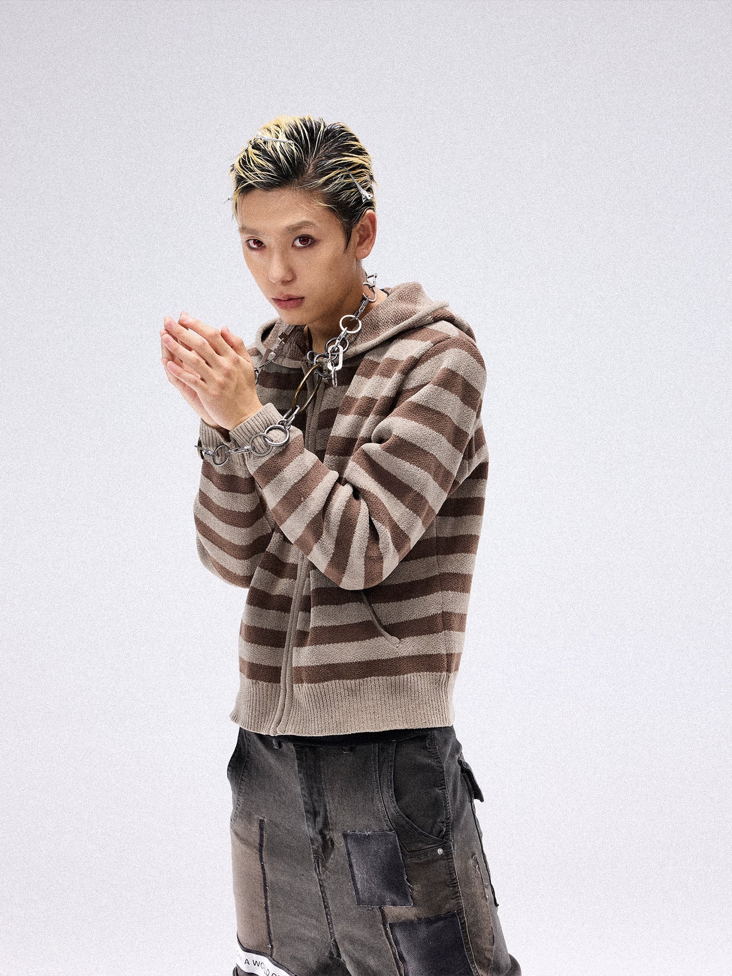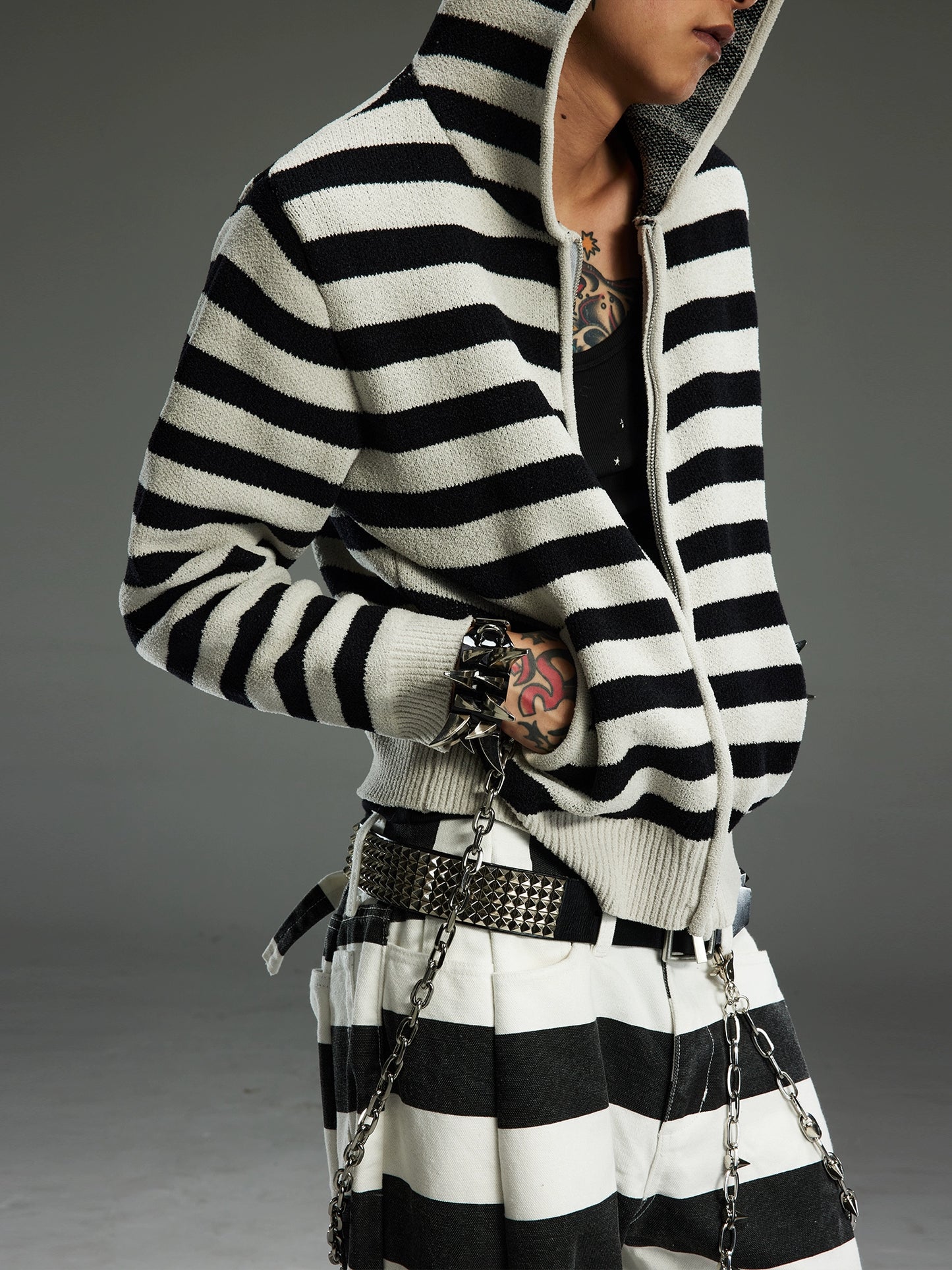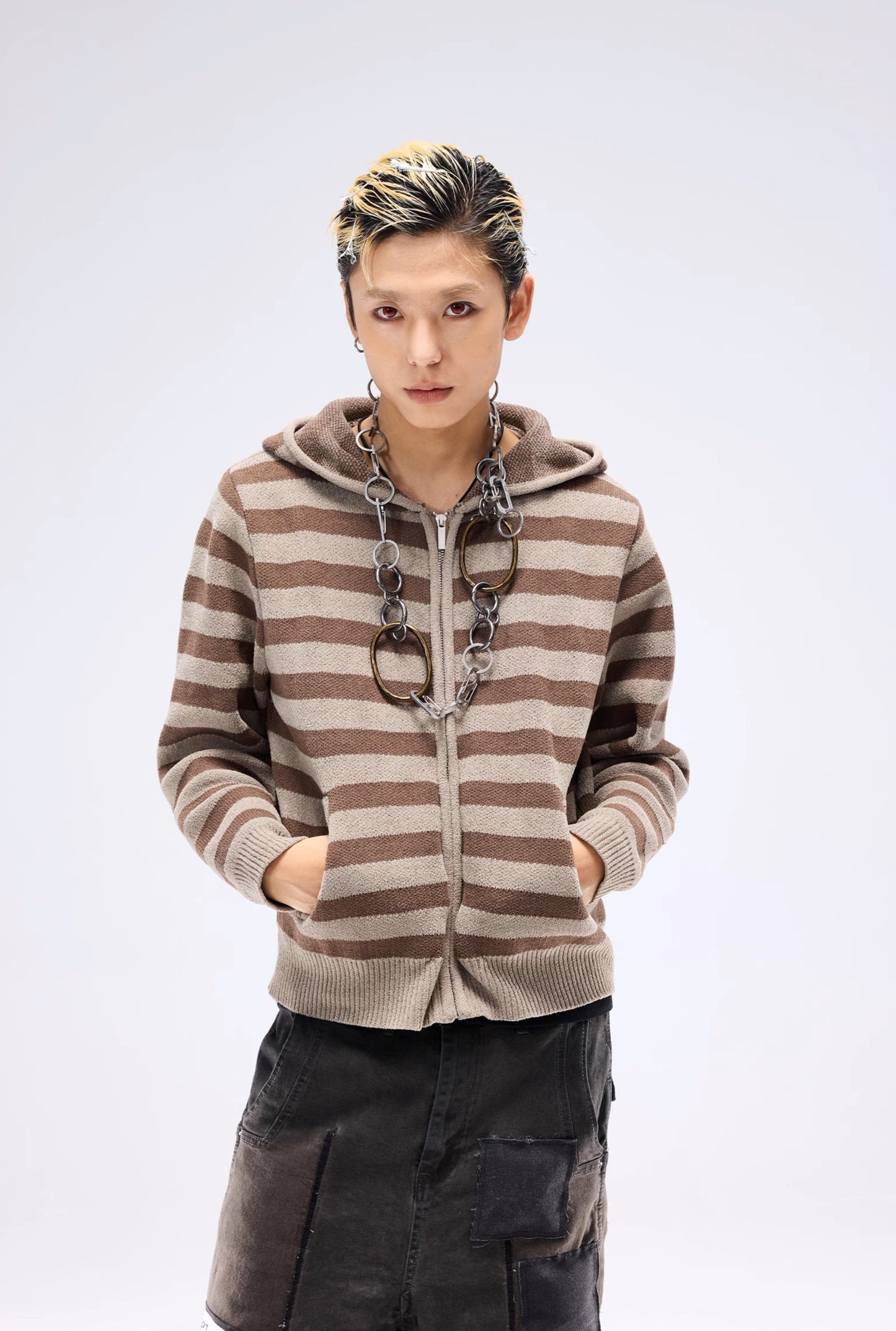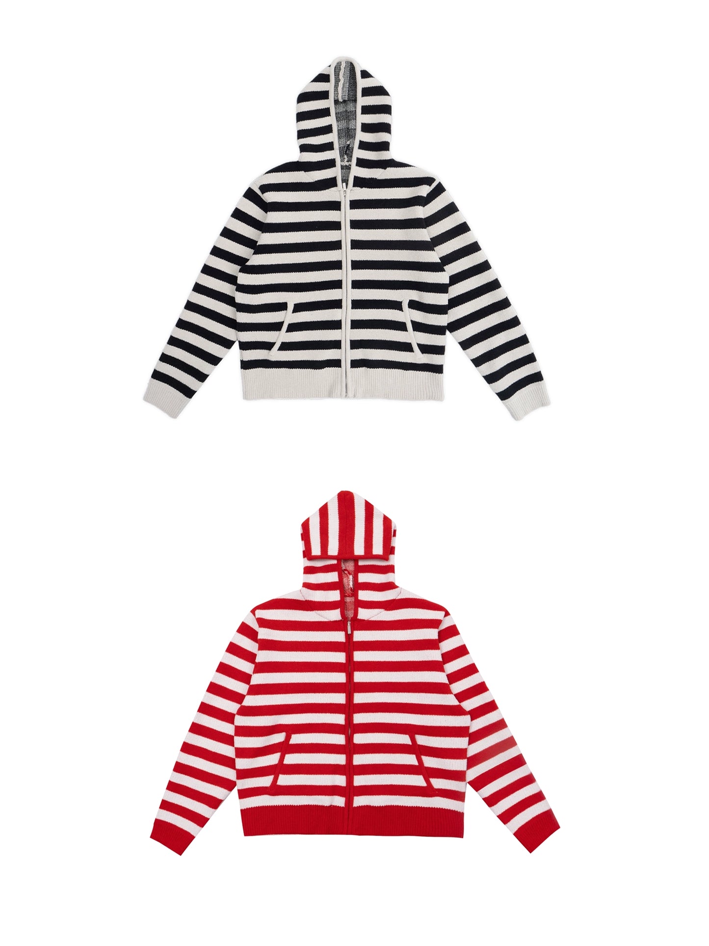 Stripe Knit Short Hooded Zipper Cardigan WN13691