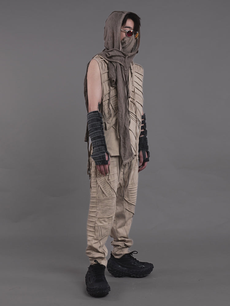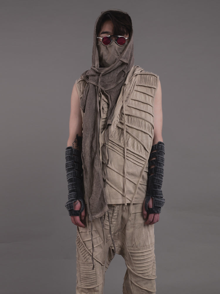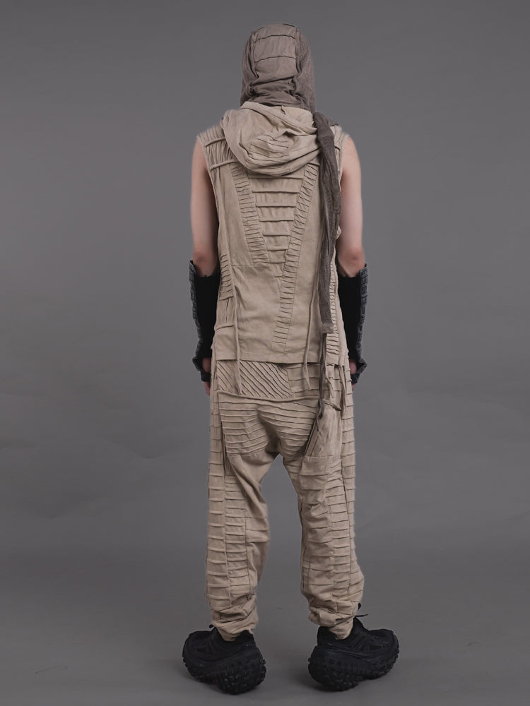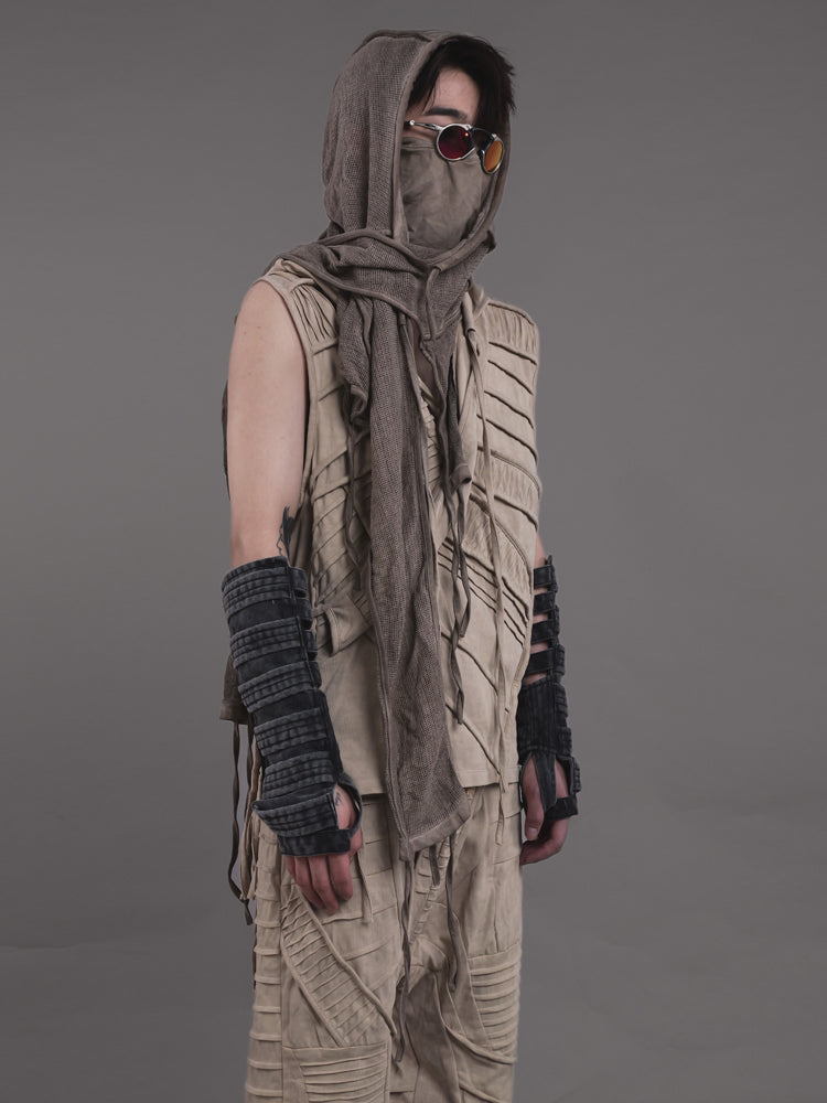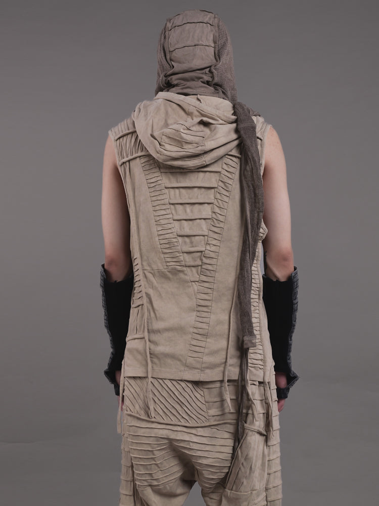 Wax-Dyed Washed Pleats Asymmetrical Hooded Vest WN13991