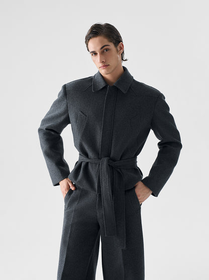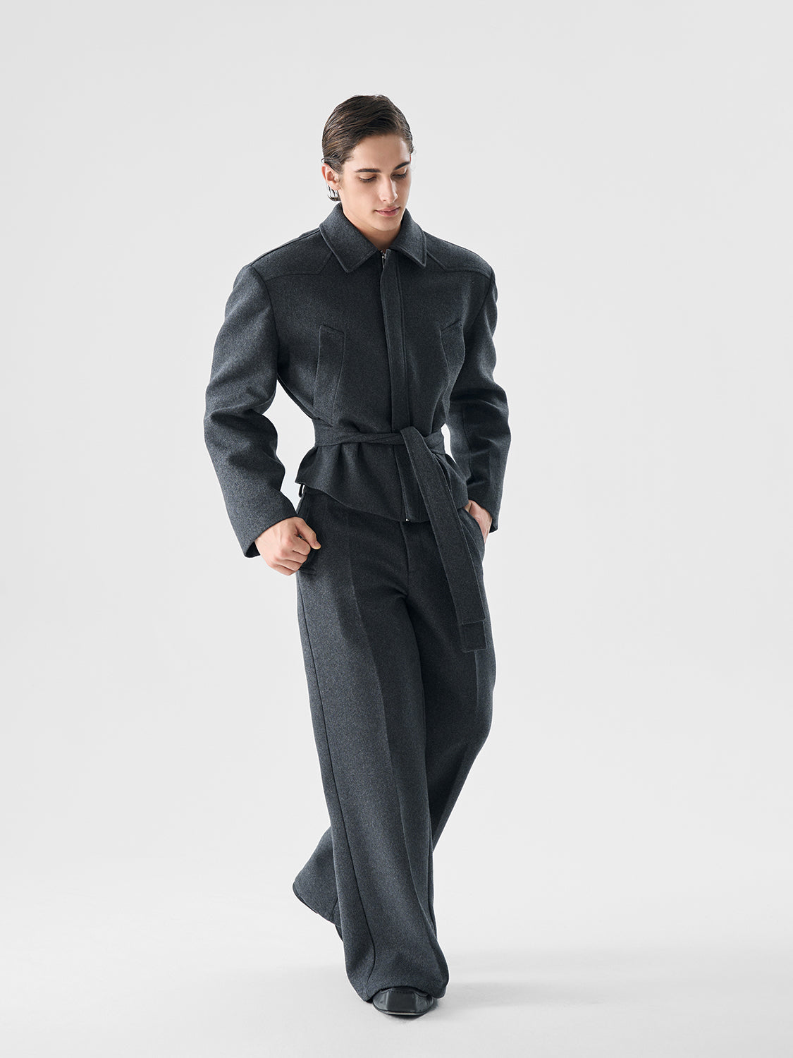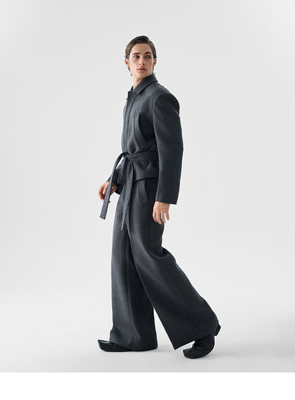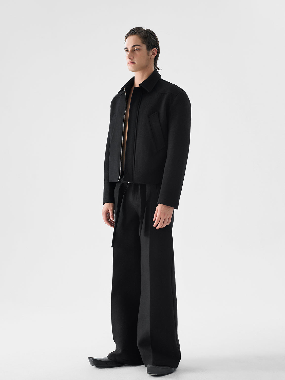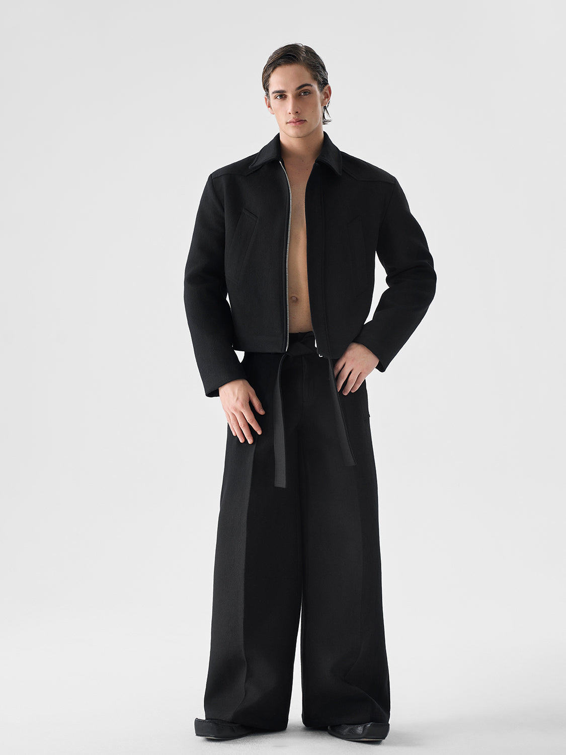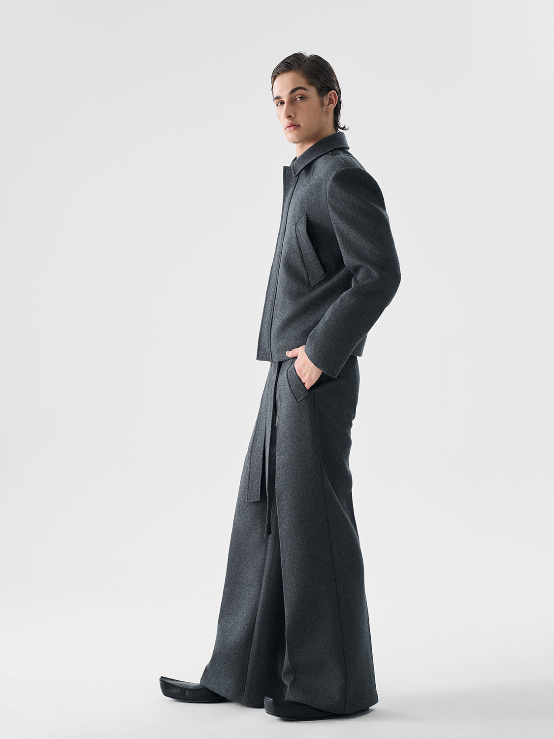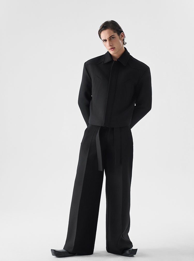 Wool Blend Shoulder-Pad Short Zipper Jacket & Trousers Setup WN15183