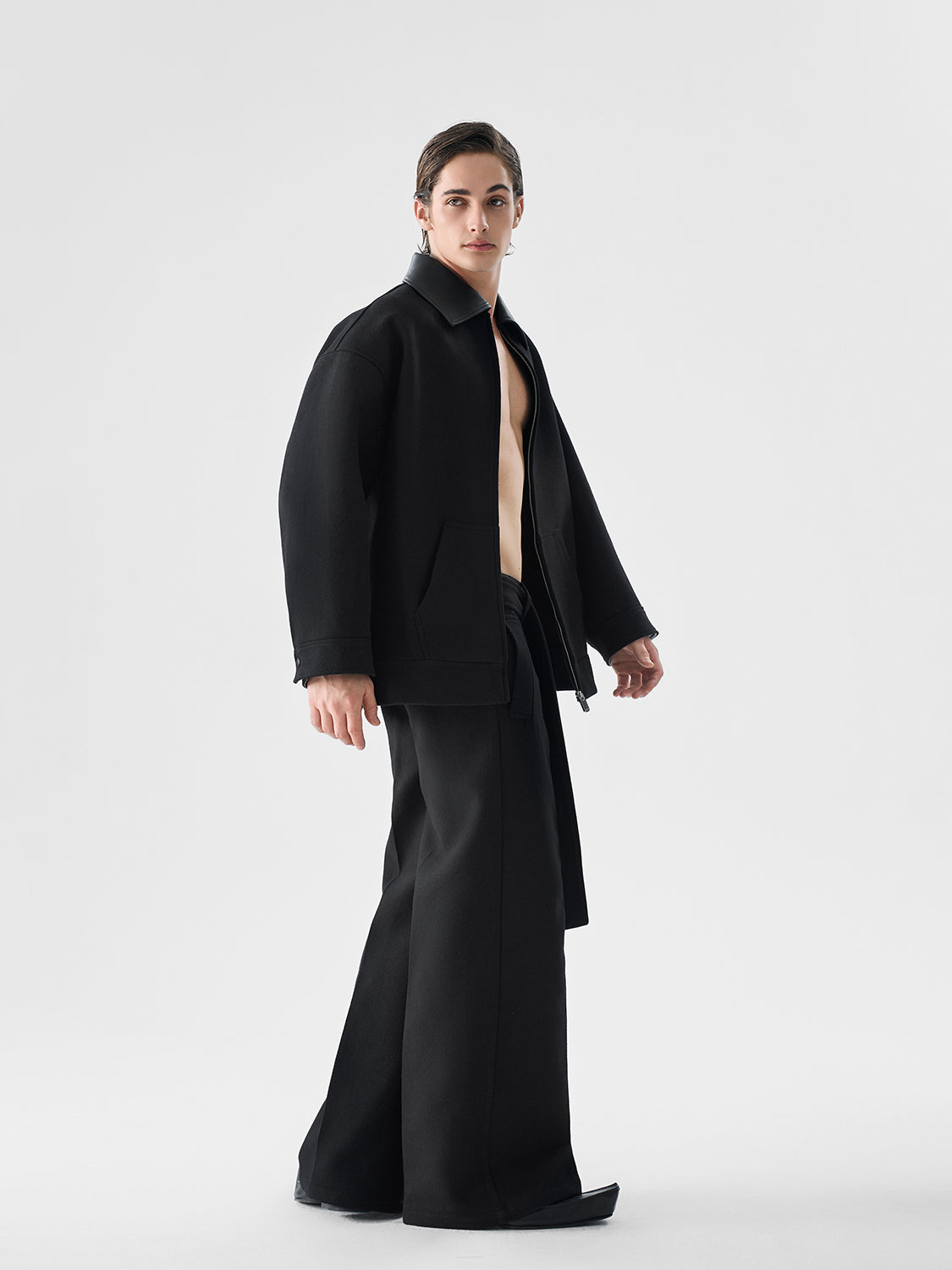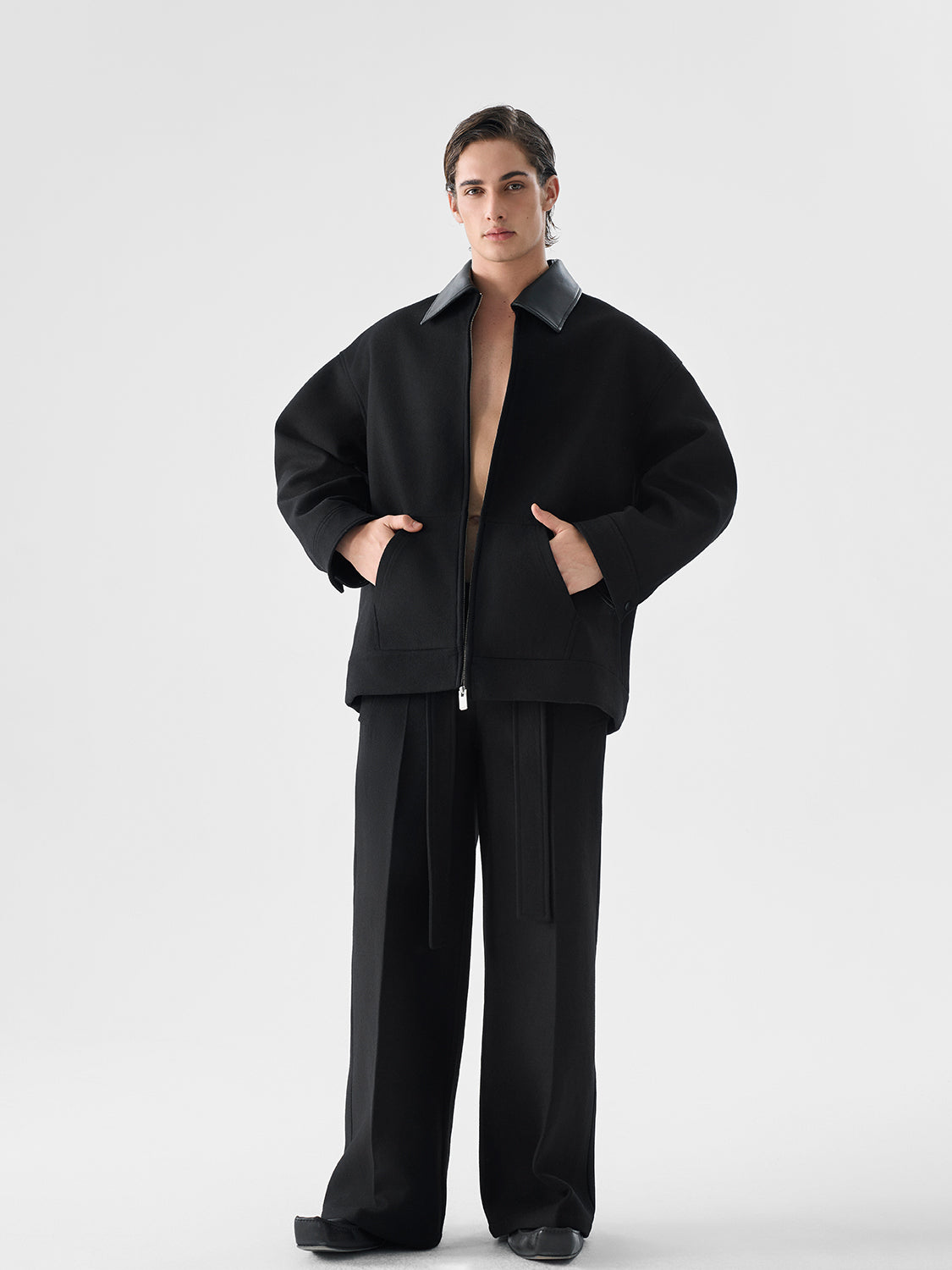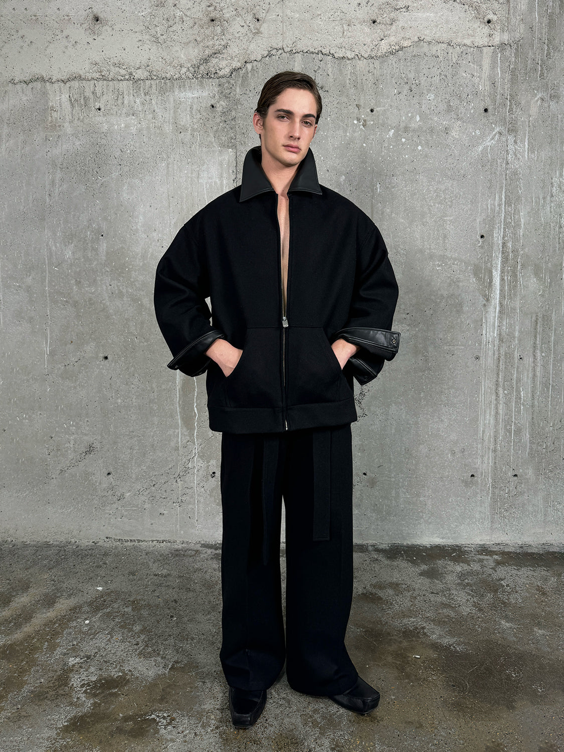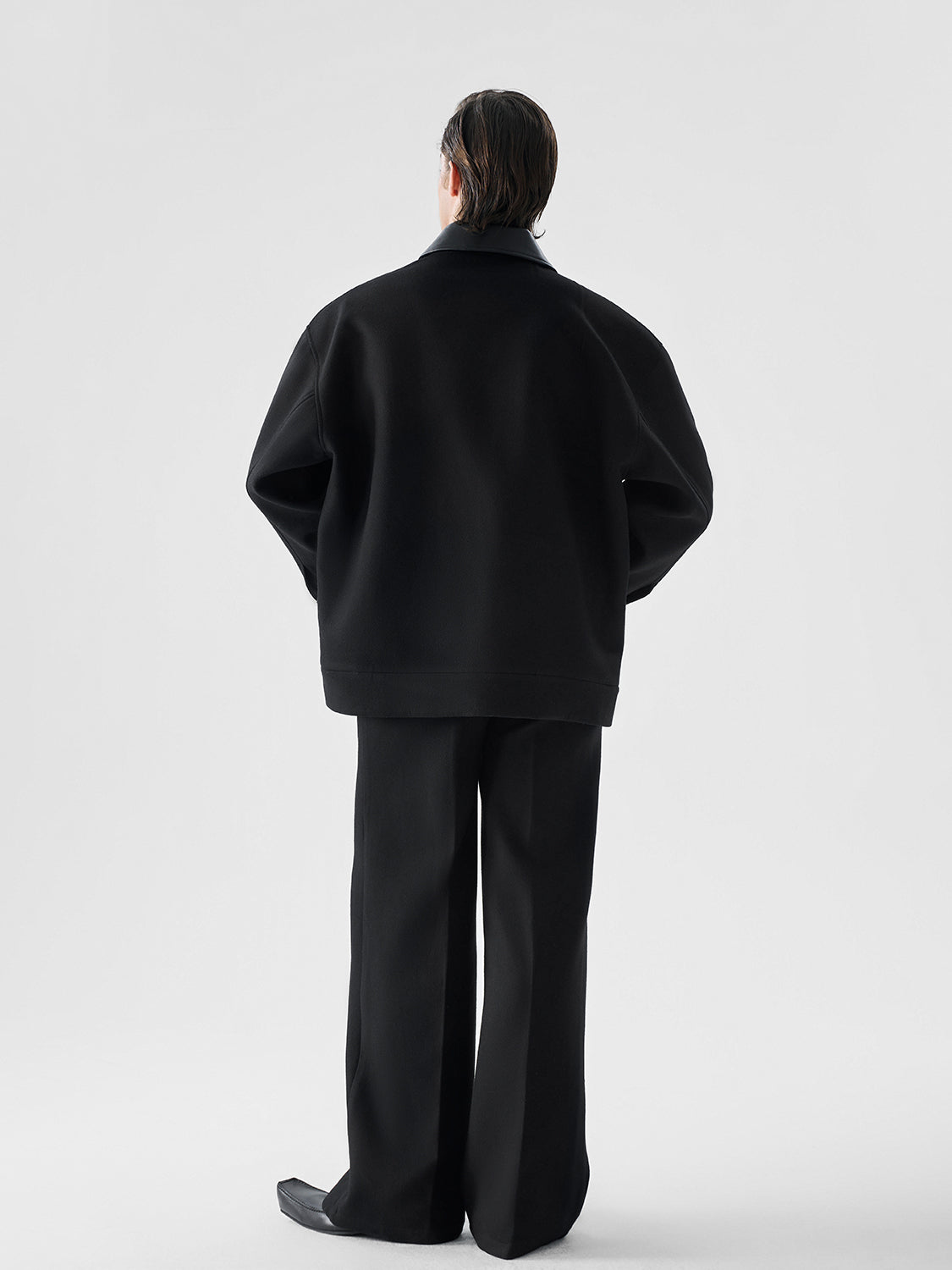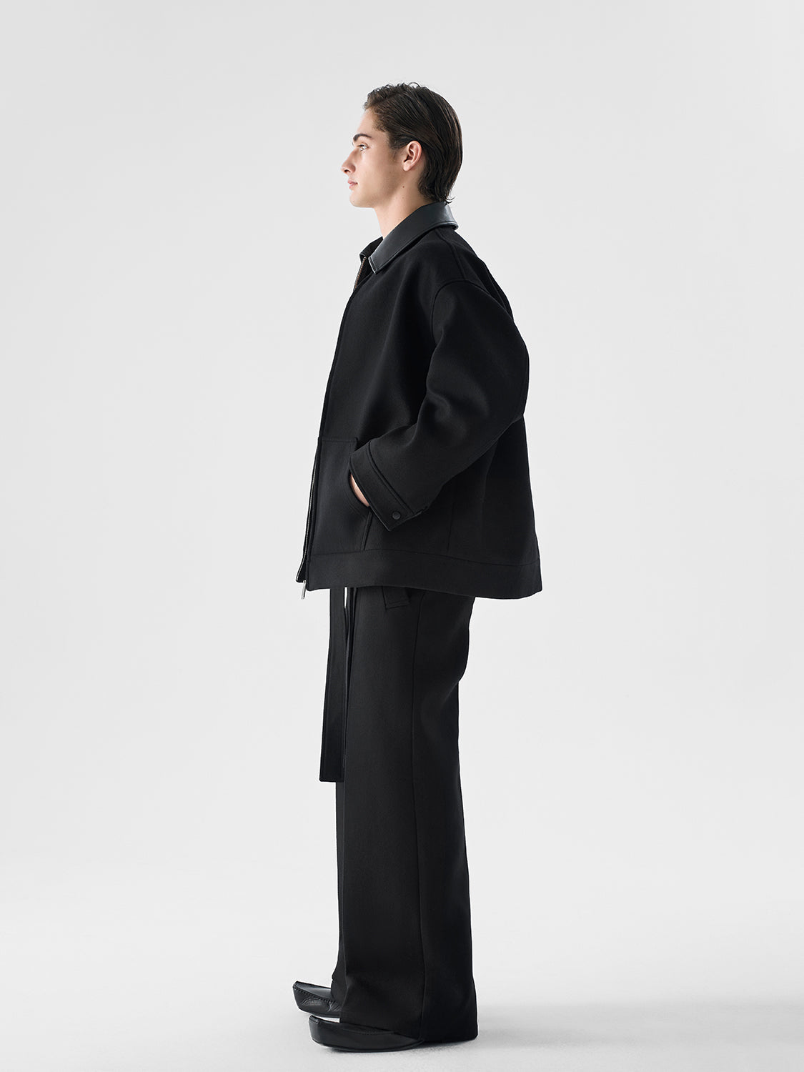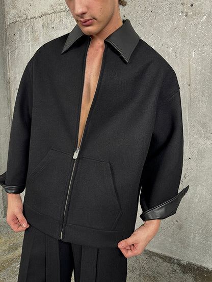 PU Leather Collar Wool Blend Zipper Jacket WN15185