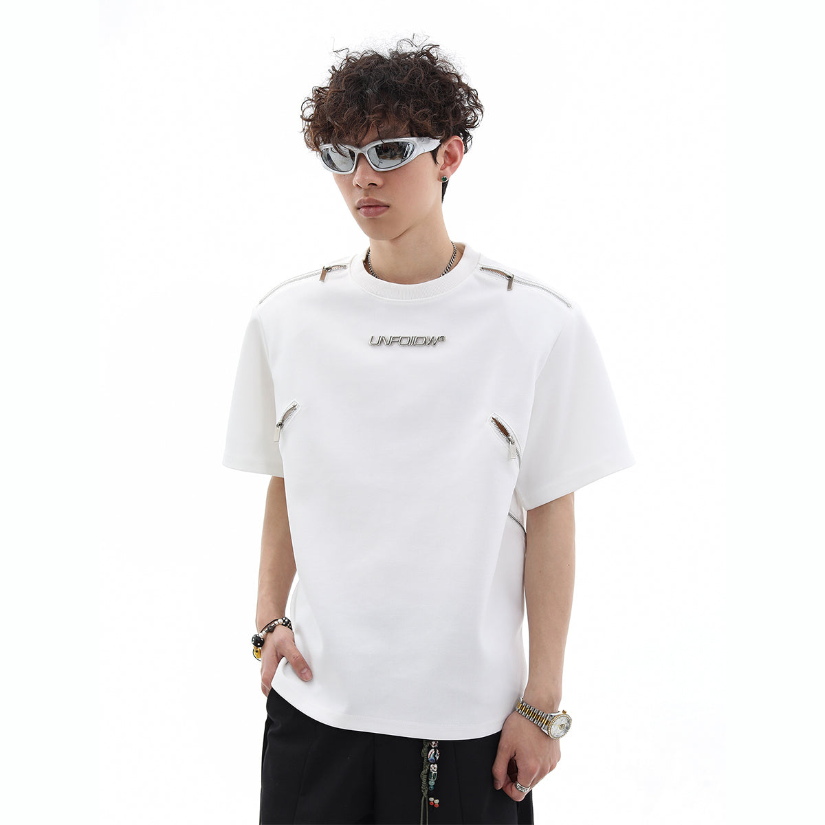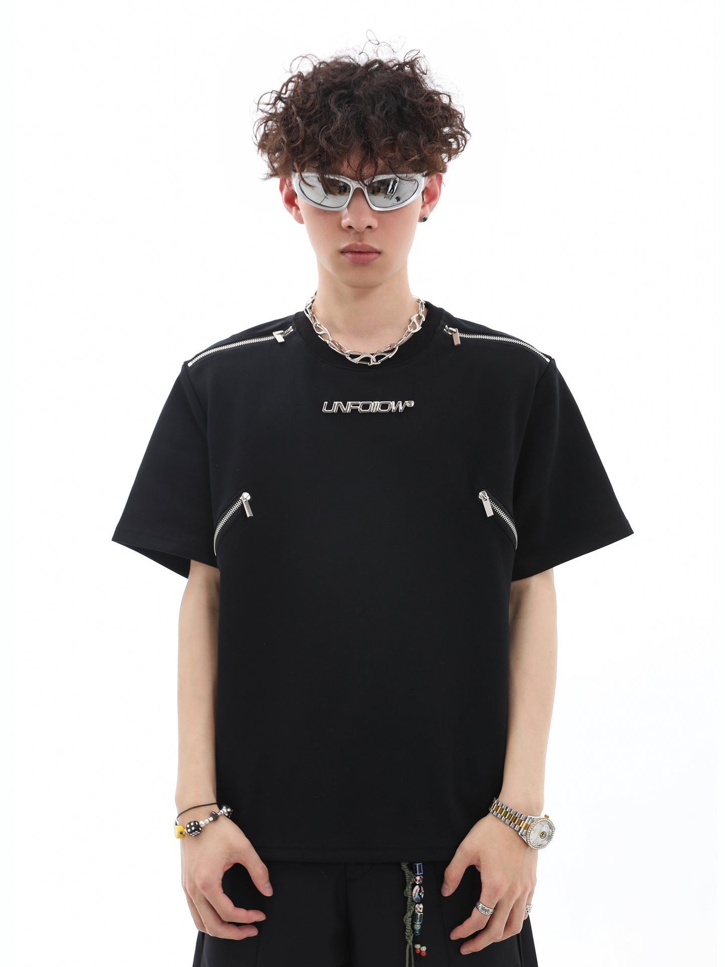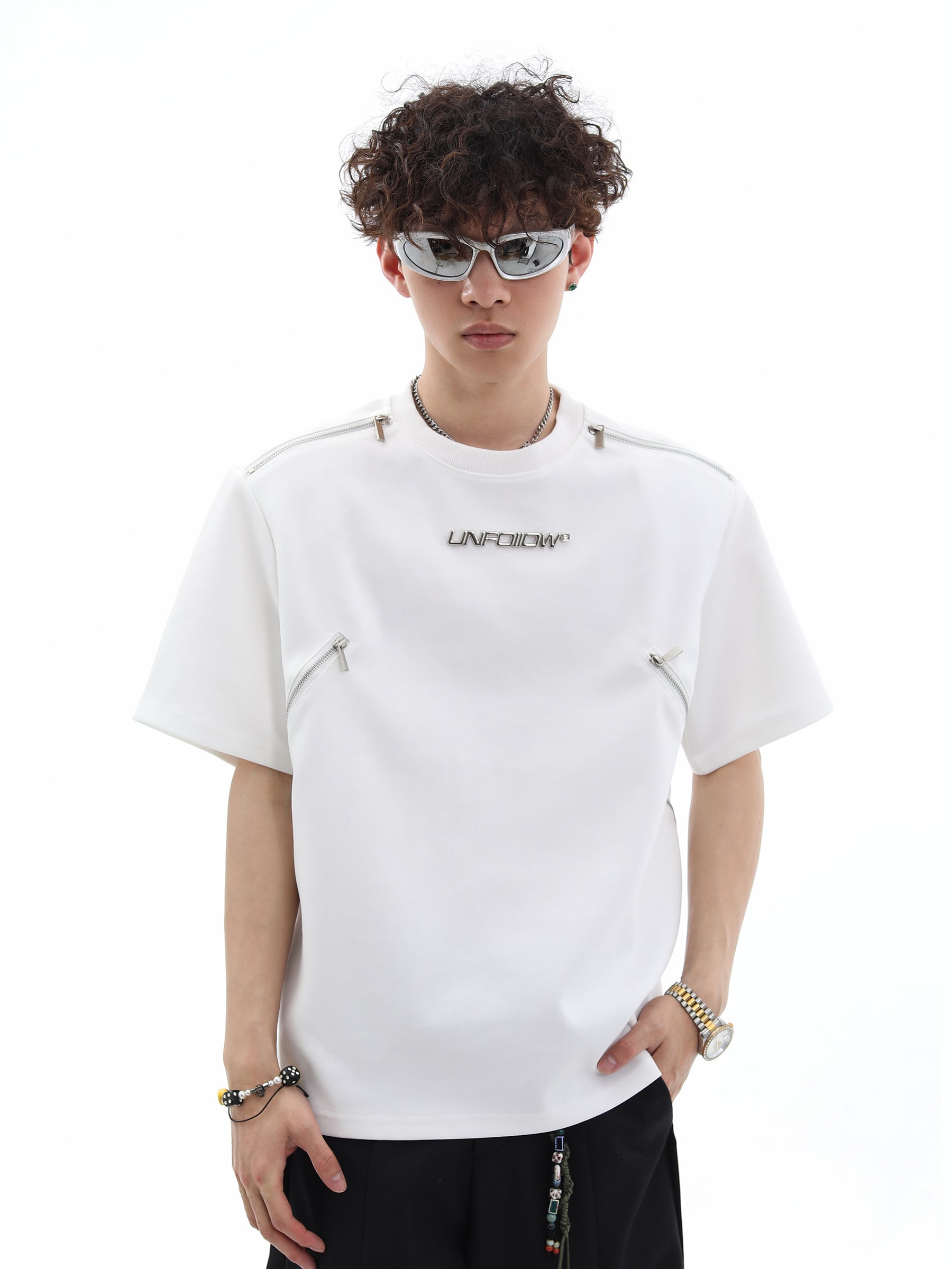 Metal Logo Multi Zipper Design Short Sleeve T-Shirt WN15664