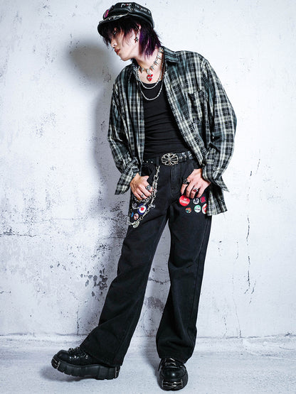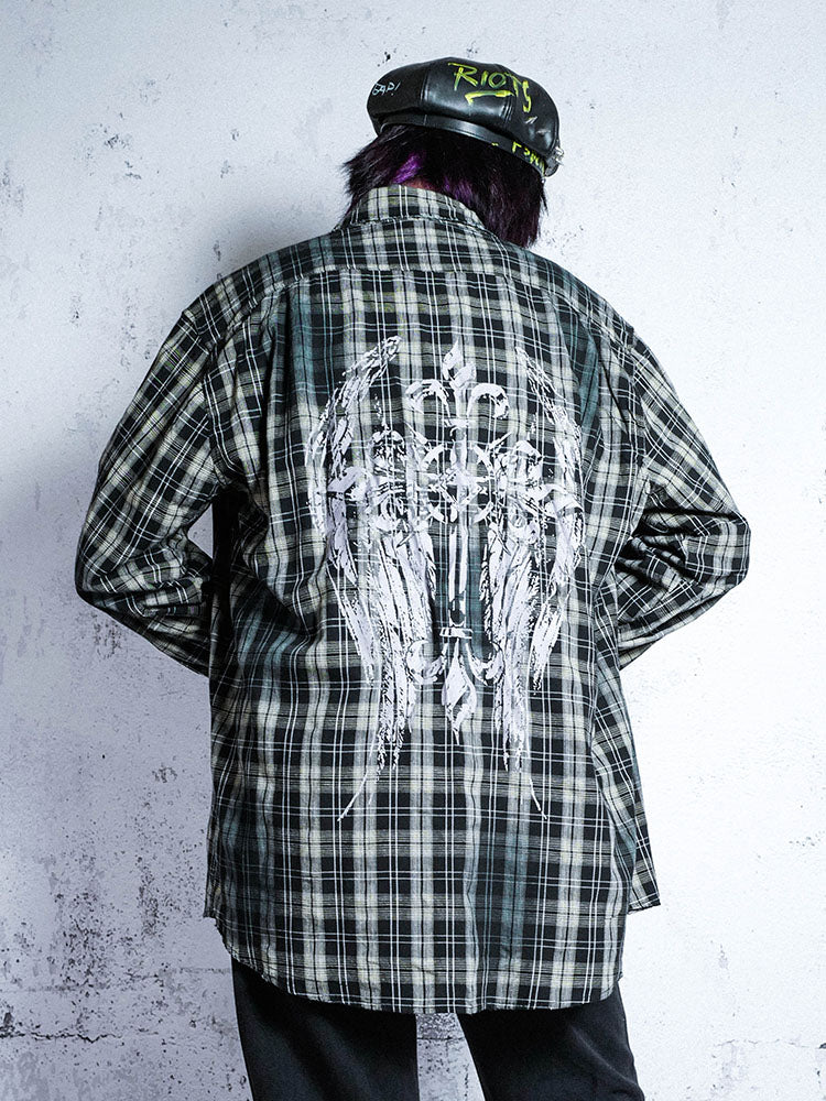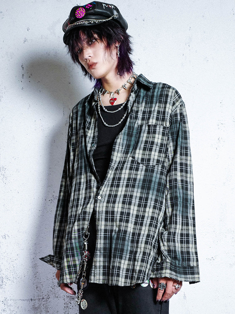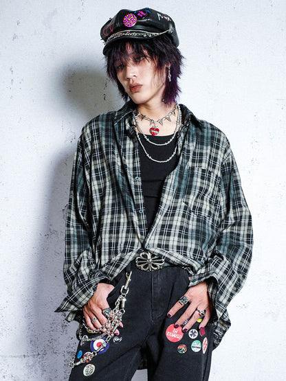 Washed Graphic Design Plaid Long Sleeve Shirt WN16002