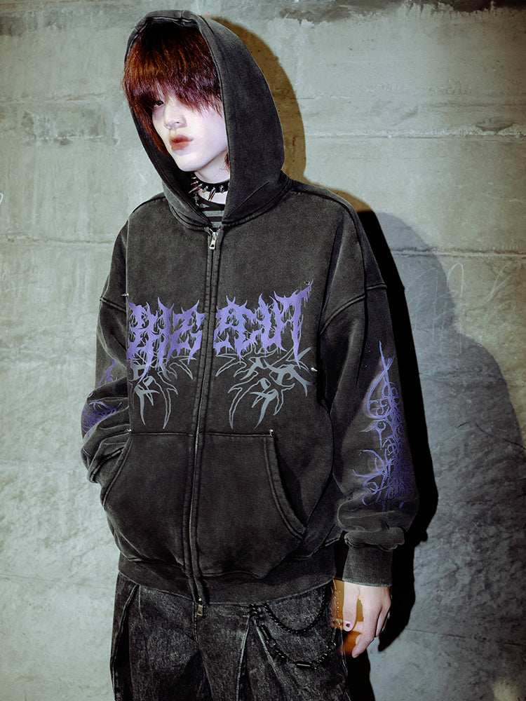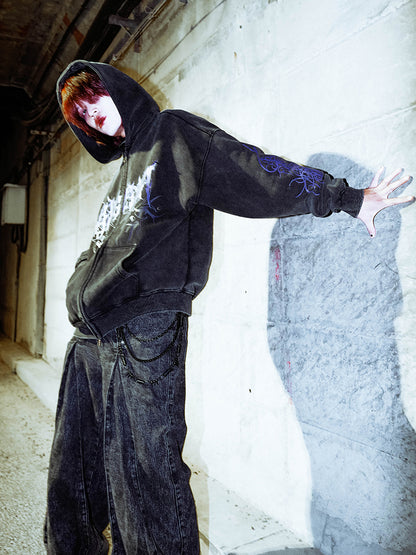 Studs Detail Washed Fleece Lining Zipper Hoodie WN16035