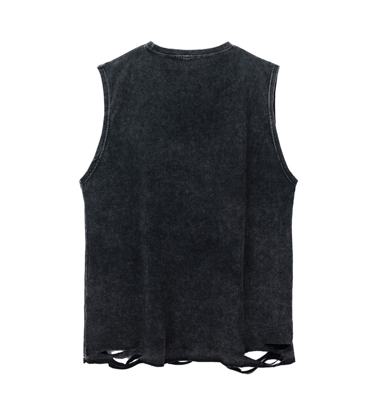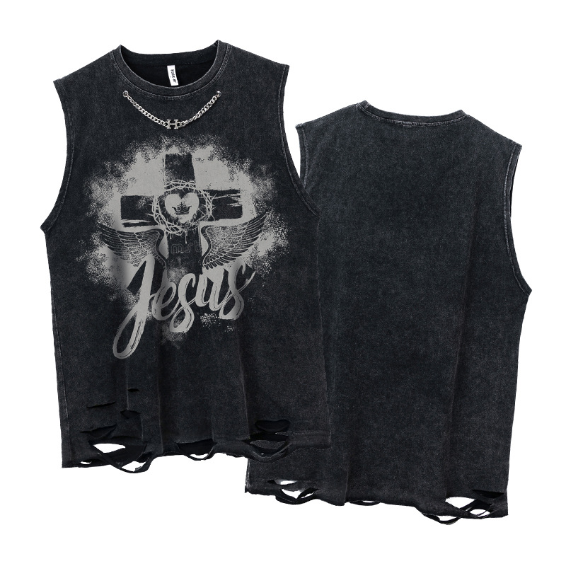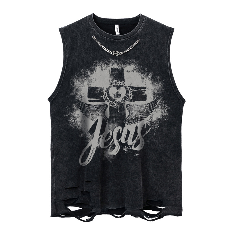 Wide Shoulder Cross & Heart Print Damage Tank Top WN16514
