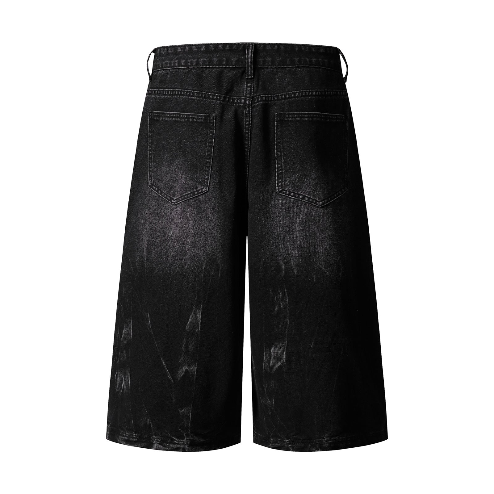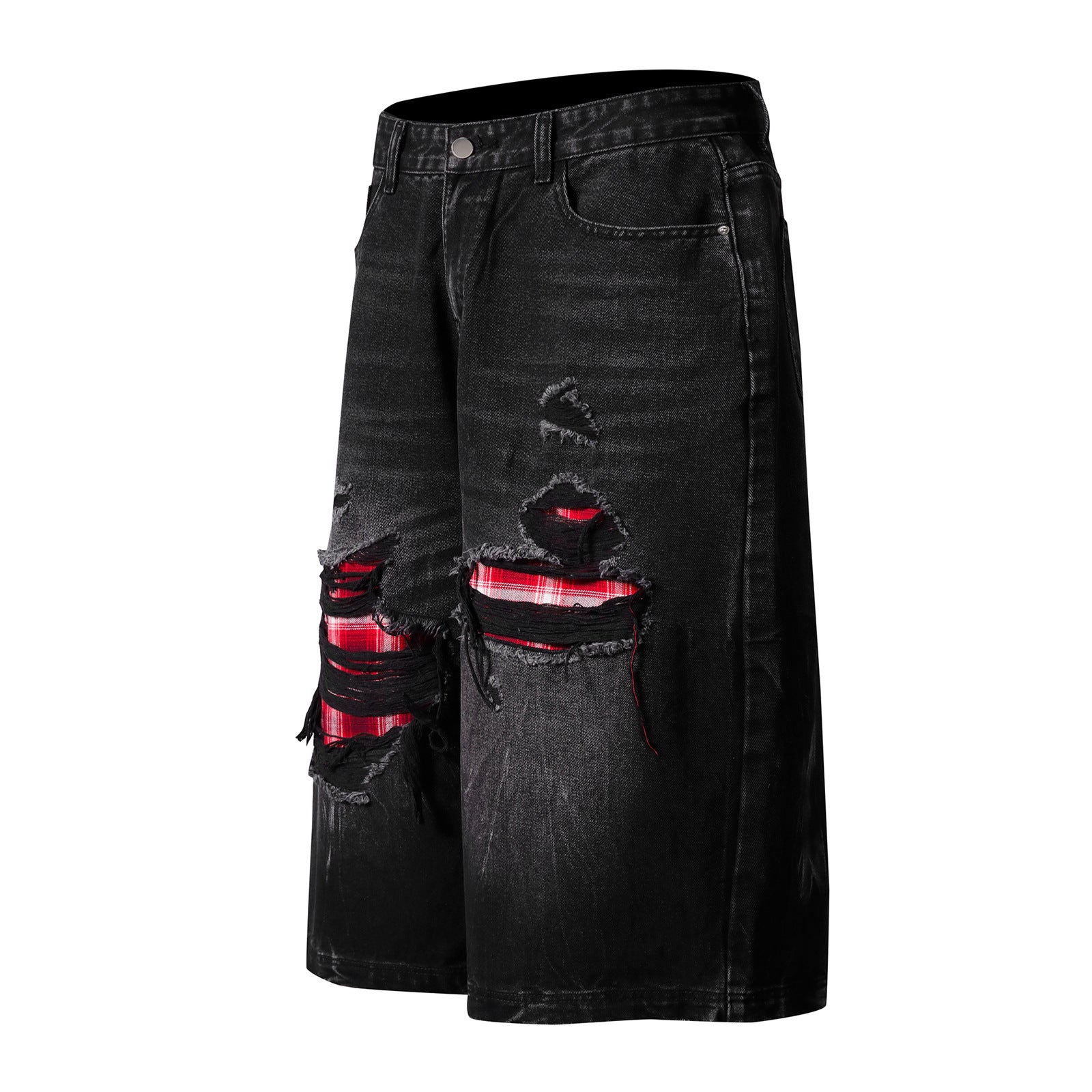 Damage Plaid Design Wide Leg Half Denim Jeans WN16538