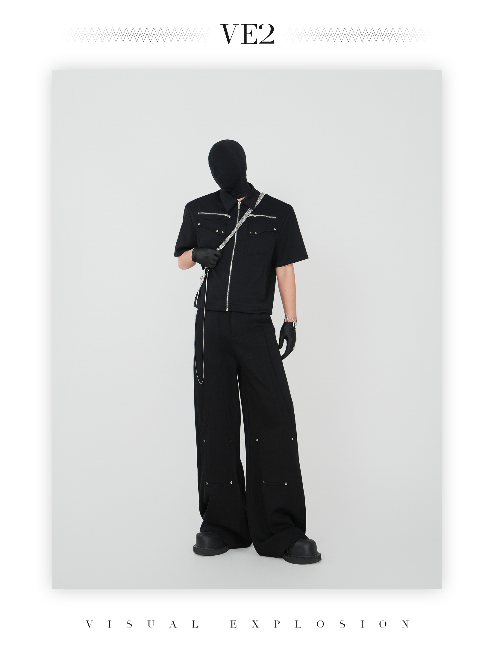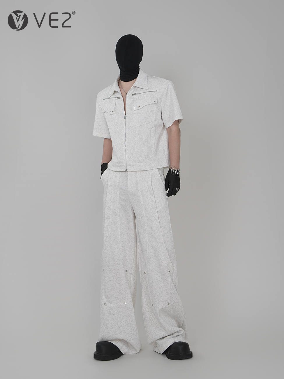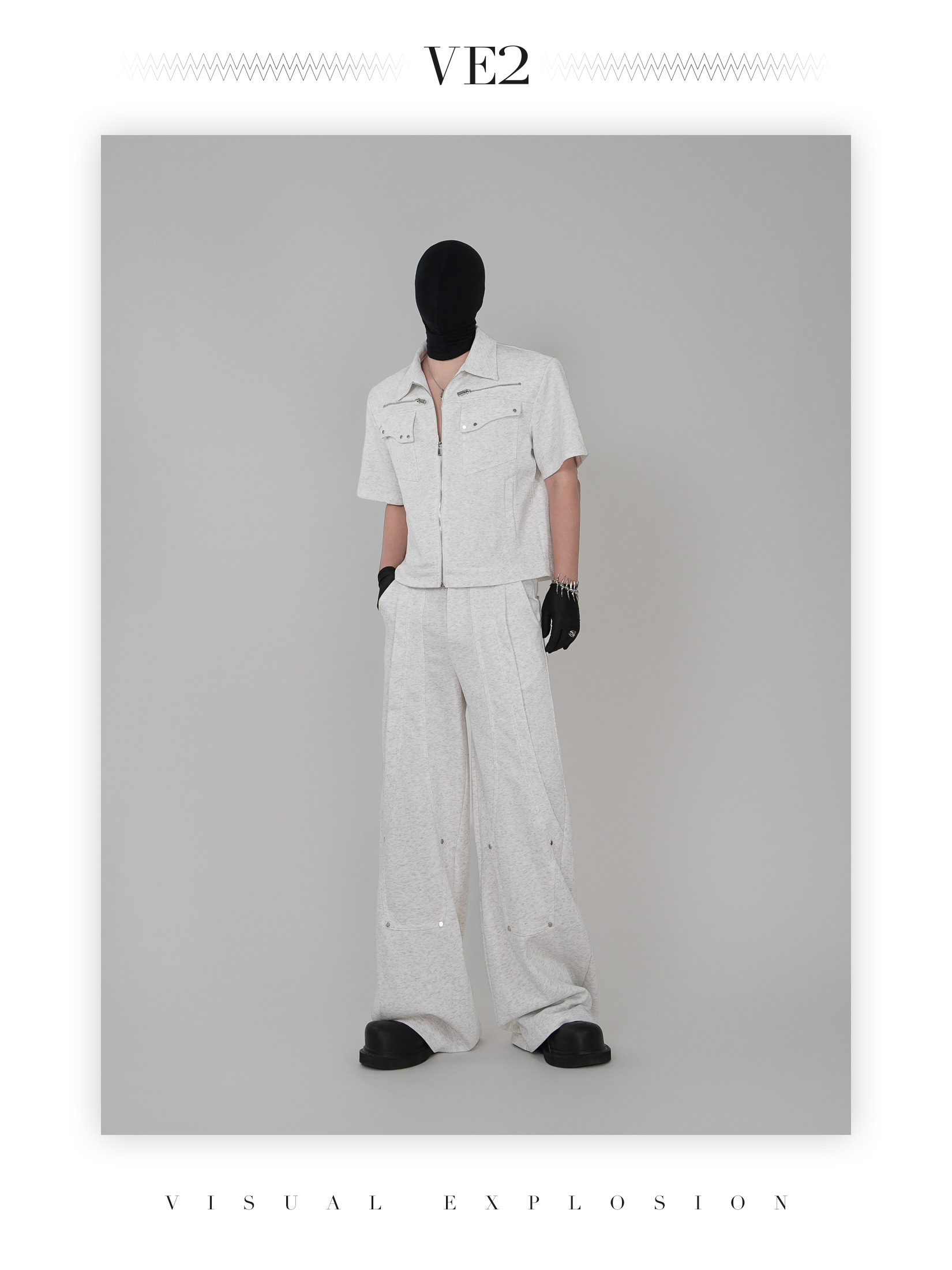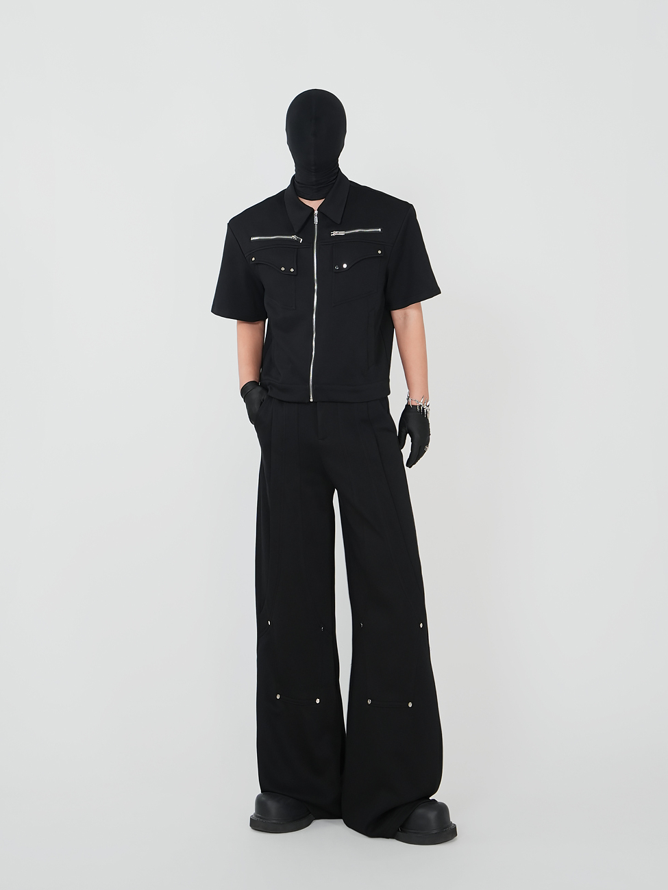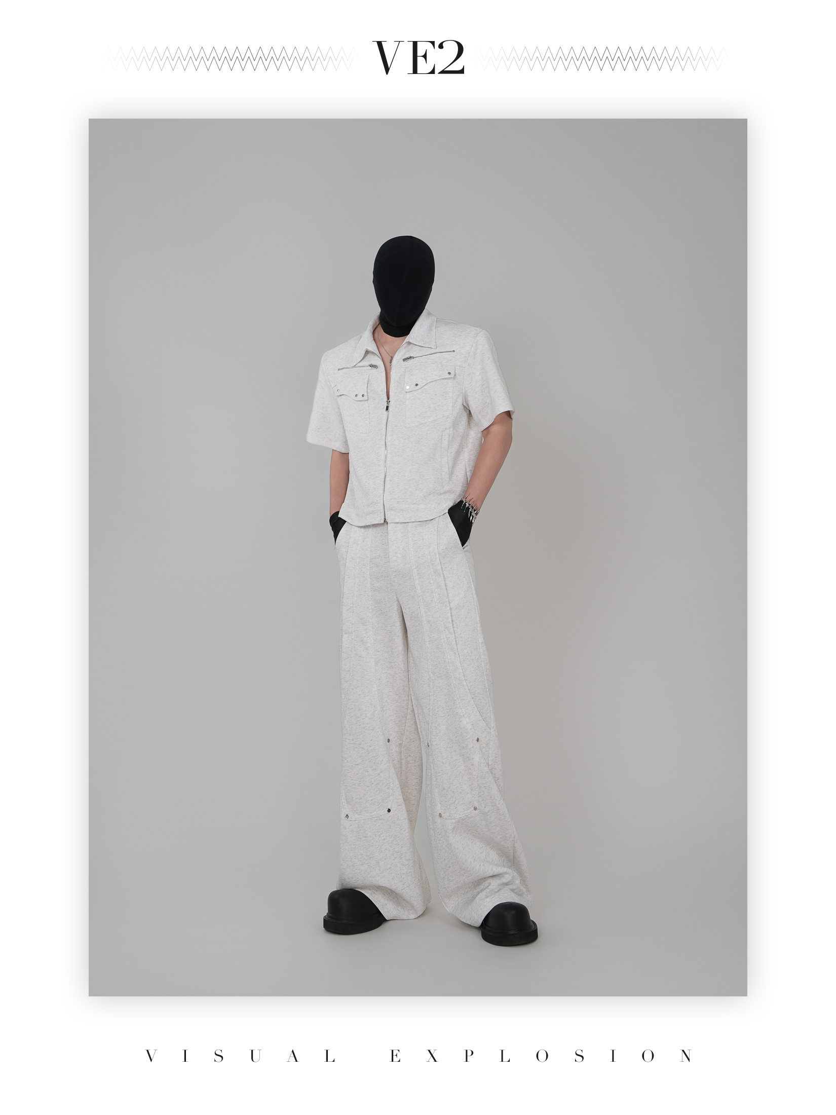 Metal Studs Zipper Jacket & Wide Leg Pants Setup WN17382