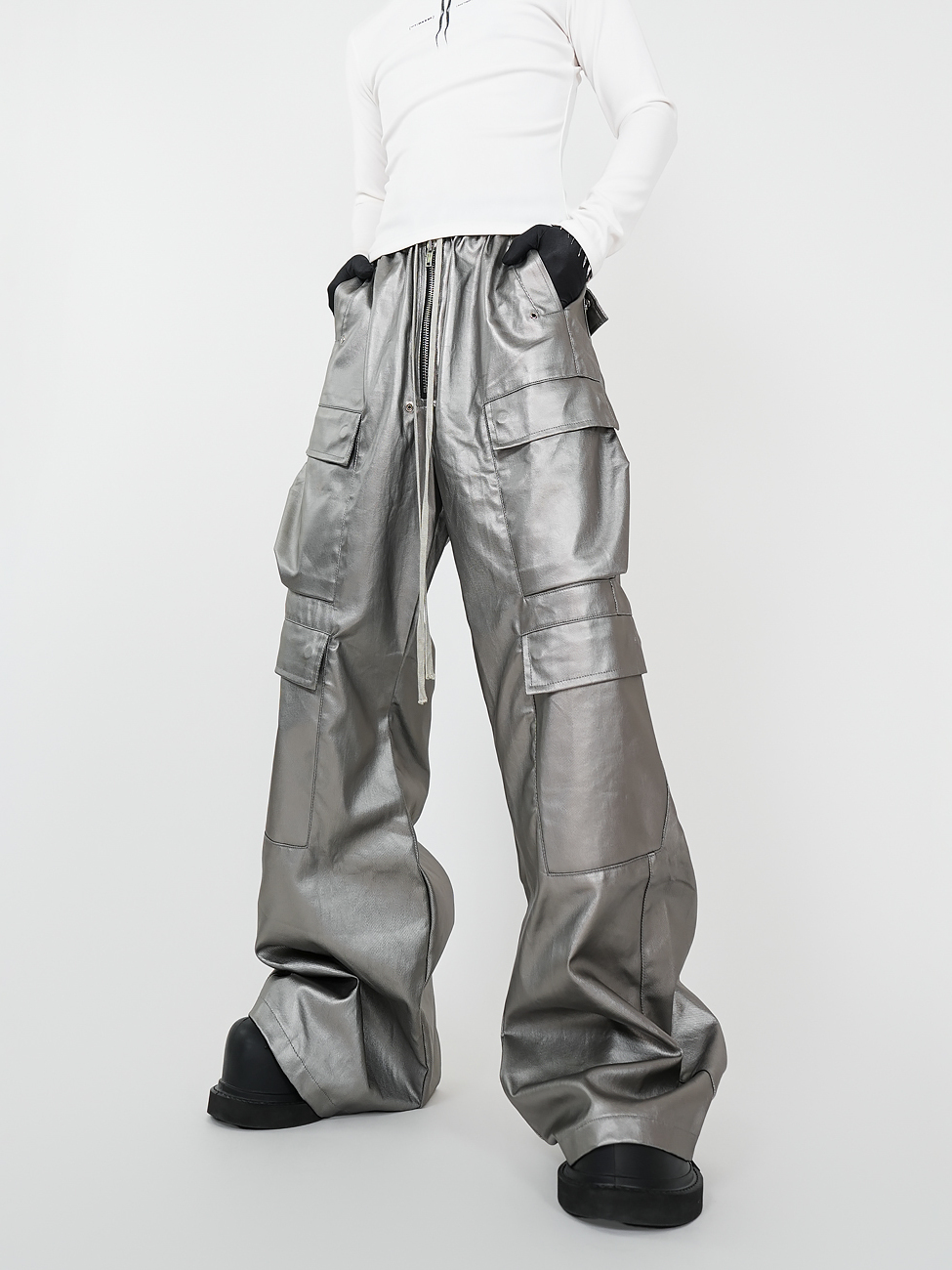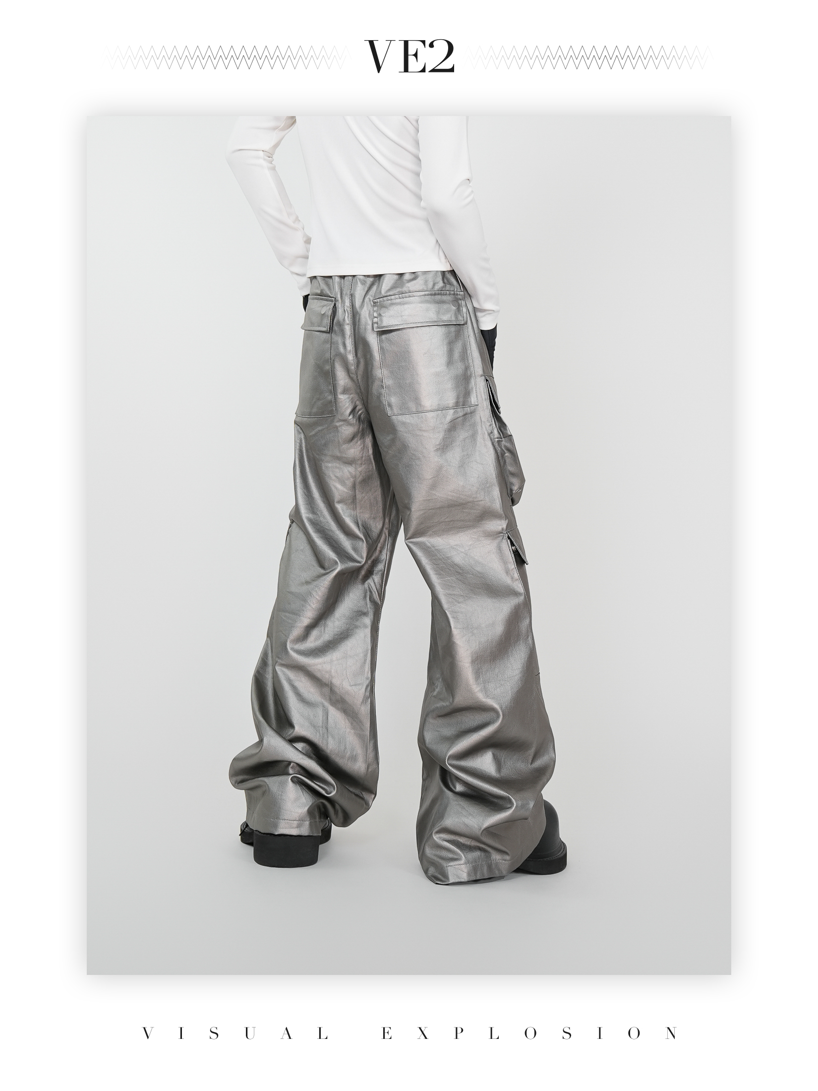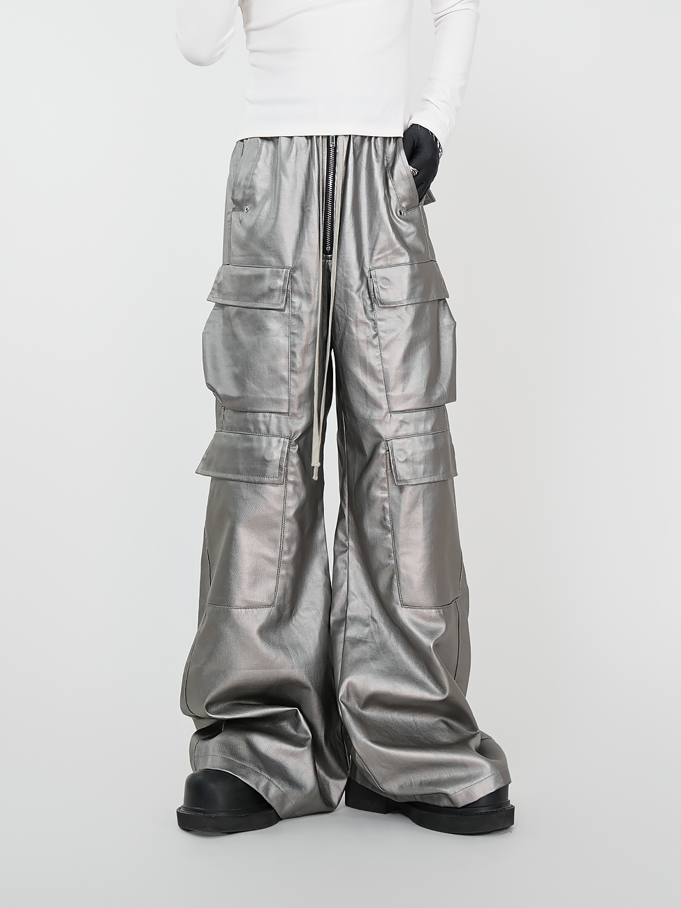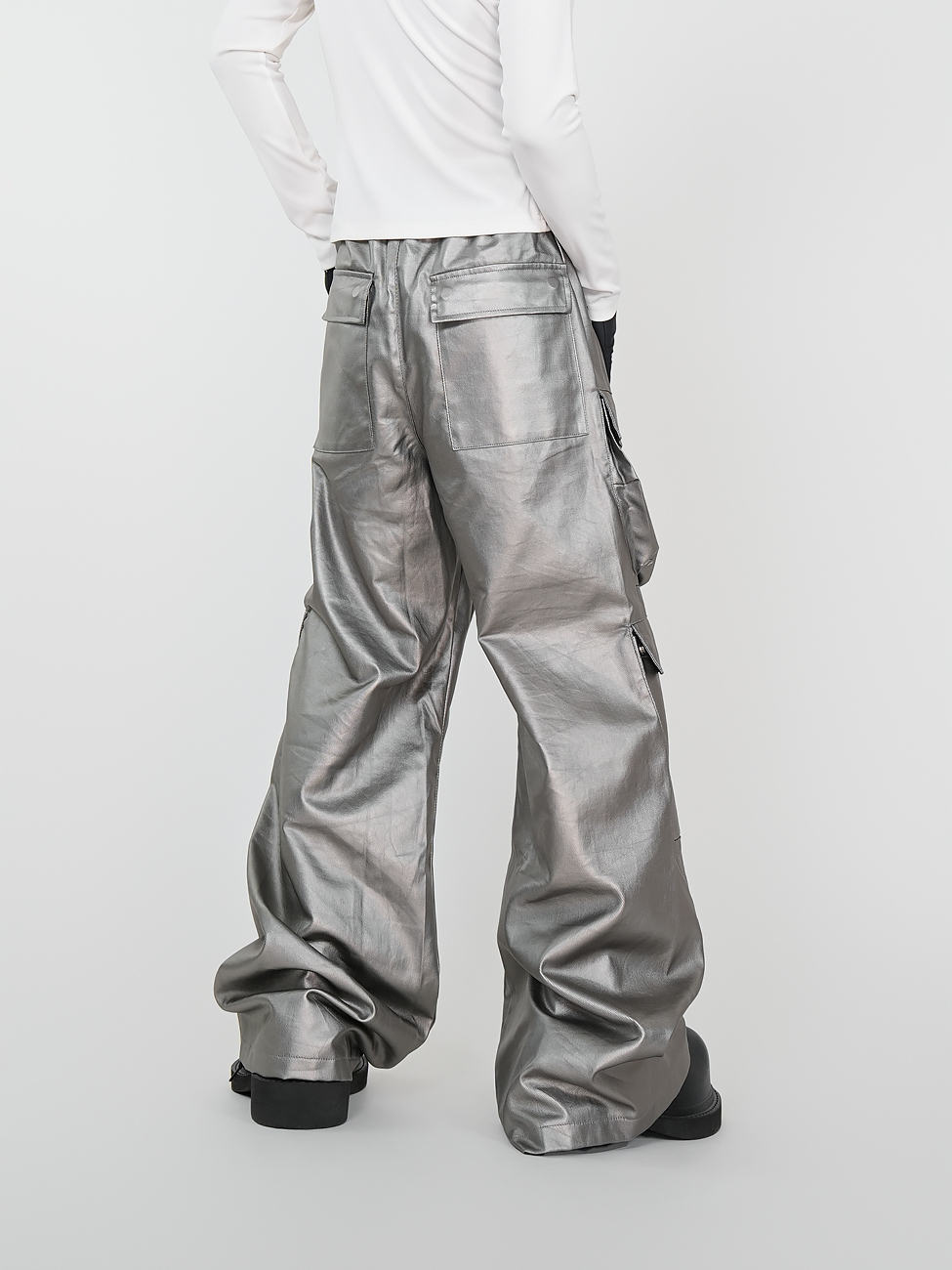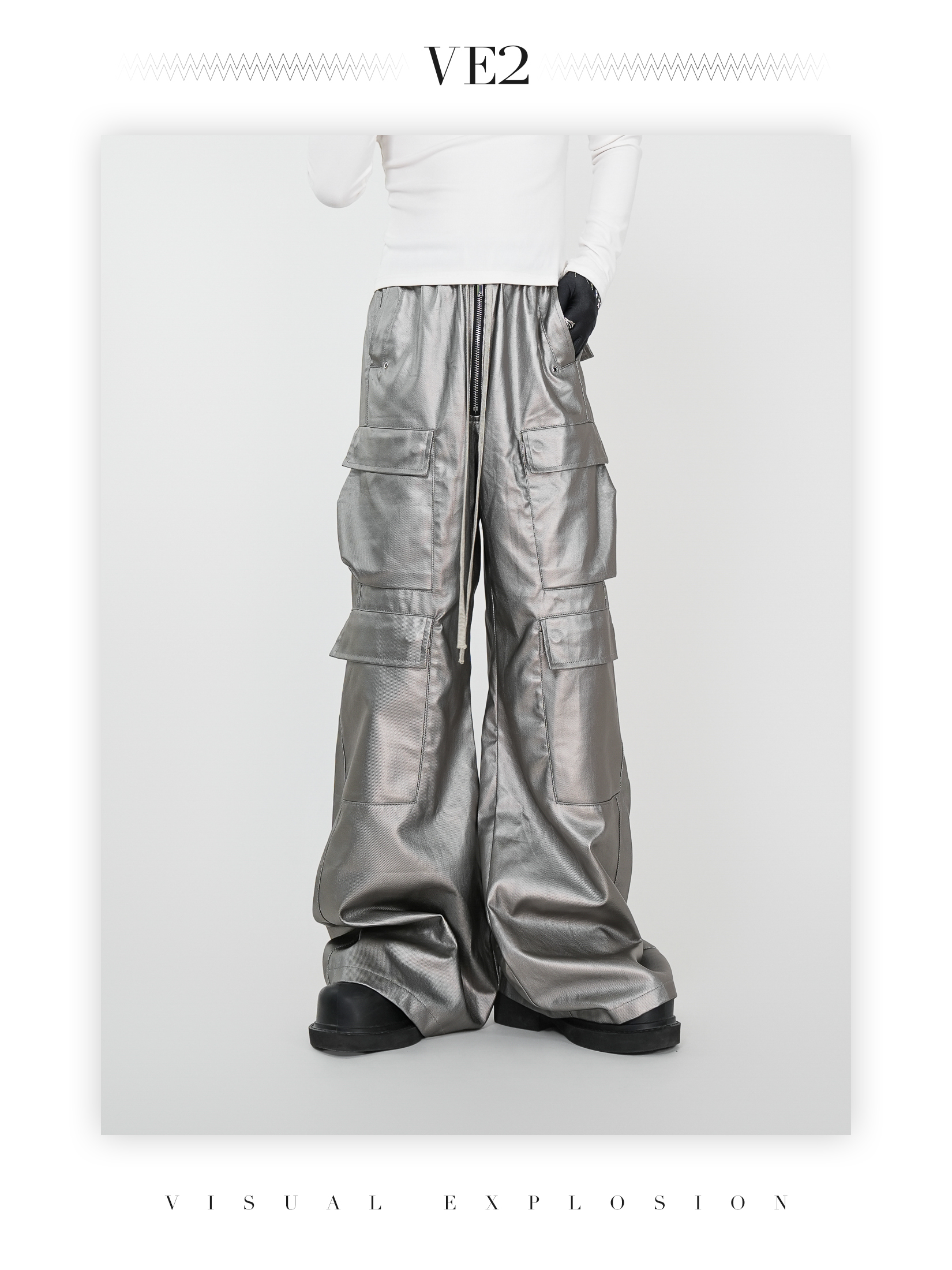 Matte Silver Waxed Coating Wide Leg Cargo Denim Jeans WN17431
