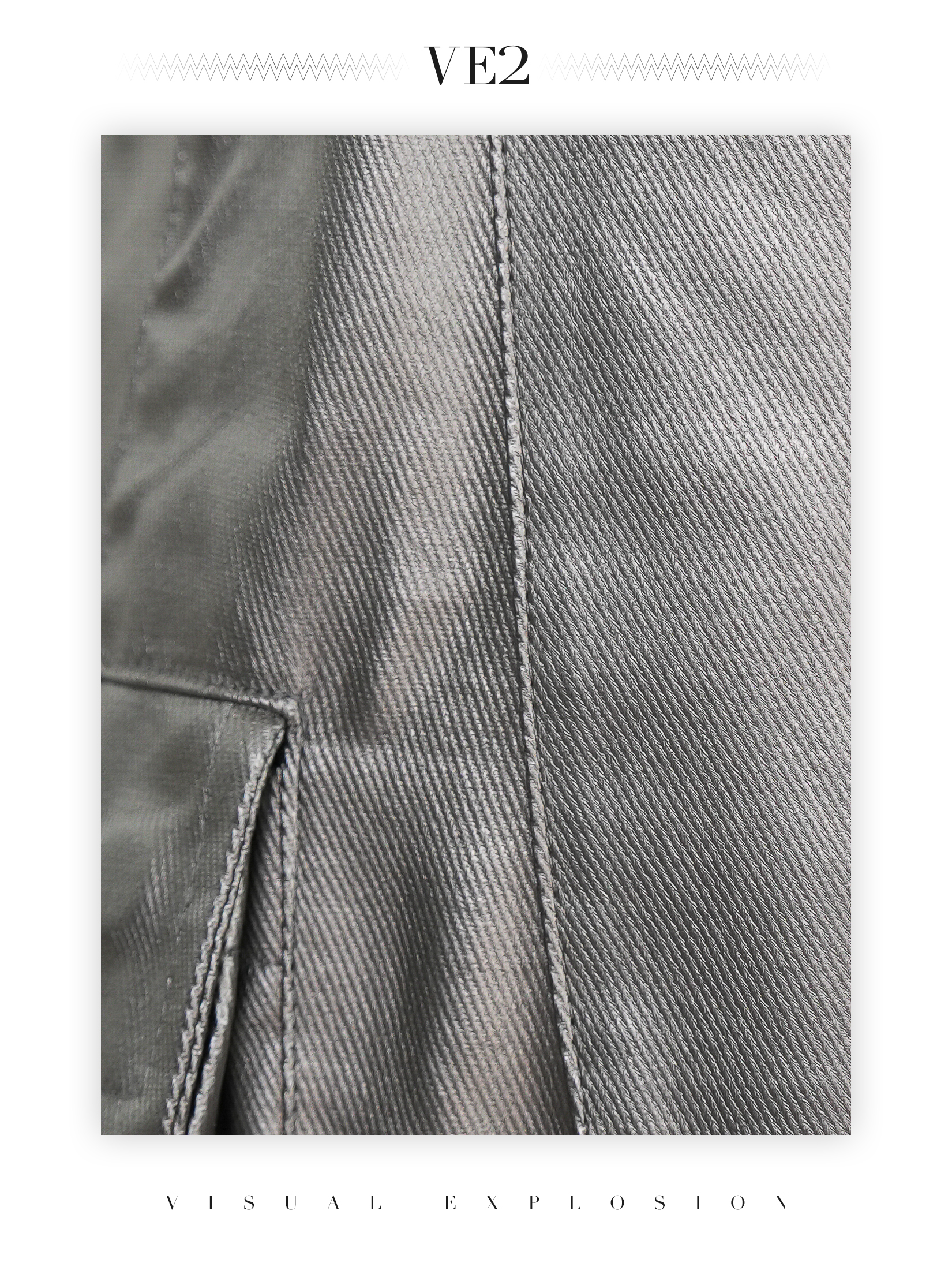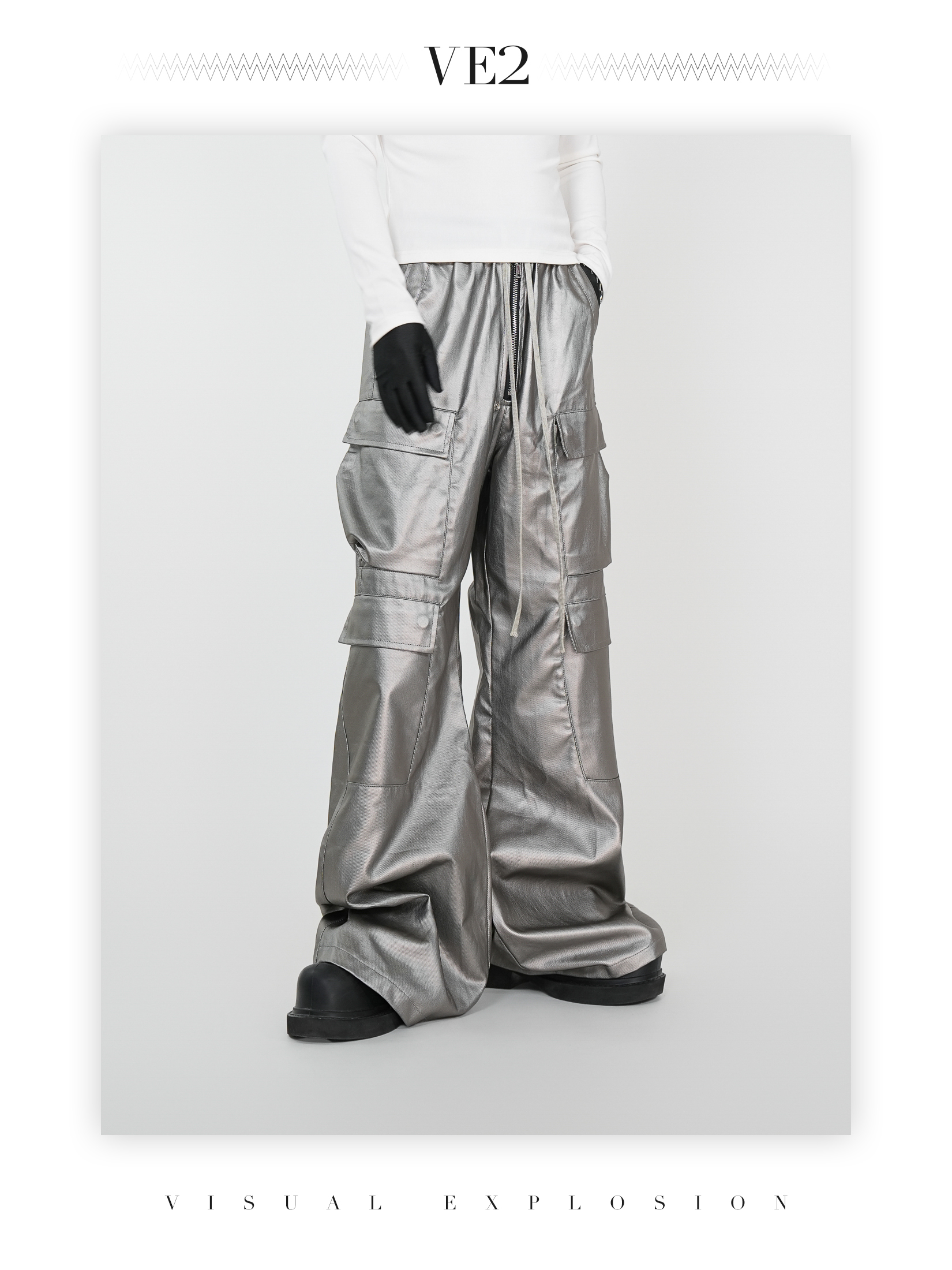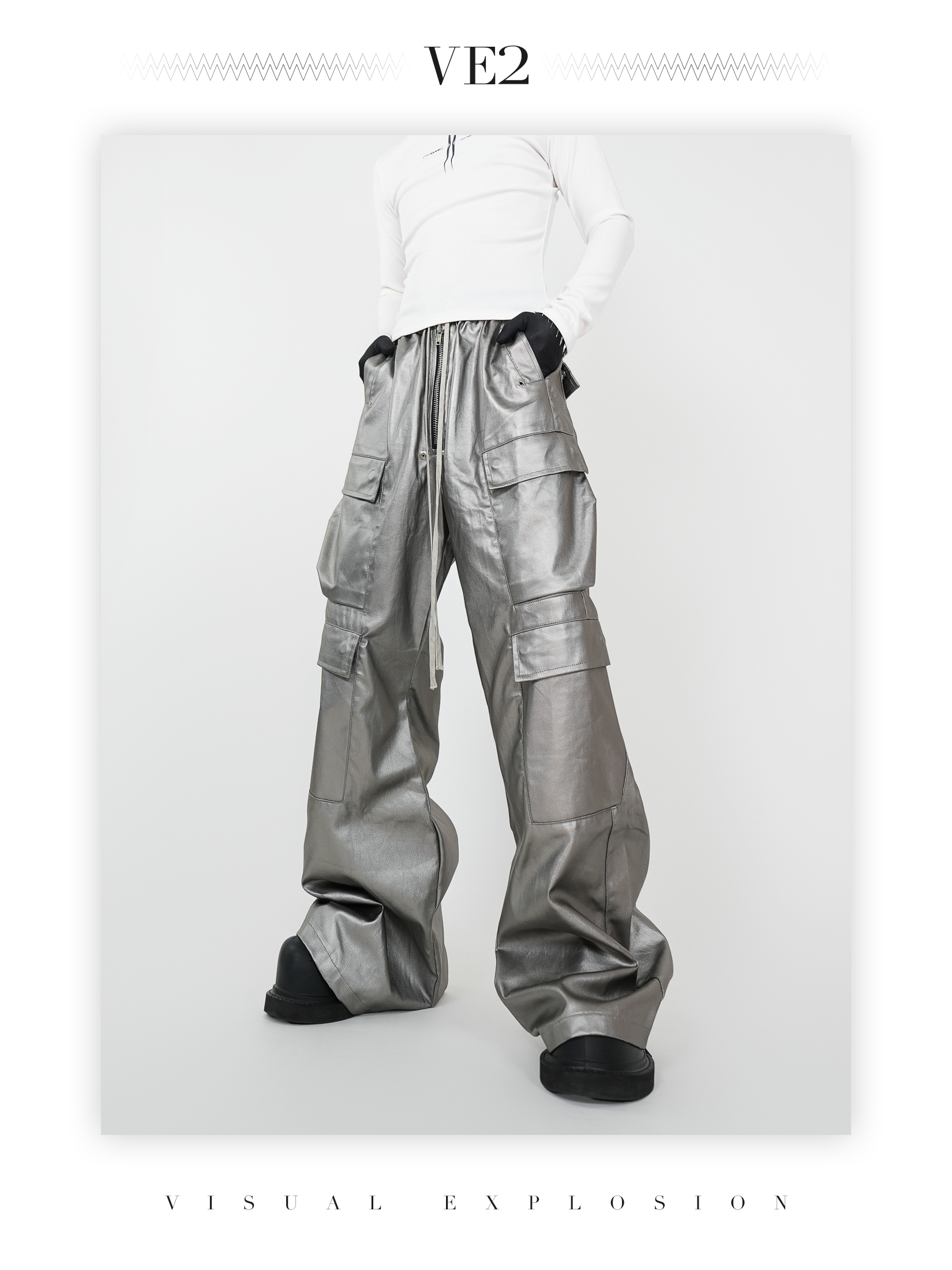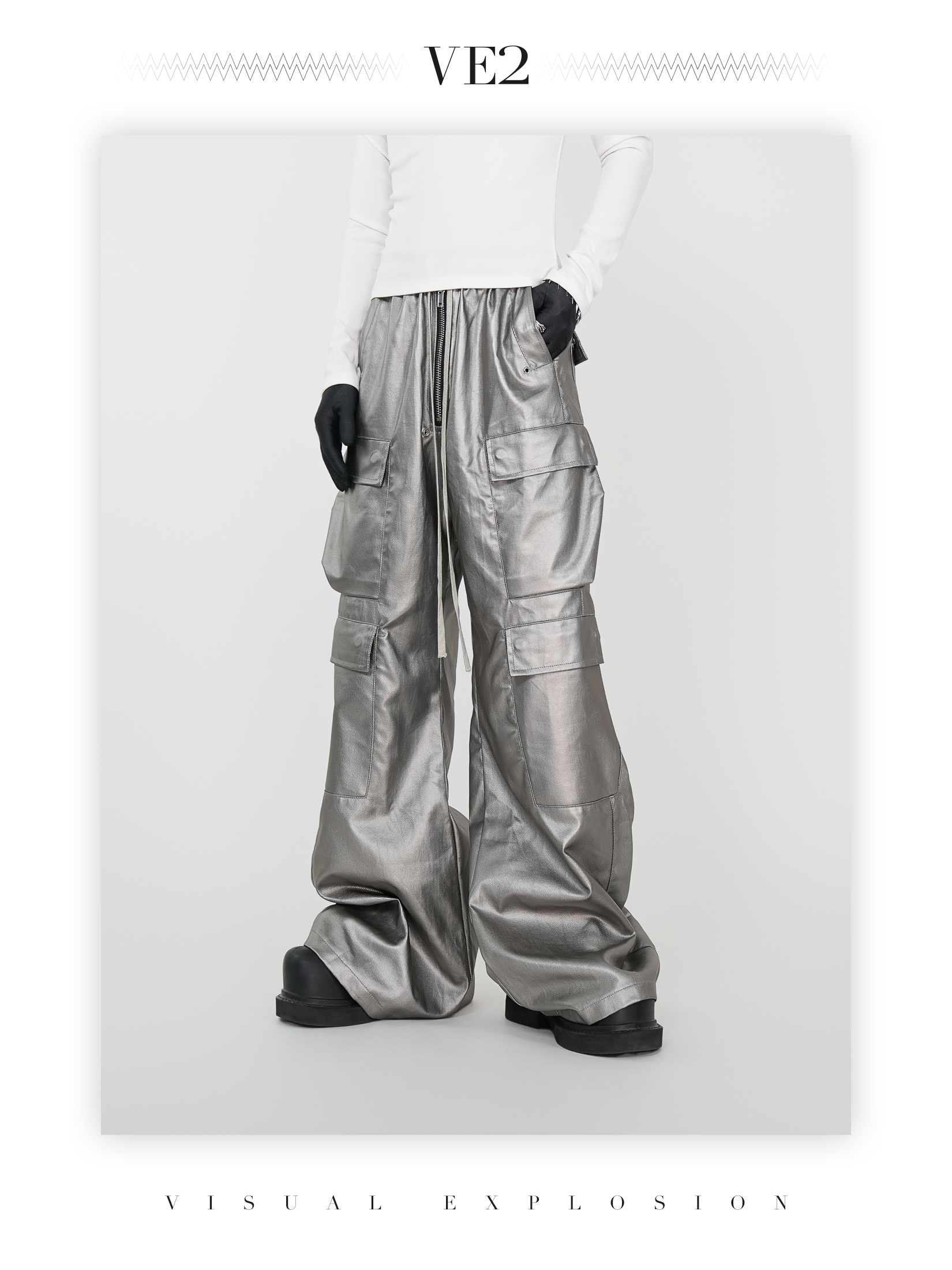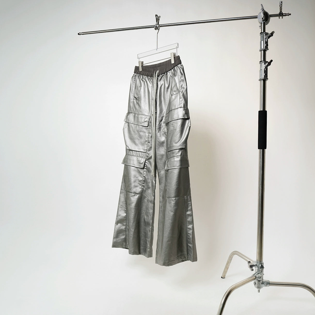 Matte Silver Waxed Coating Wide Leg Cargo Denim Jeans WN17431