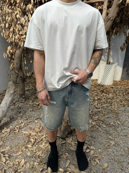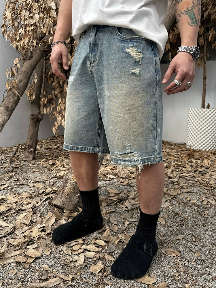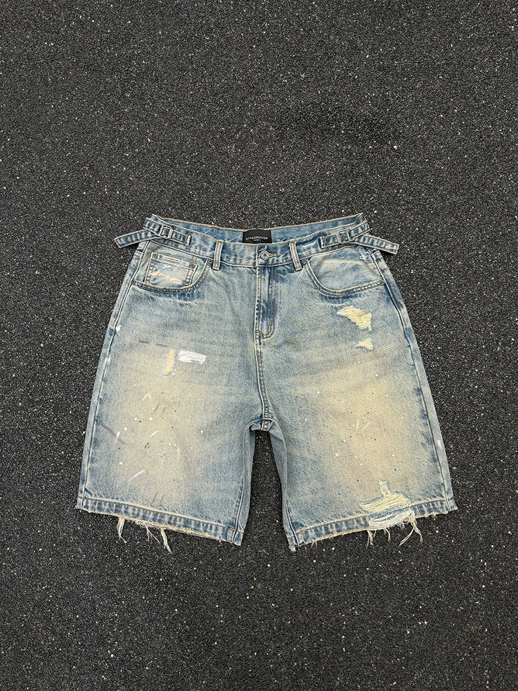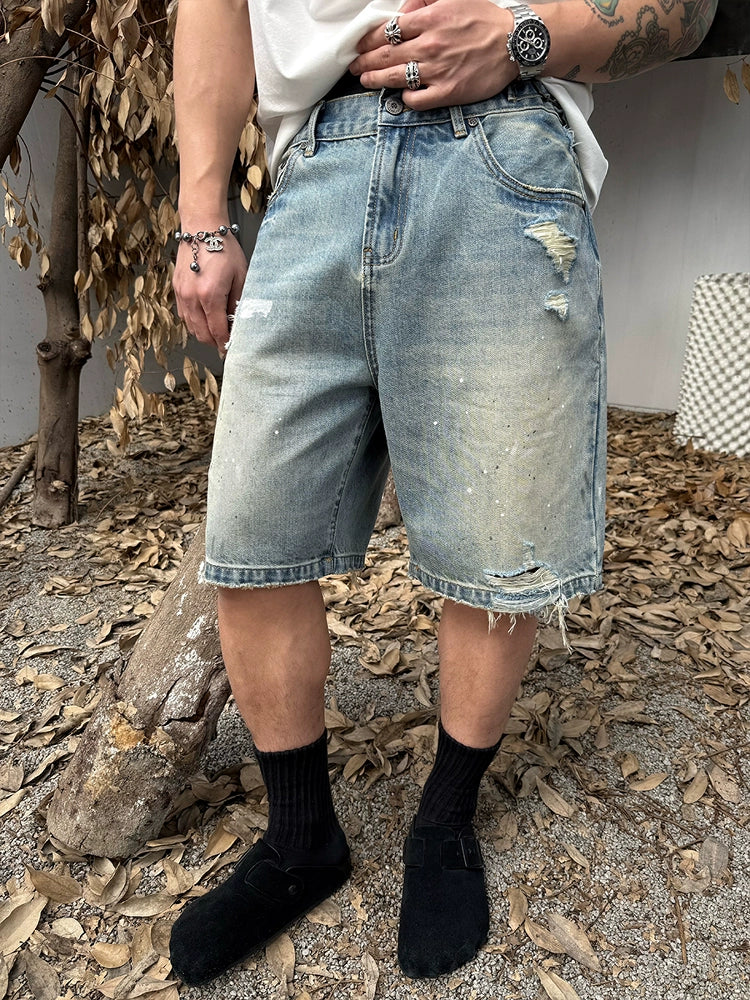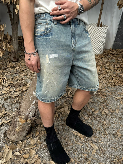 Damage Paint Fade Washed Denim Half Pants WN17658