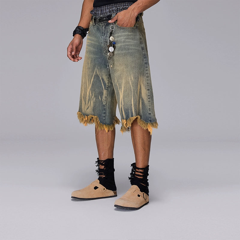 Washed Mud Dye Brush Finish Wide Leg Denim Half Pants WN17902