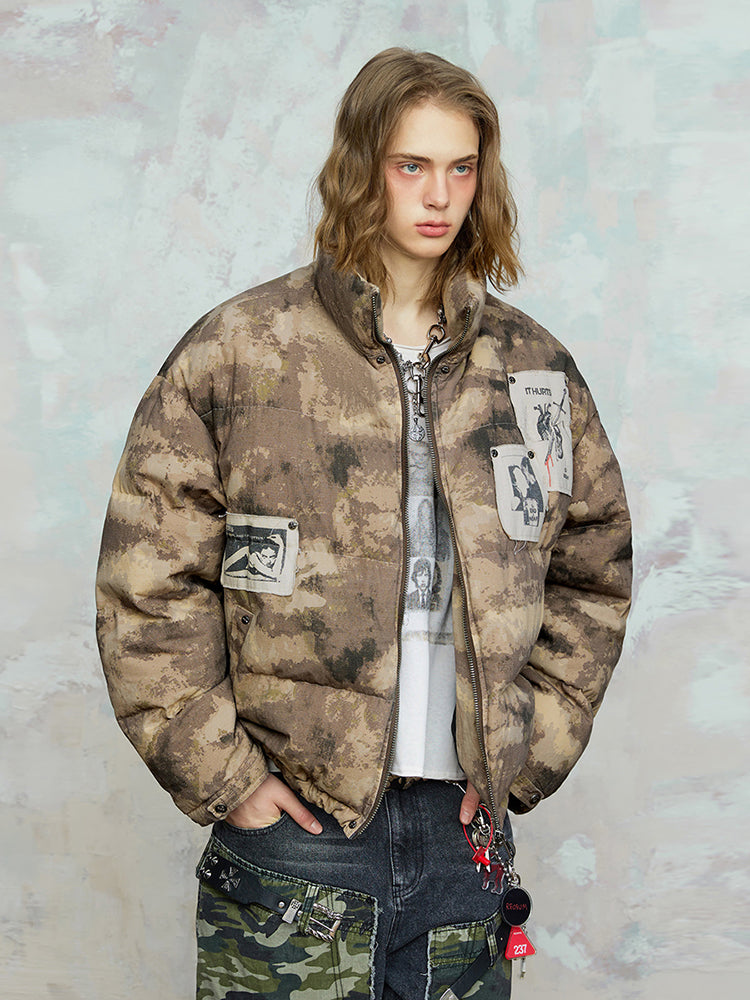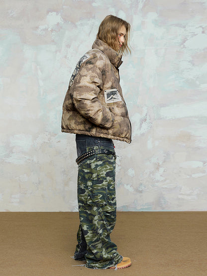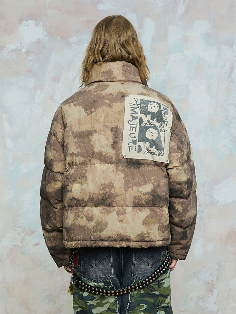 Camouflage Portrait Print Patch Embroidery Texture White Duck Down Jacket WN17935