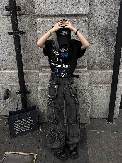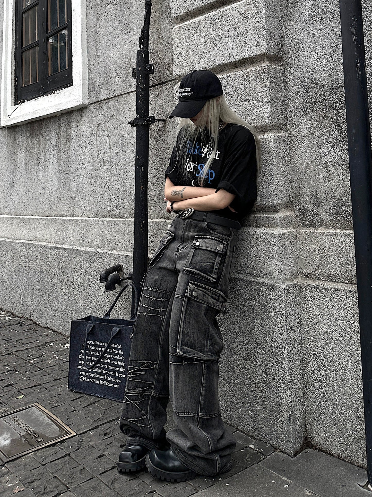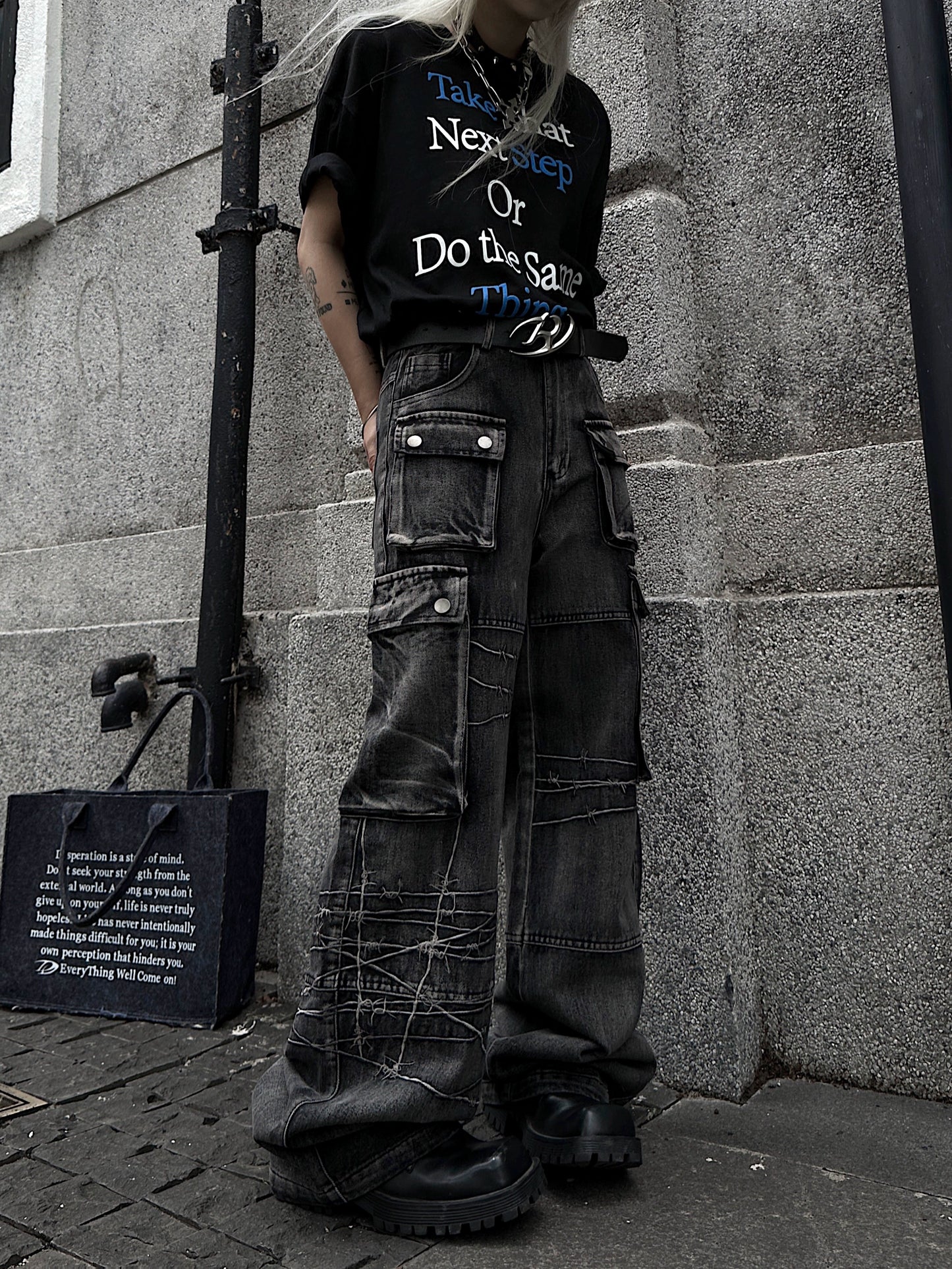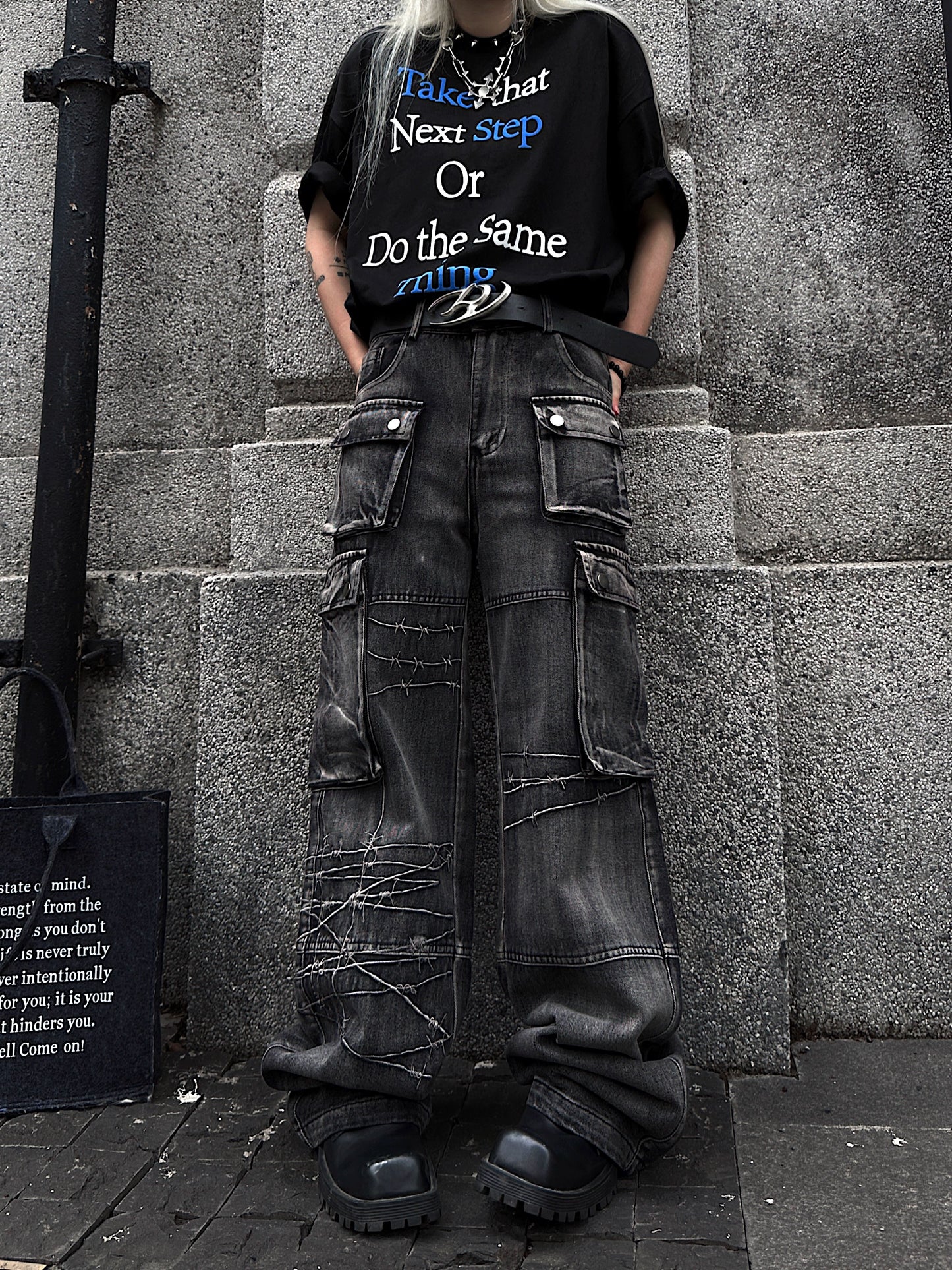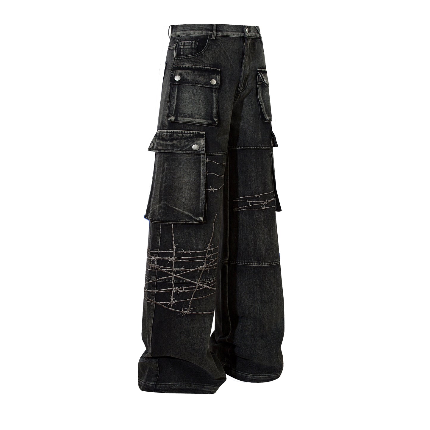 Embroidery Multi-Pocket Washed Wide Leg Denim Jeans WN18144