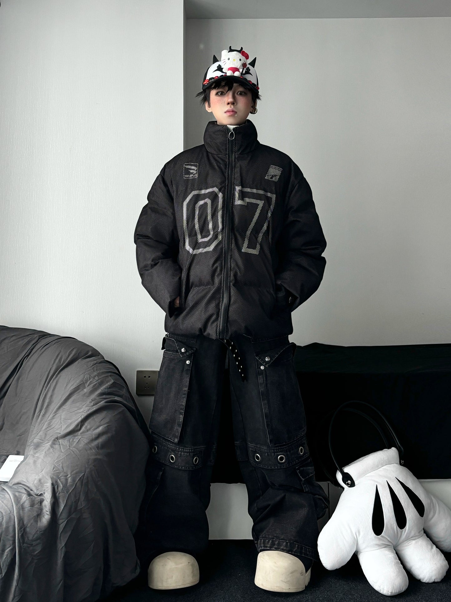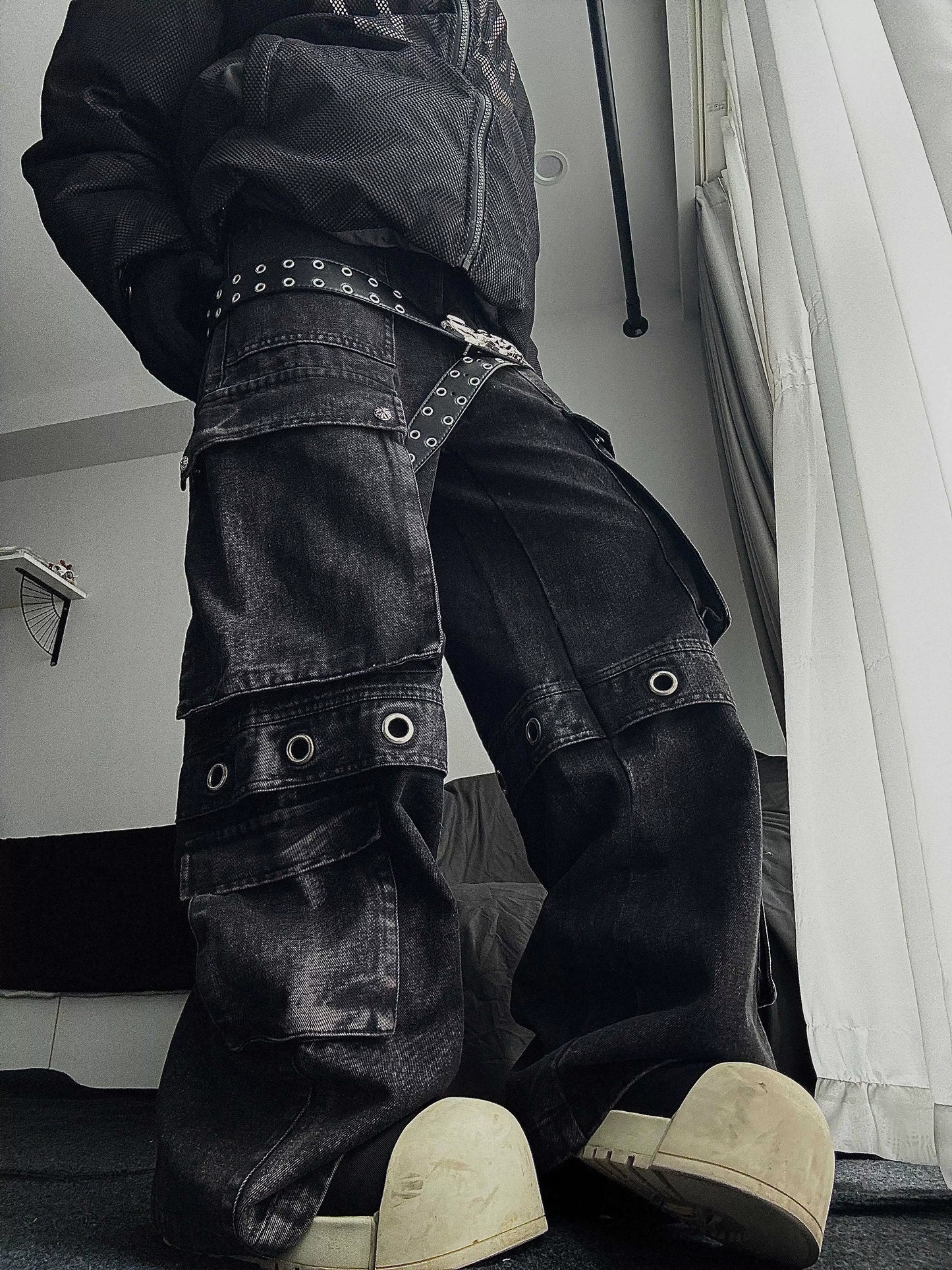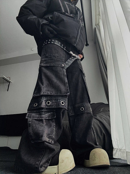 Large Pocket Ring Detail Wide Leg Cargo Denim Jeans WN18151