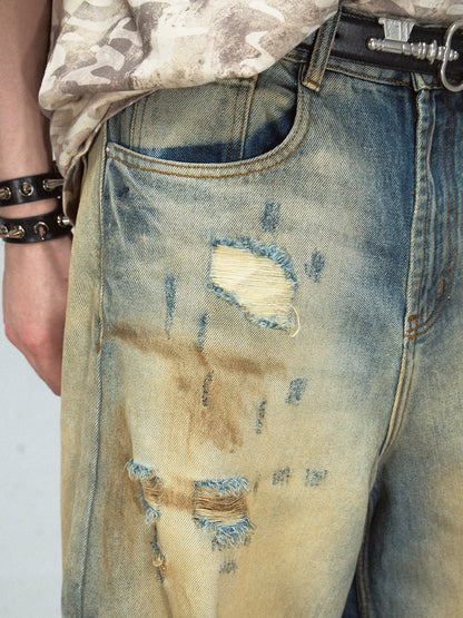 Mud Dye Damage Washed Wide Leg Denim Jeans WN18272