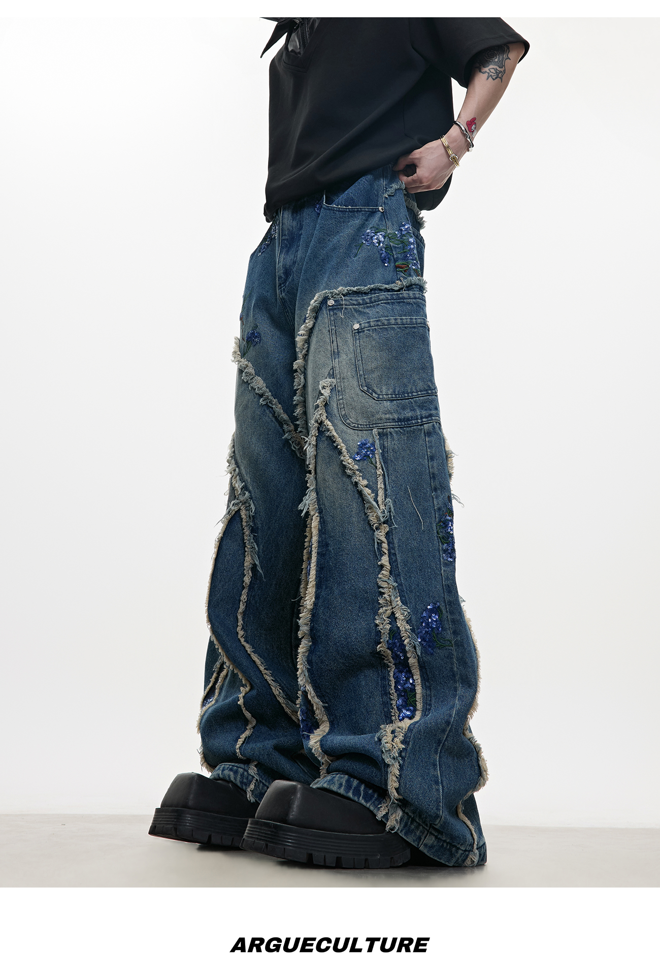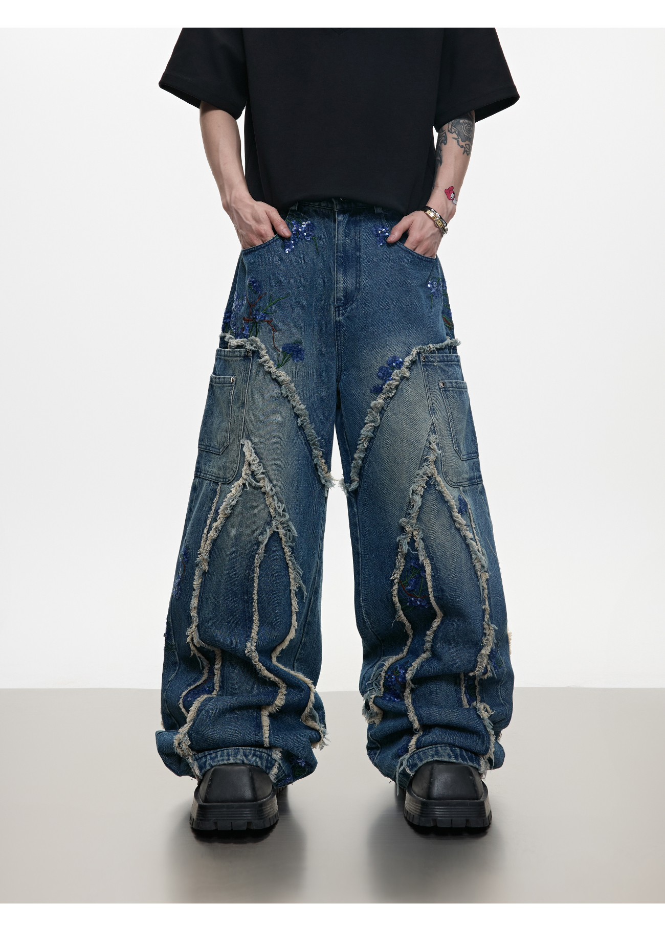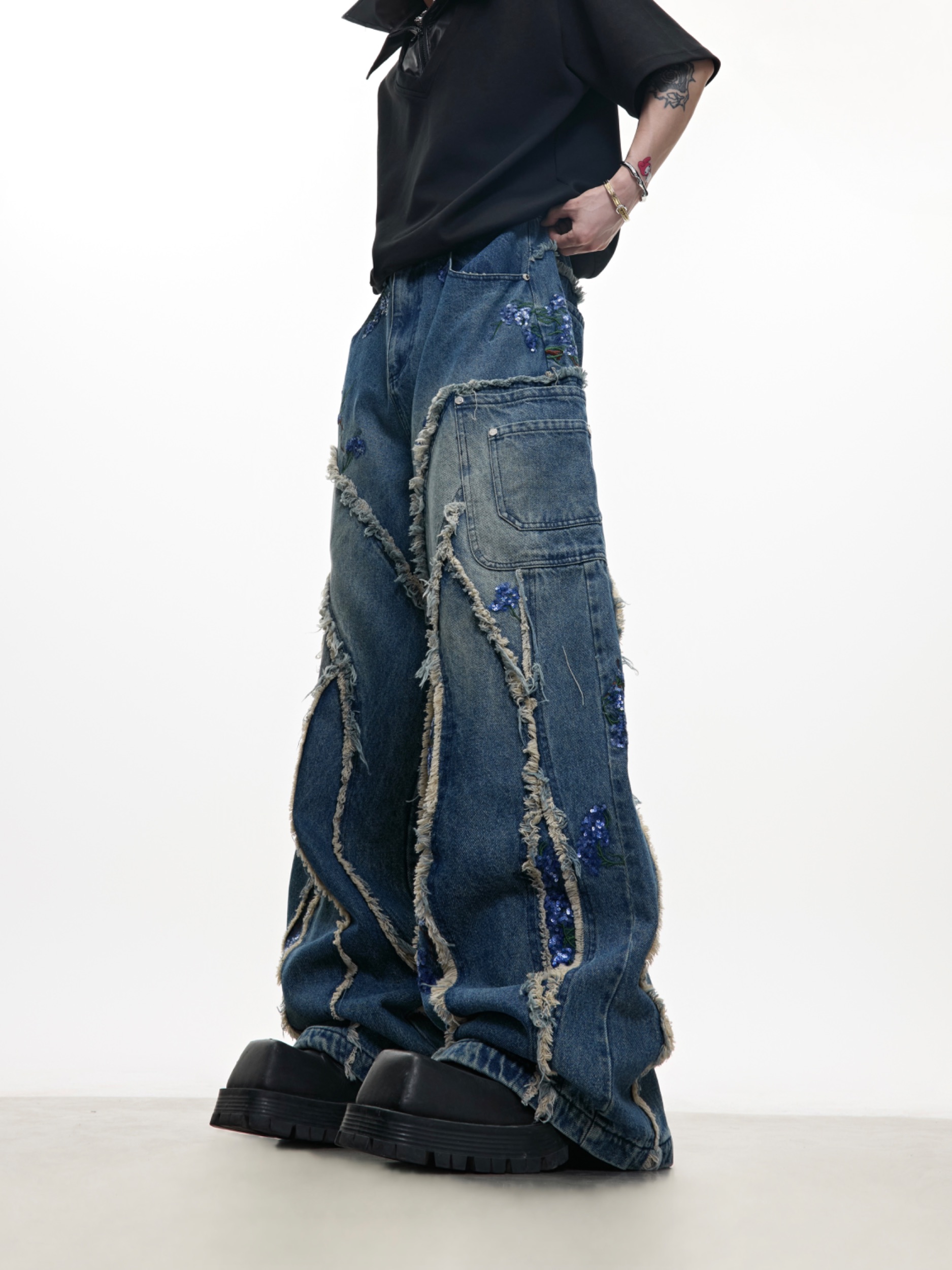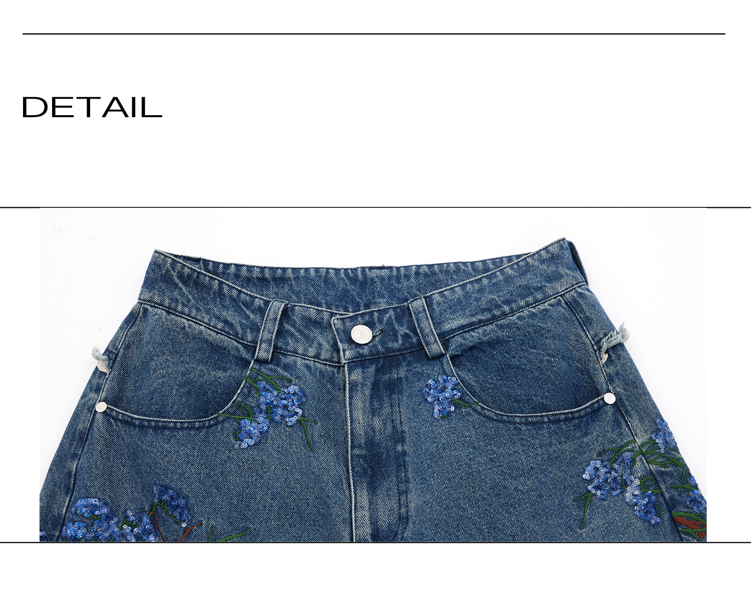 Sequin Embroidery Curved Raw Hem Wide Leg Denim Jeans WN18361