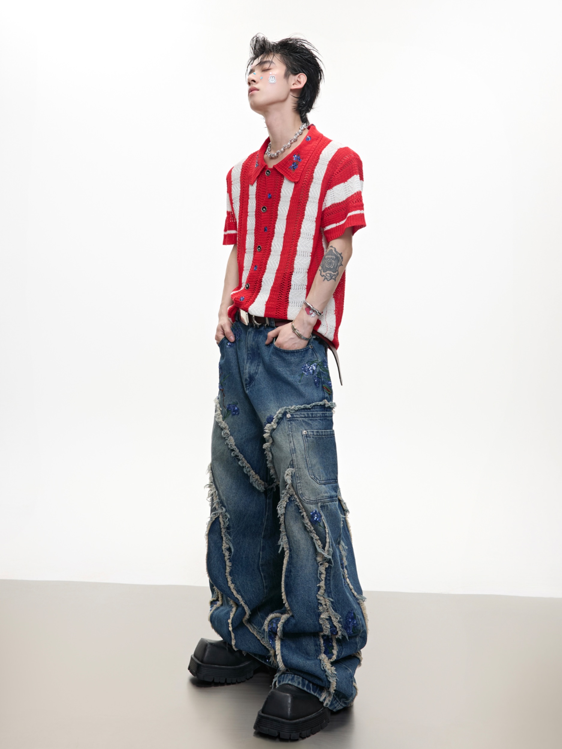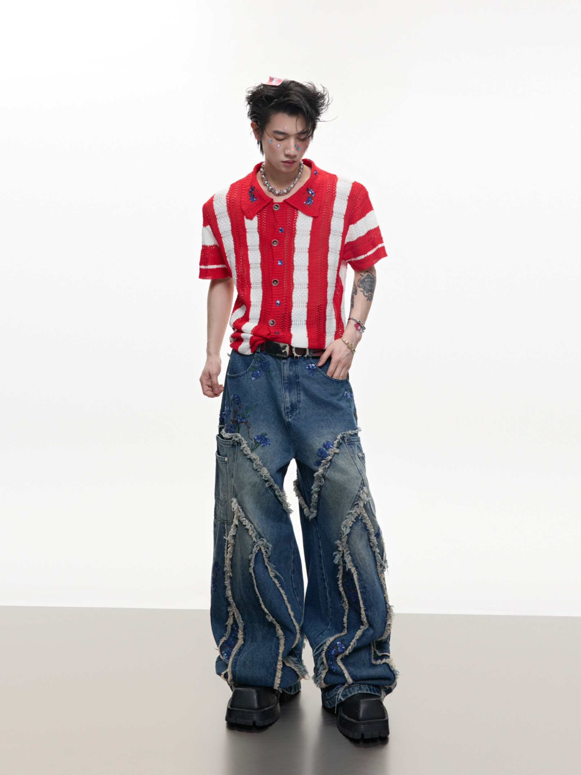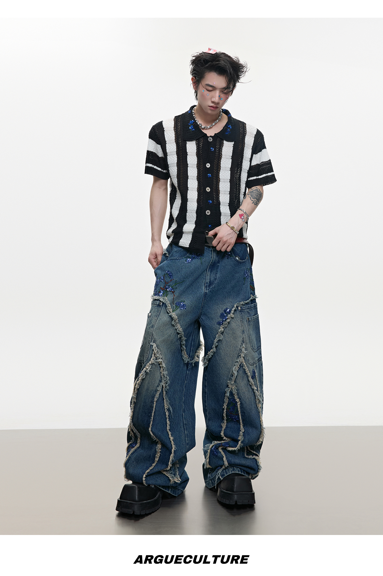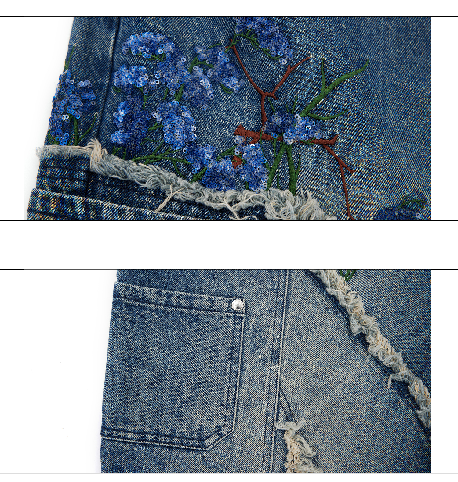 Sequin Embroidery Curved Raw Hem Wide Leg Denim Jeans WN18361