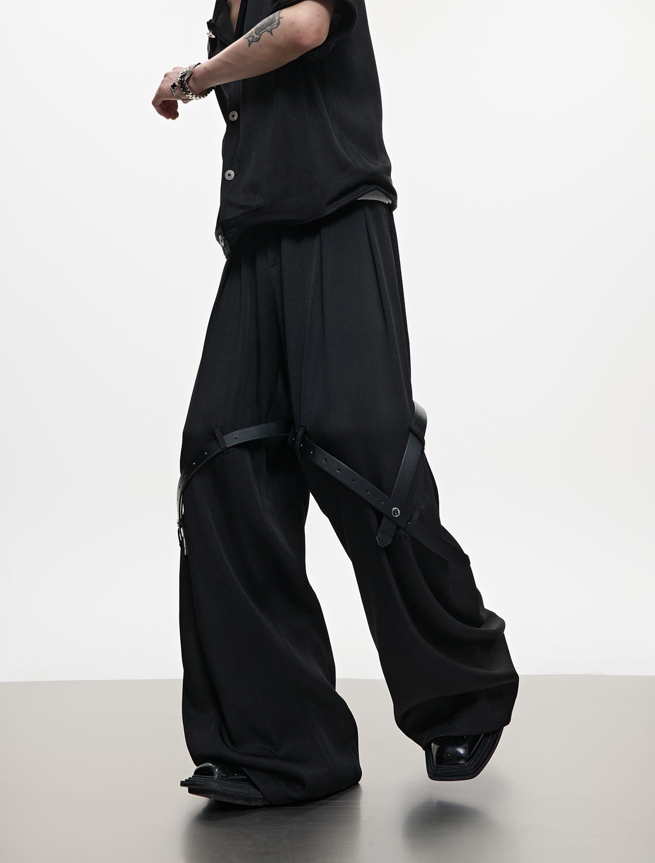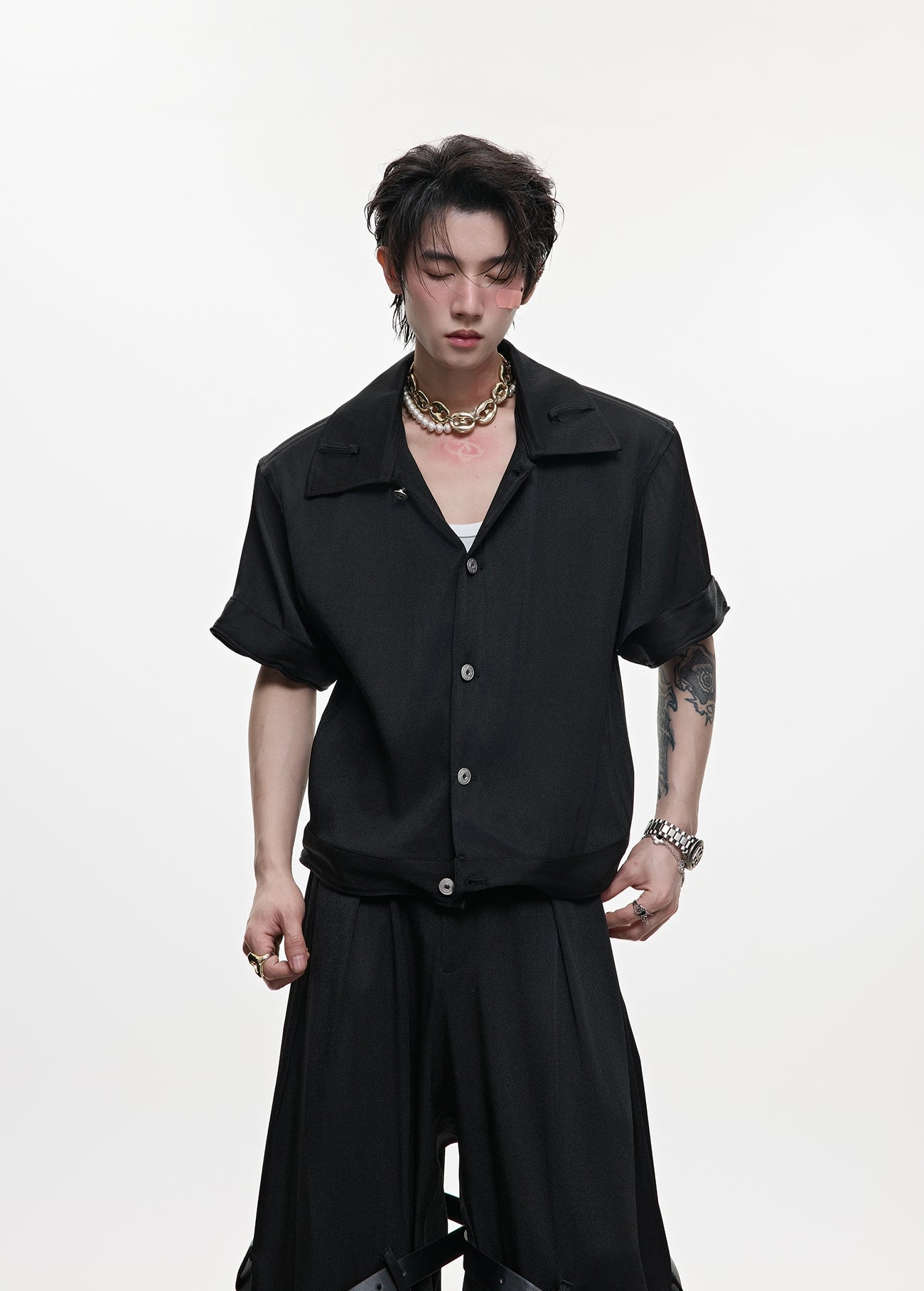 Textured Short Sleeve Shirt Jacket & Belt Patchwork Pants Setup WN18370