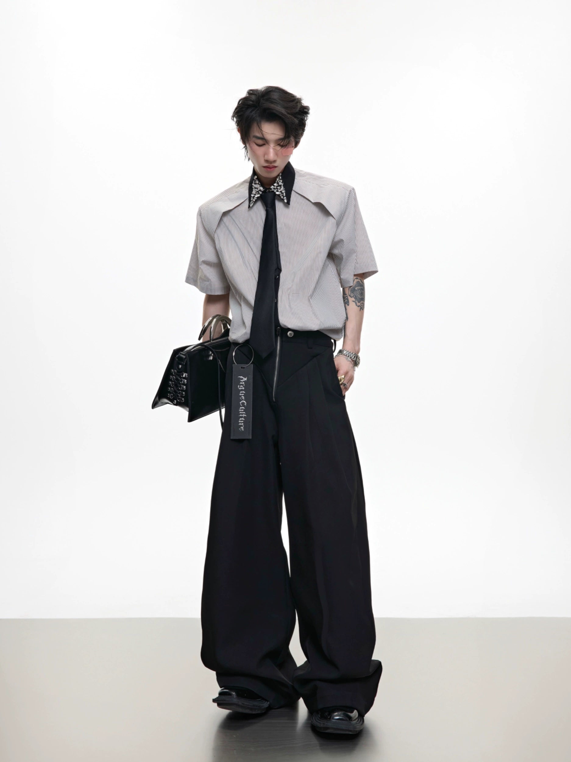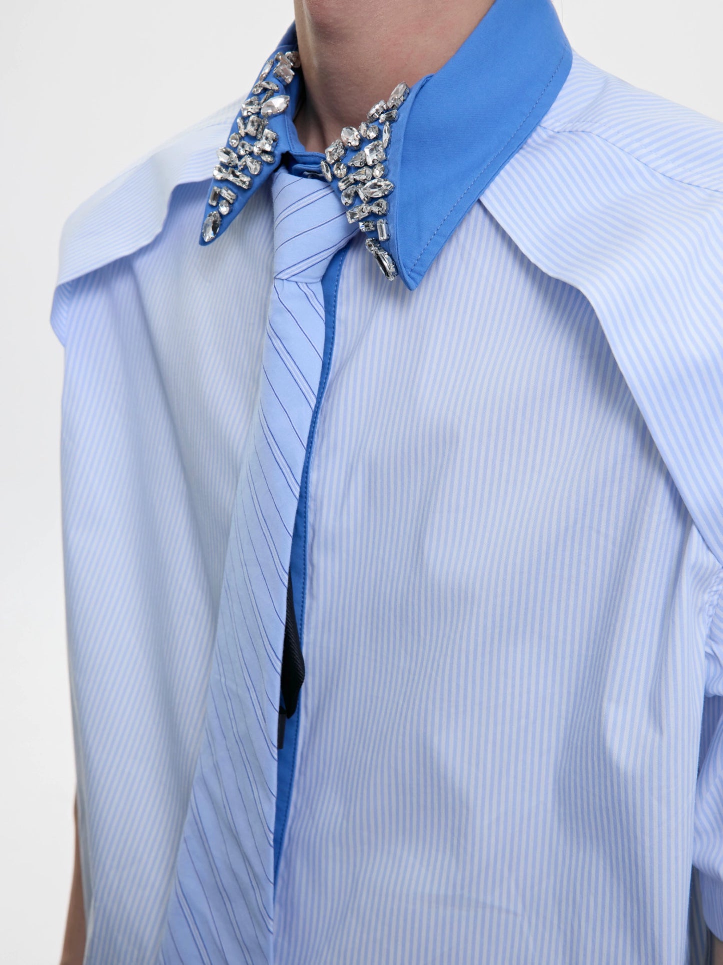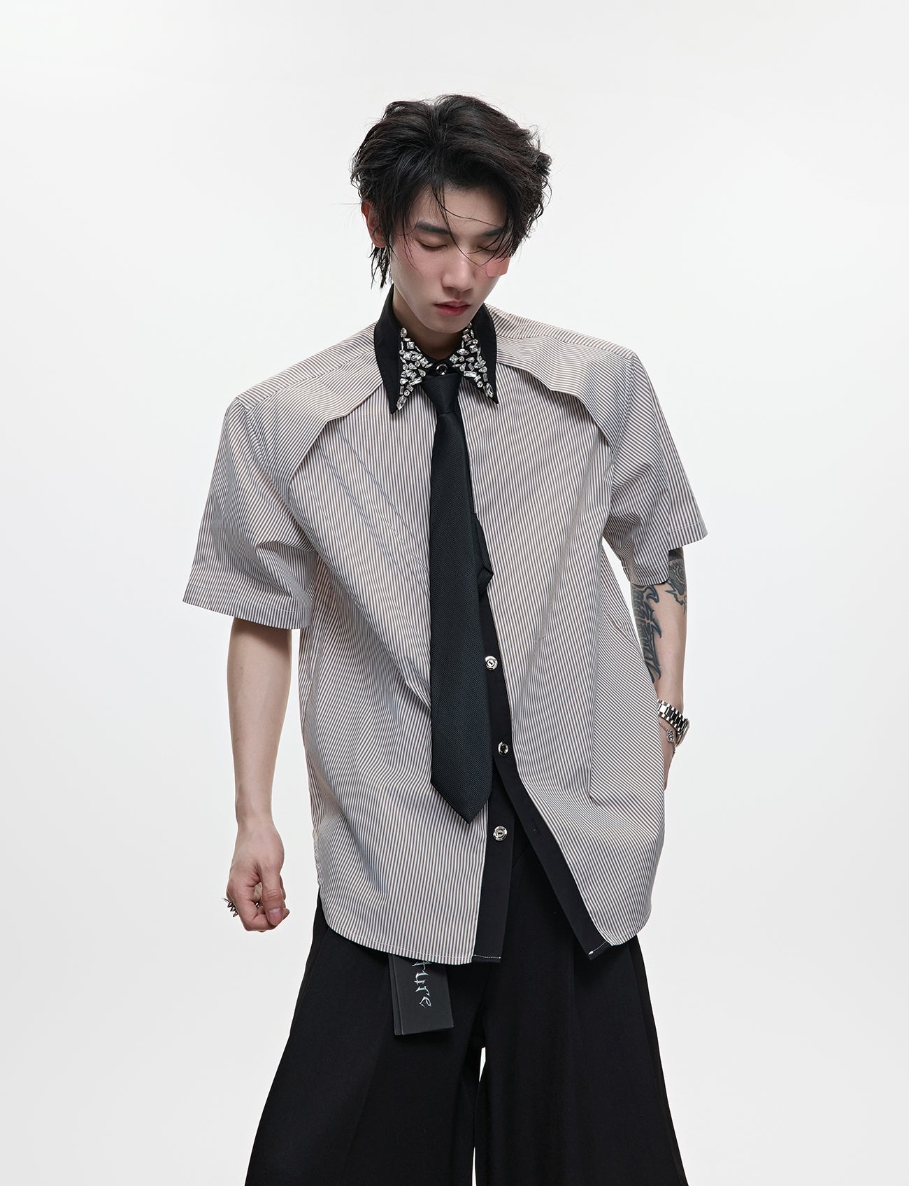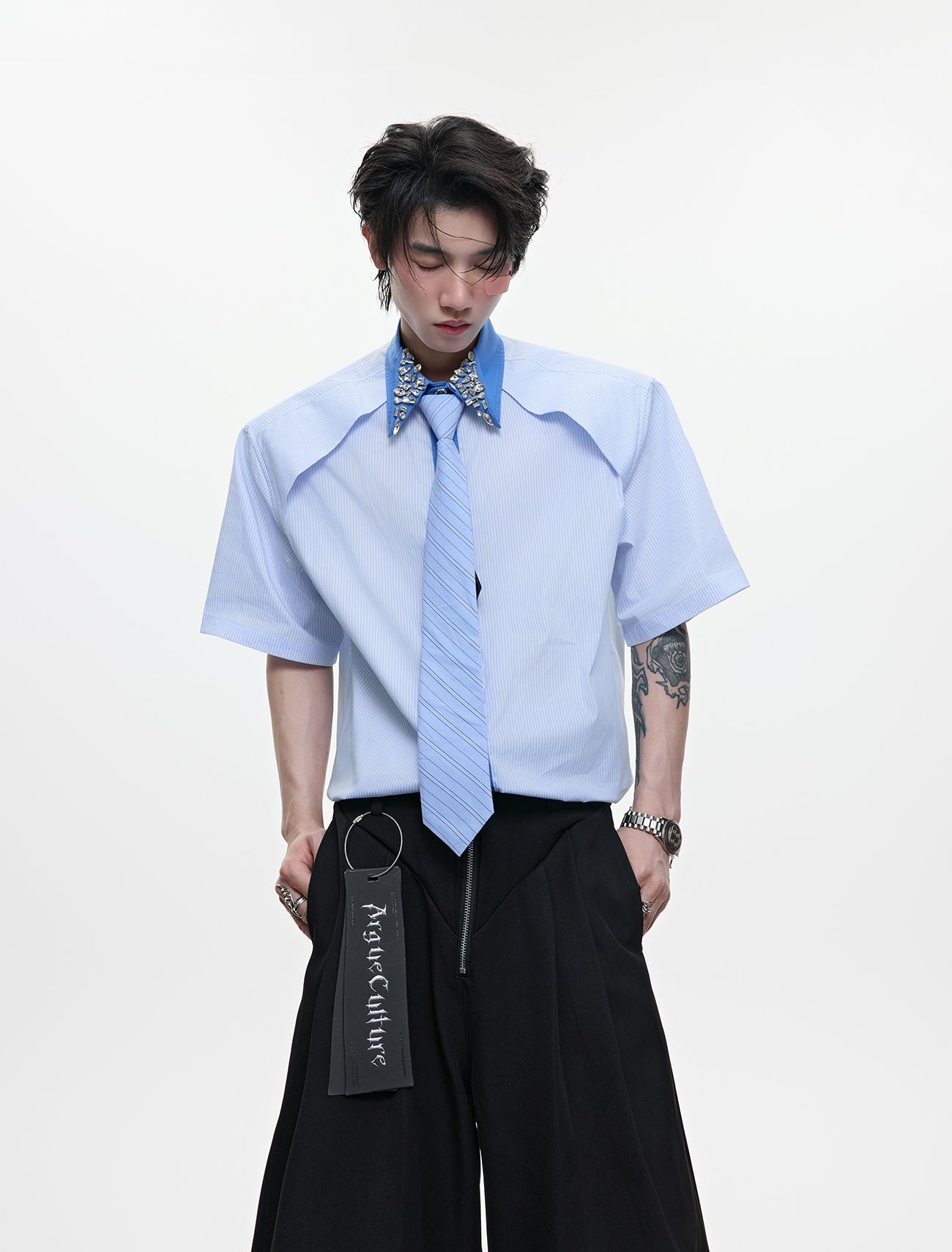 Rhinestone Stripe Two-Tone Patchwork Short Sleeve Shirt WN18373