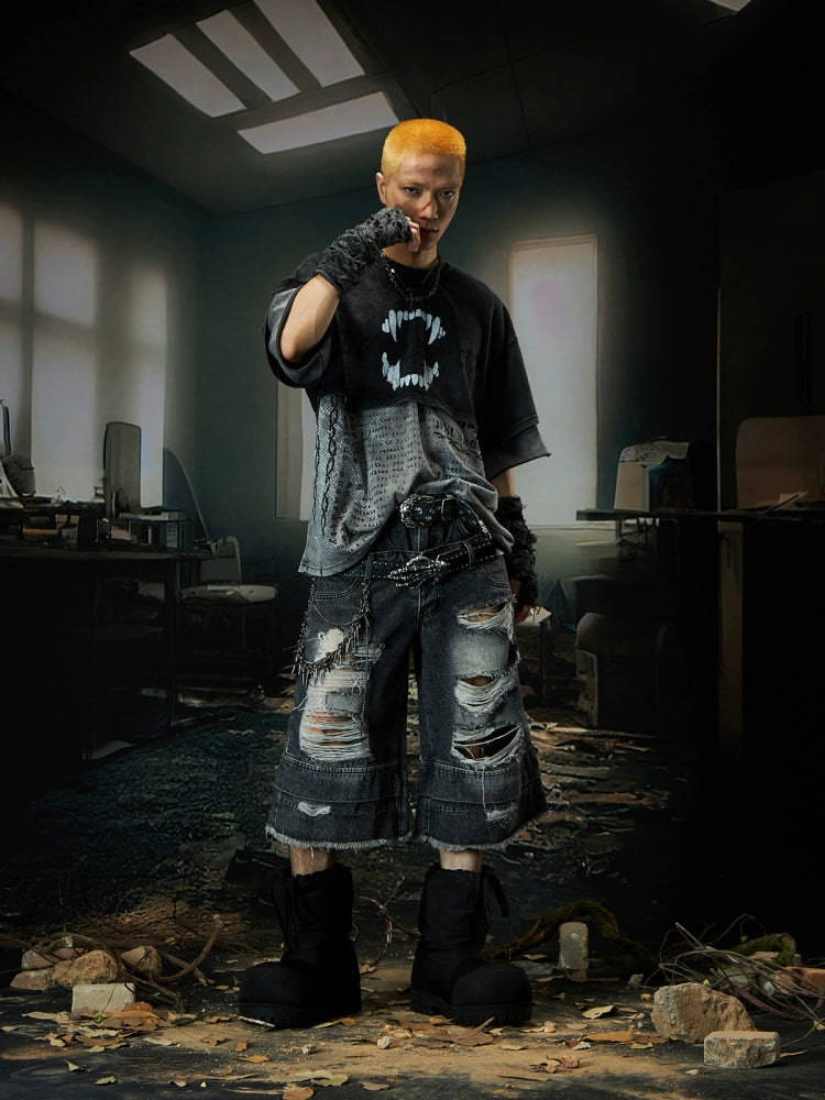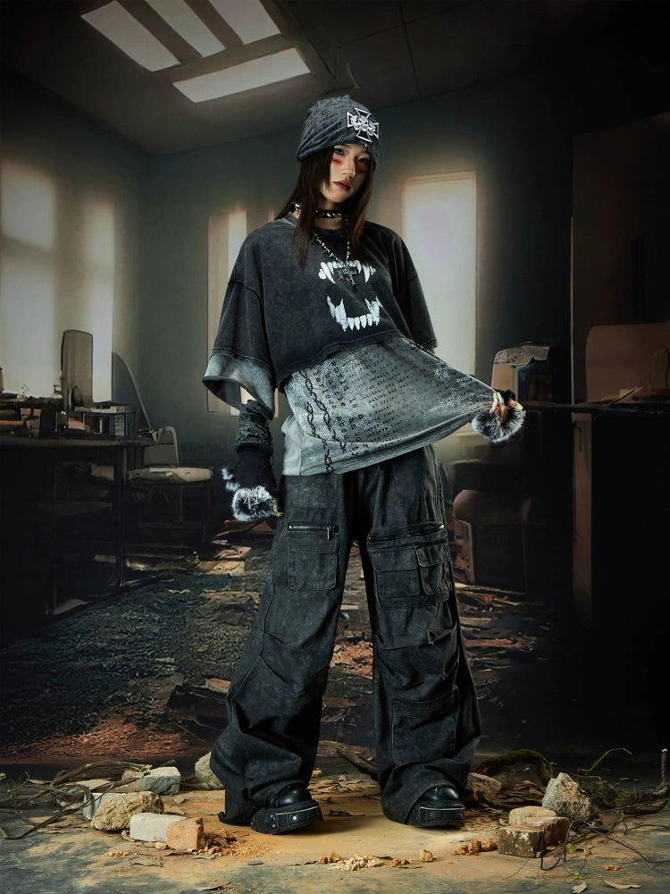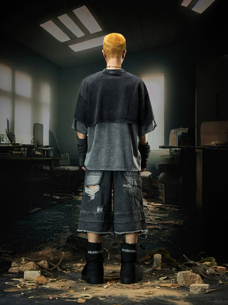 Double Layer Washed Letter Print Oversize Short Sleeve T-Shirt WN18457