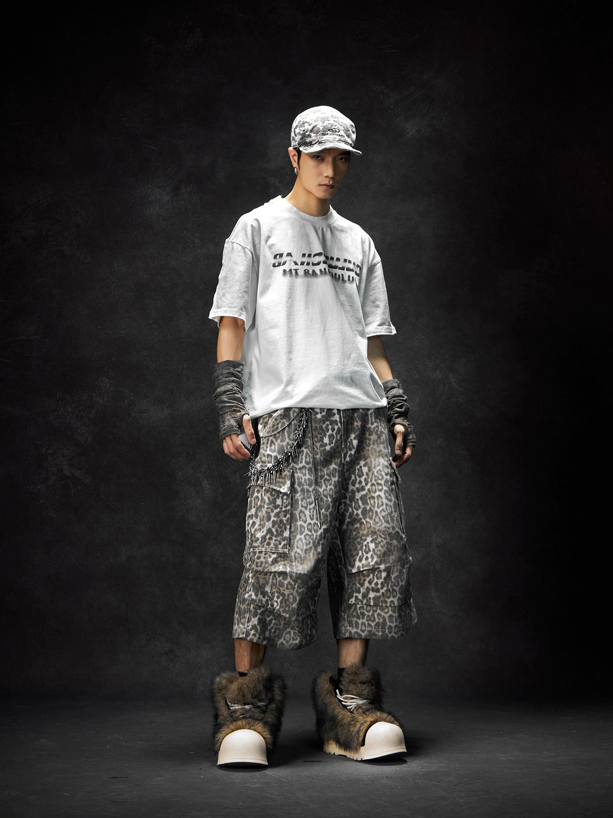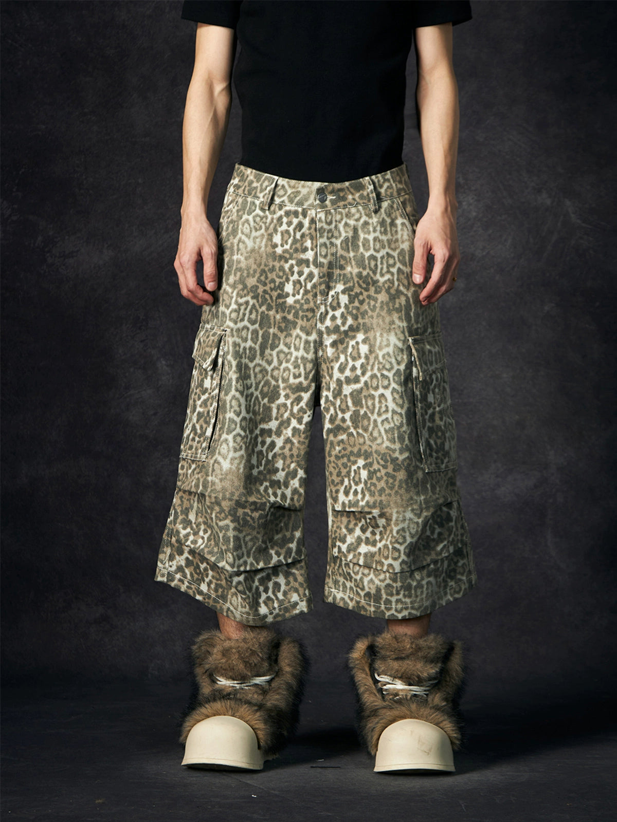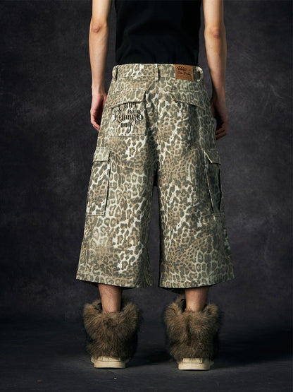 Leopard Print Pleated Large Pocket Wide Leg Cargo Half Pants WN18461