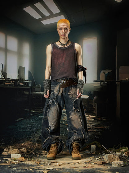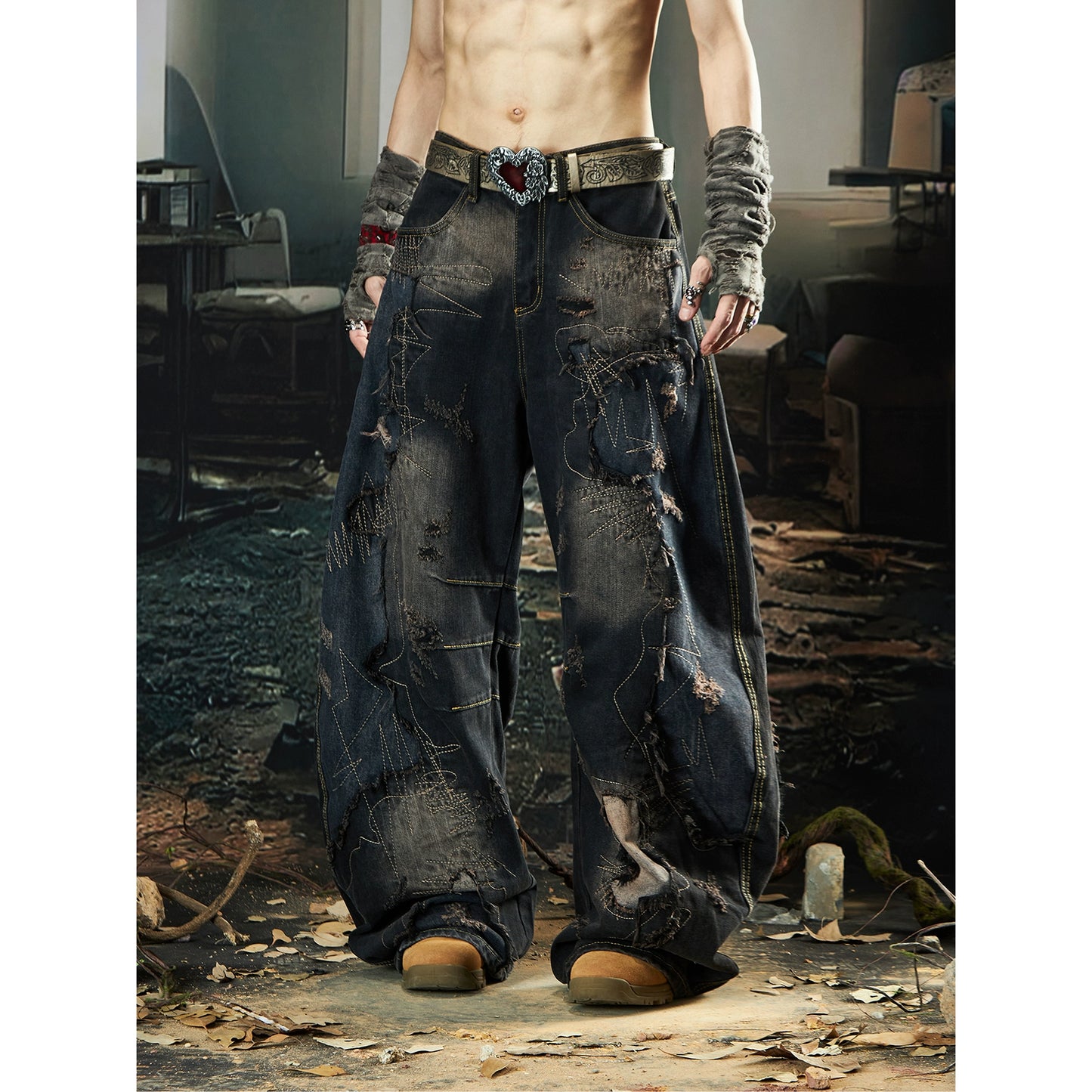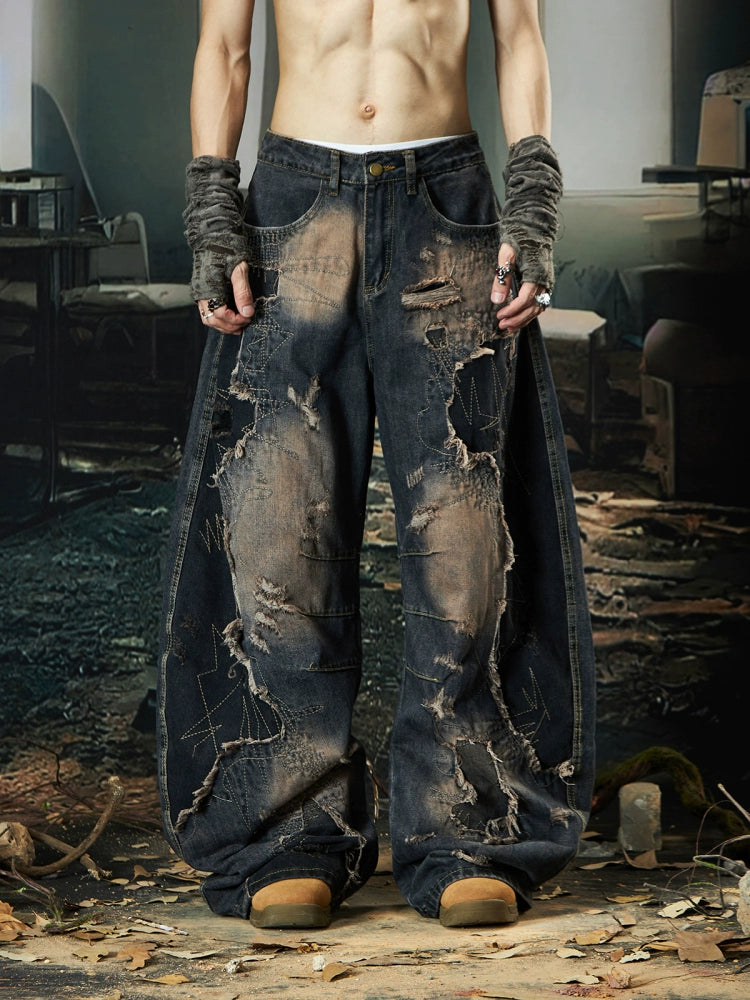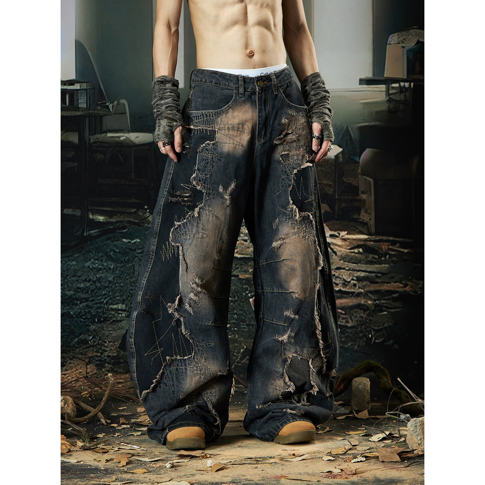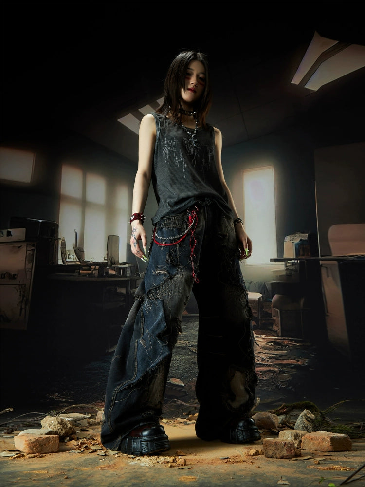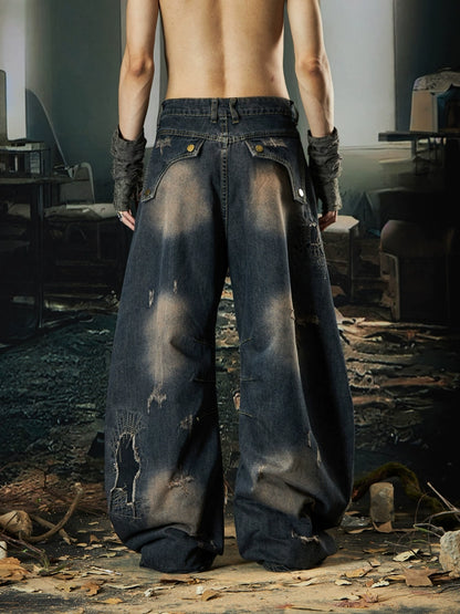 Patchwork Washed Raw Hem Deconstructed Curved Hem Wide Leg Denim Jeans WN18478