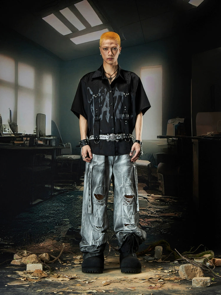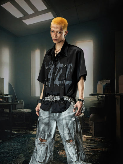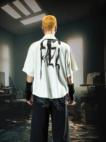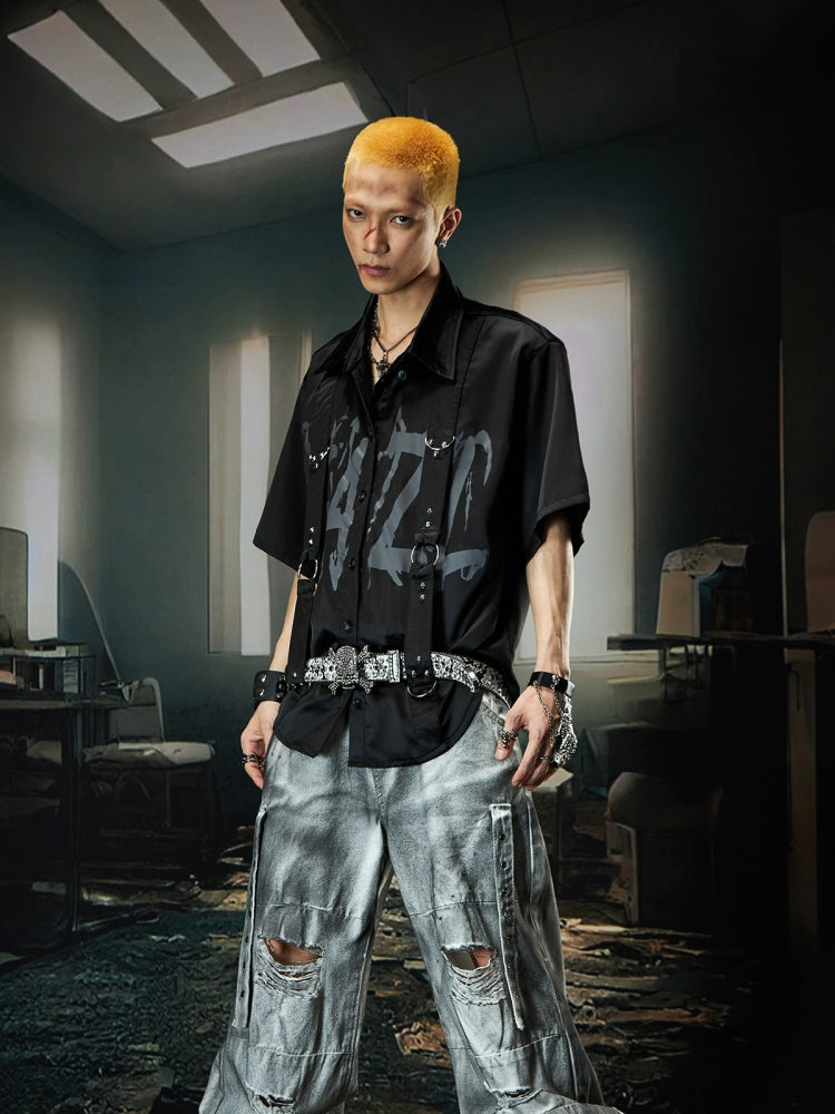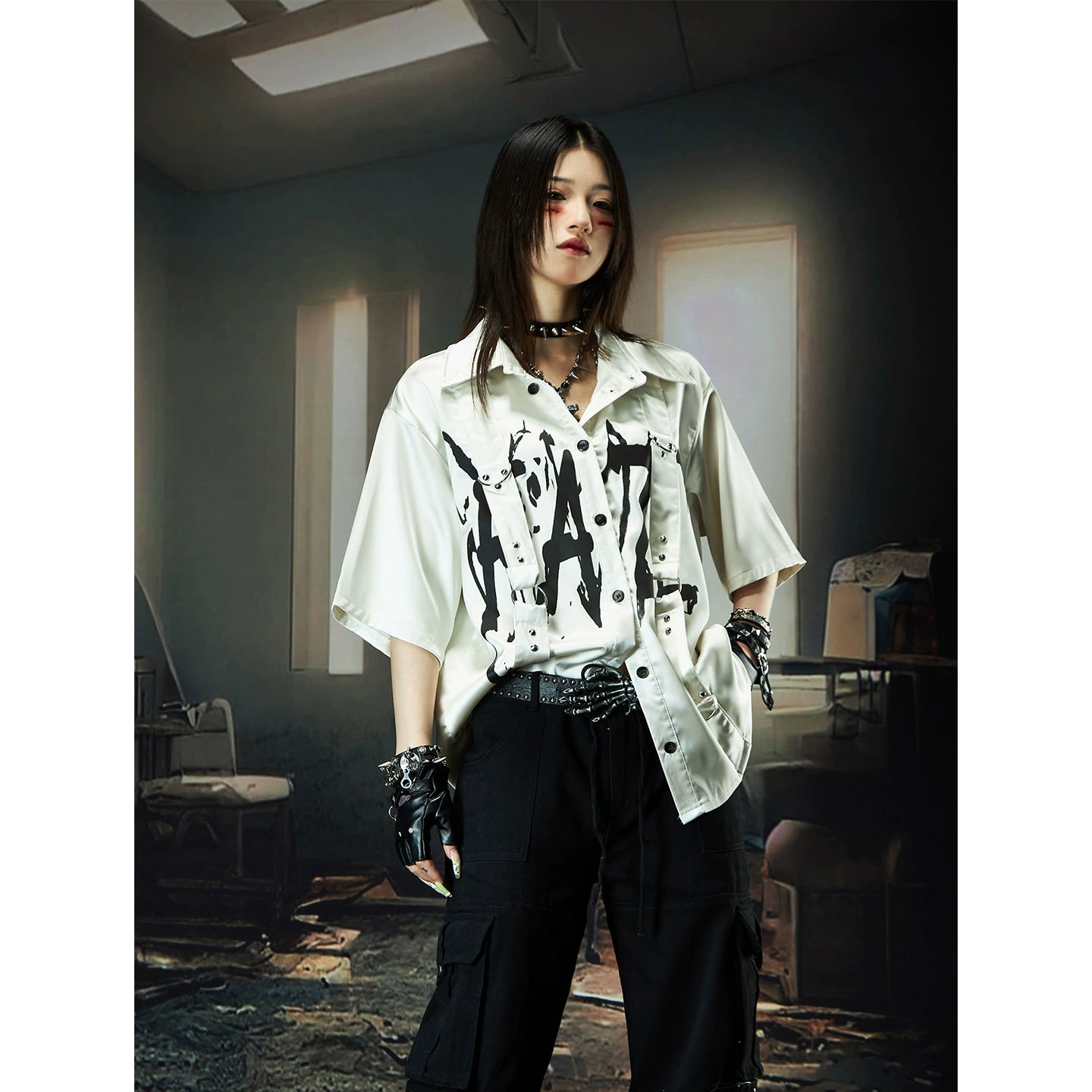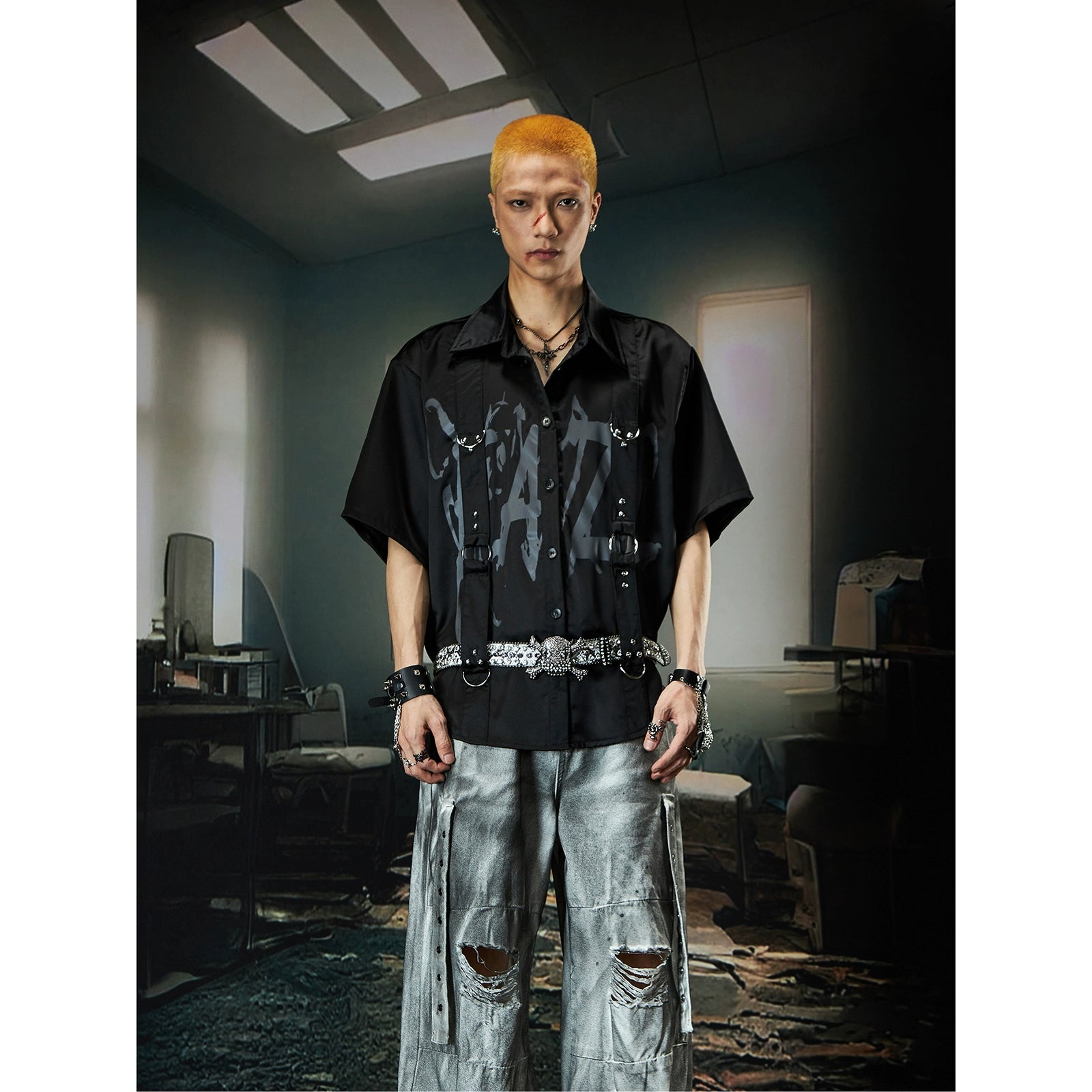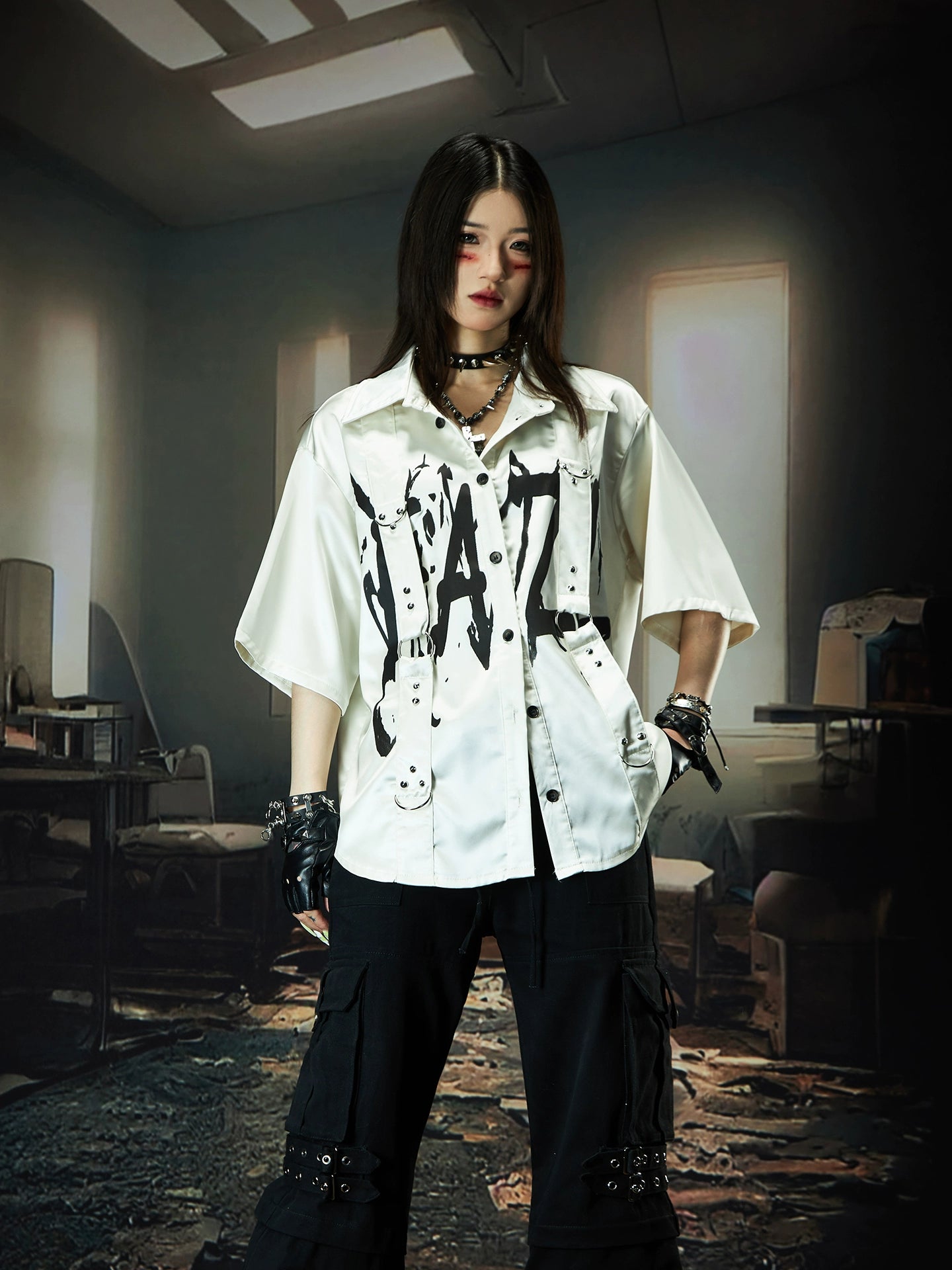 Graphic Letter Print Strap Patchwork Turn-Down Collar Short Sleeve Shirt WN18486