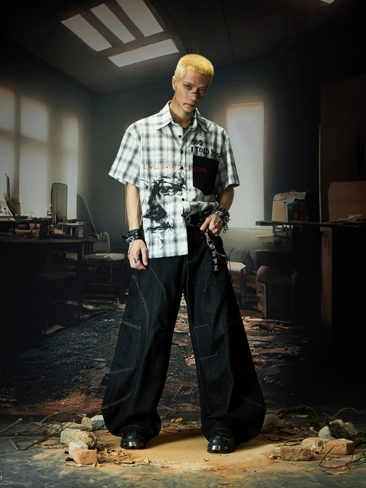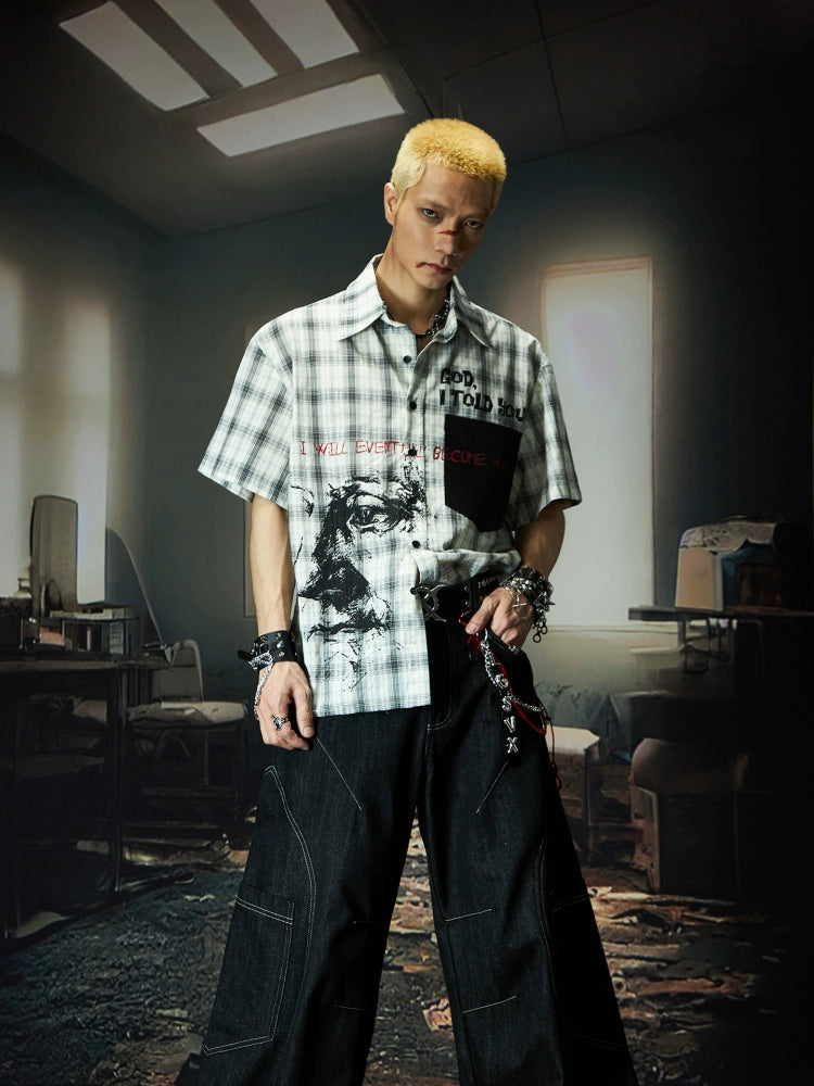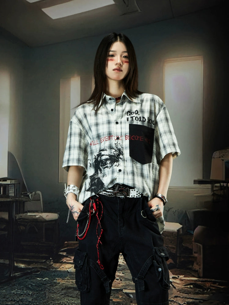 Graffiti Plaid Damage Colorblock Pocket Patchwork Oversize Short Sleeve Shirt WN18490