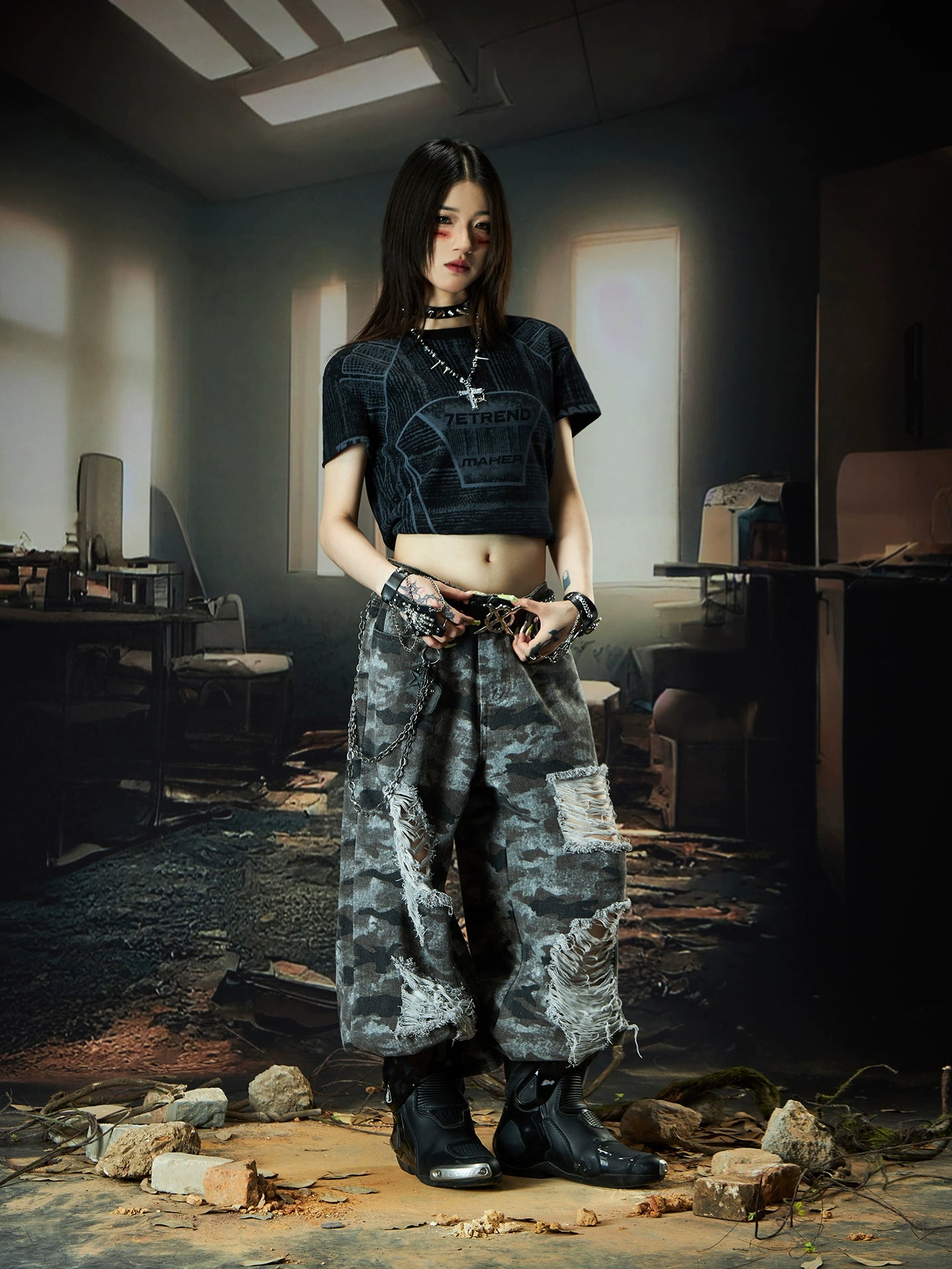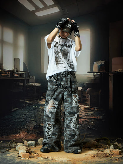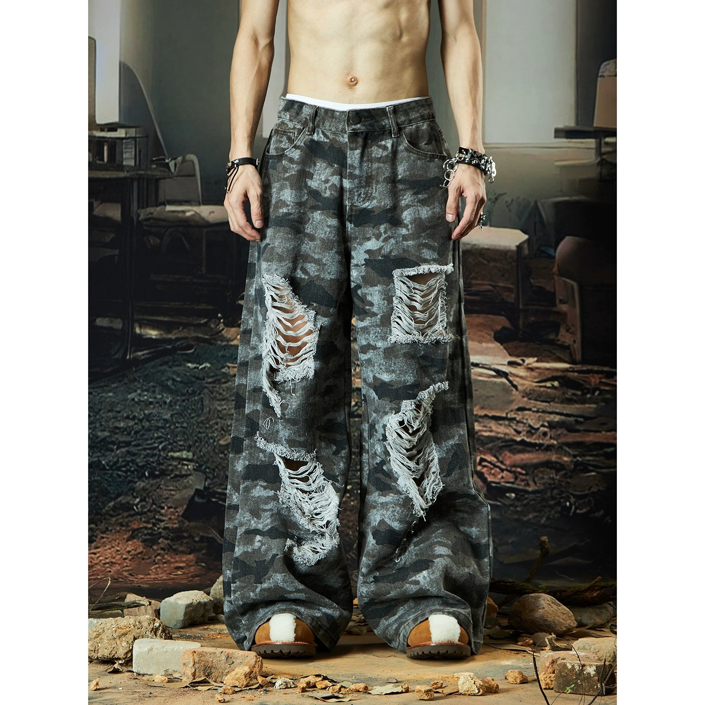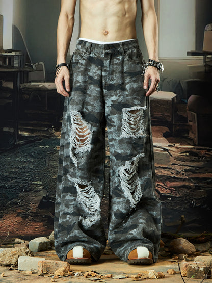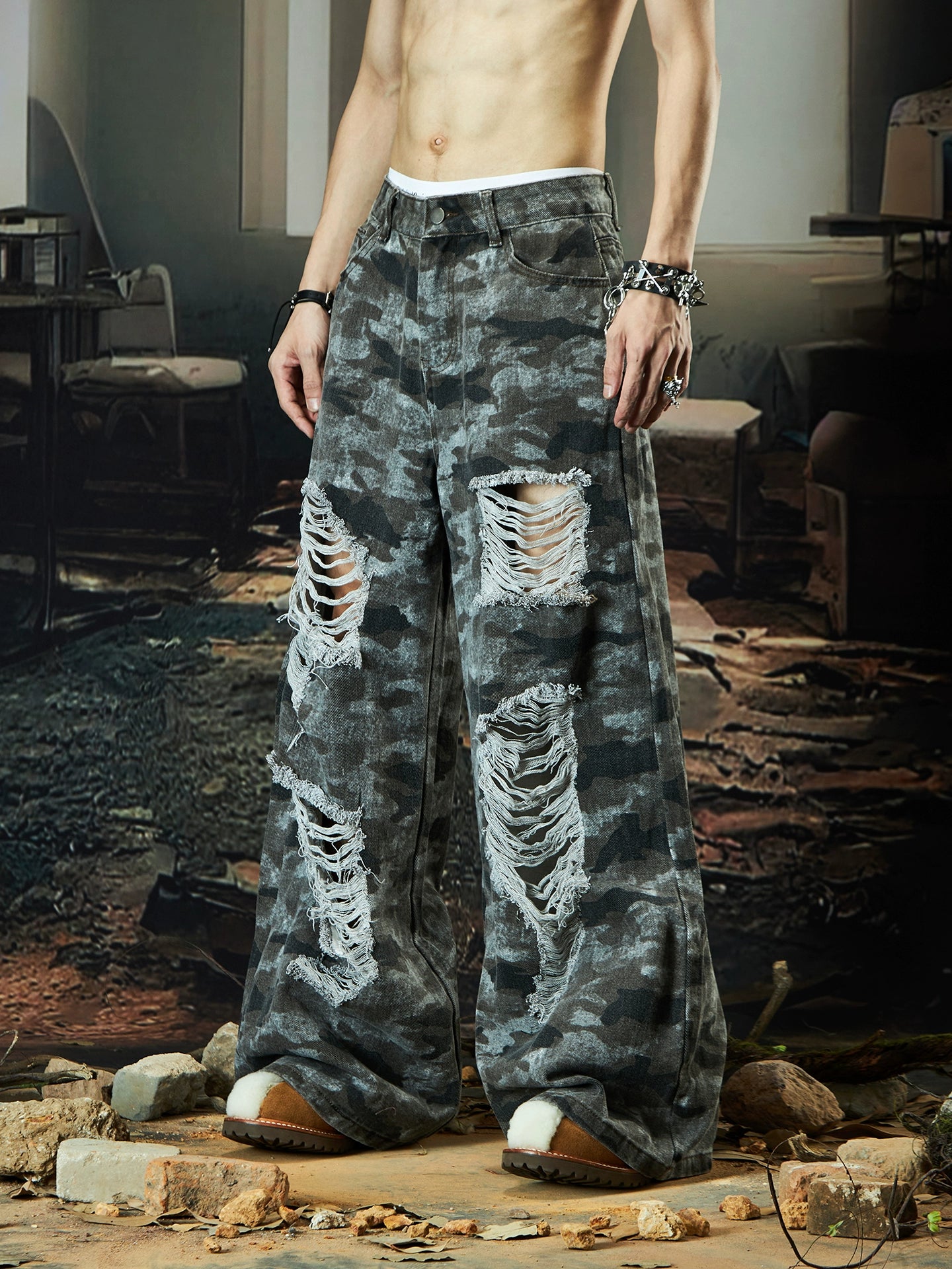 Camouflage Ripped Wide Leg Cargo Pants WN18515