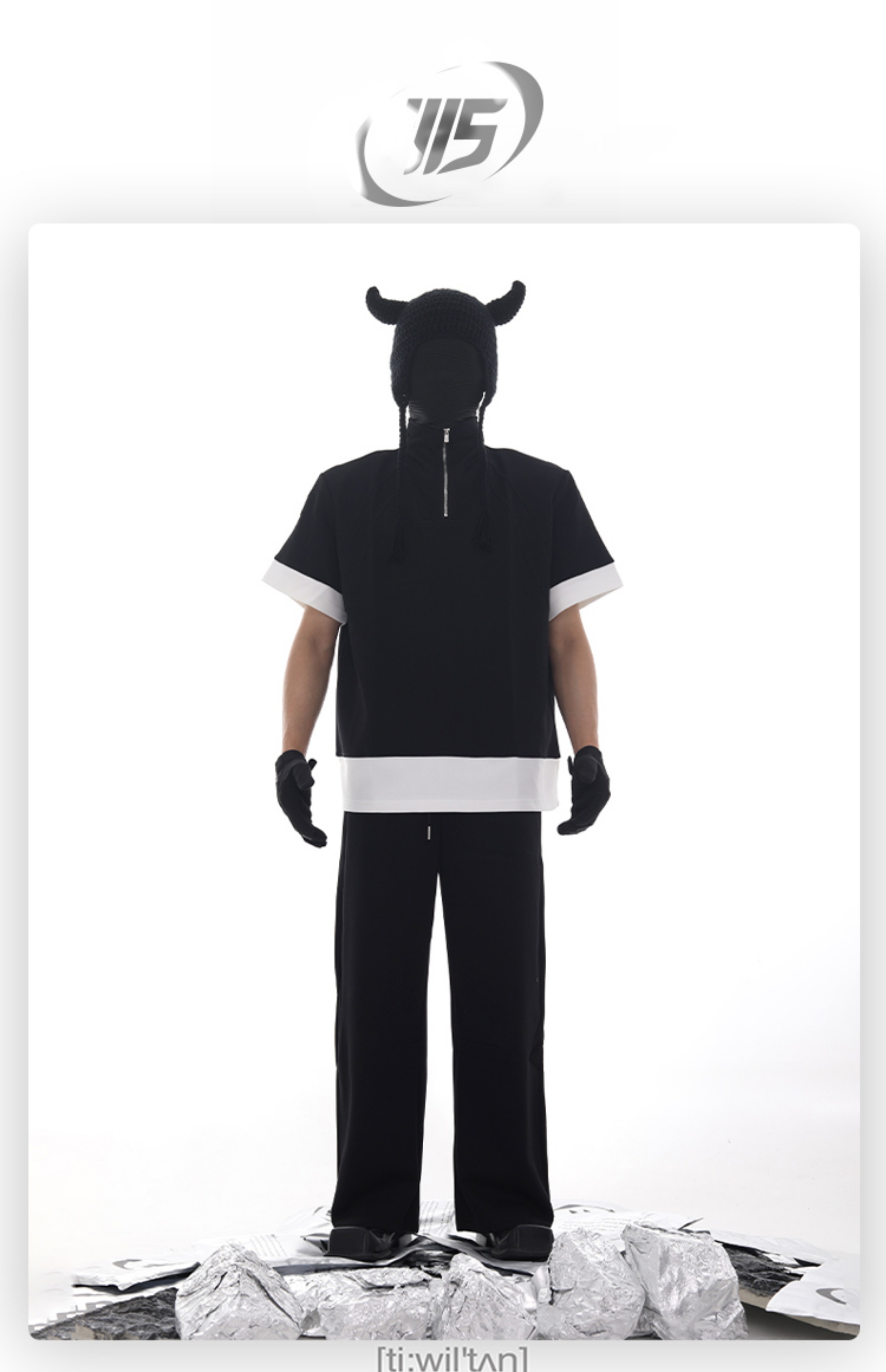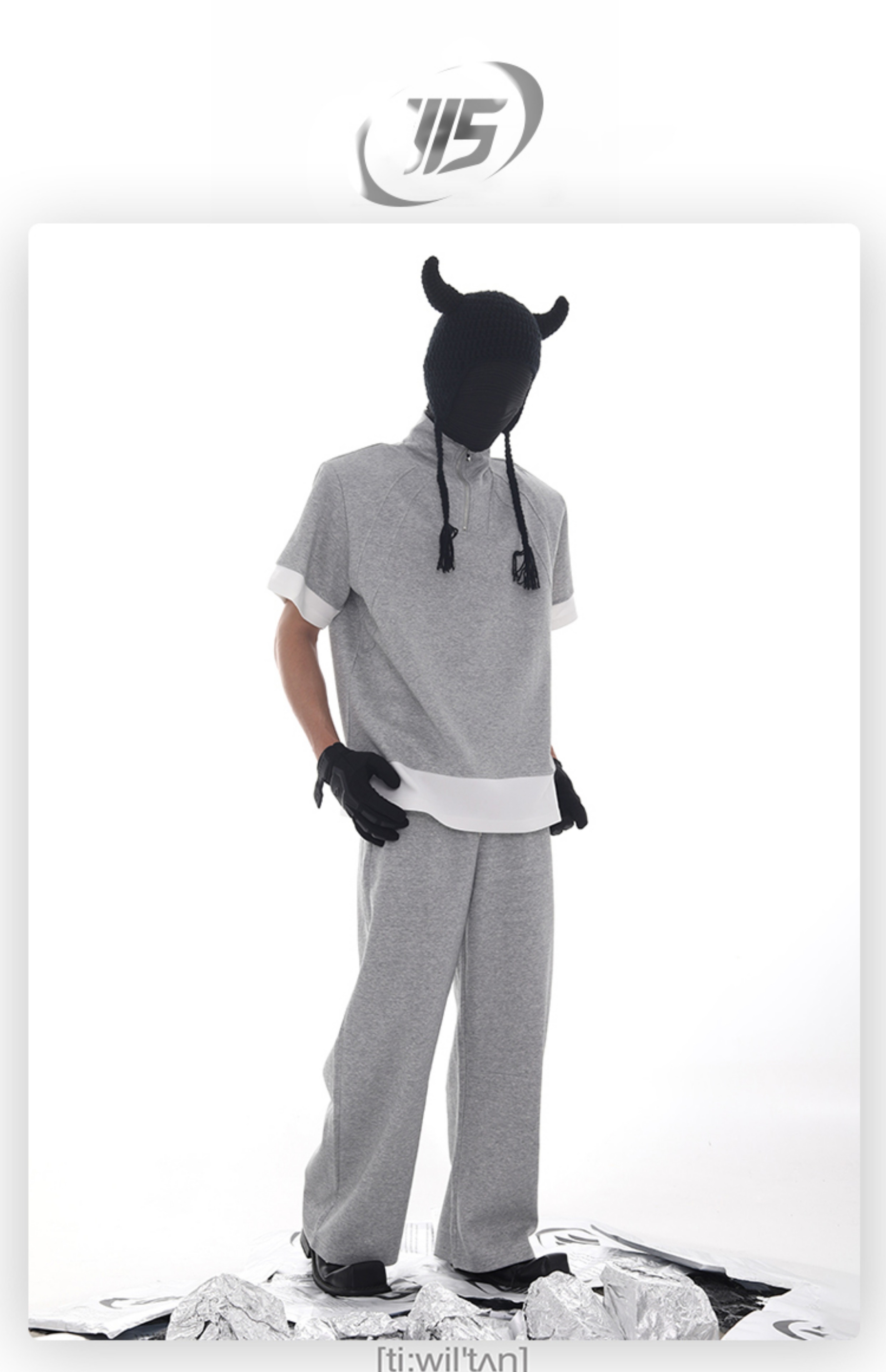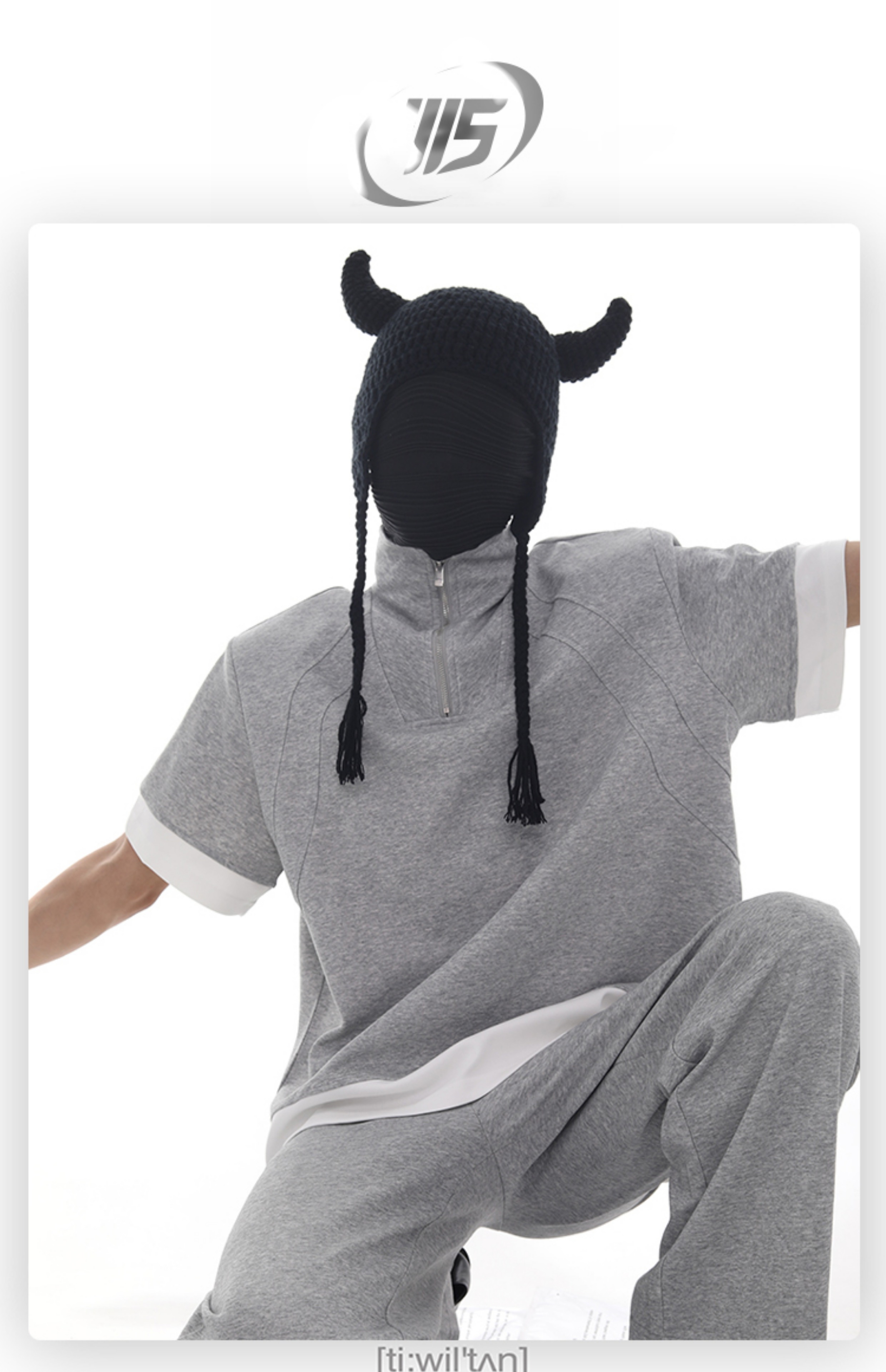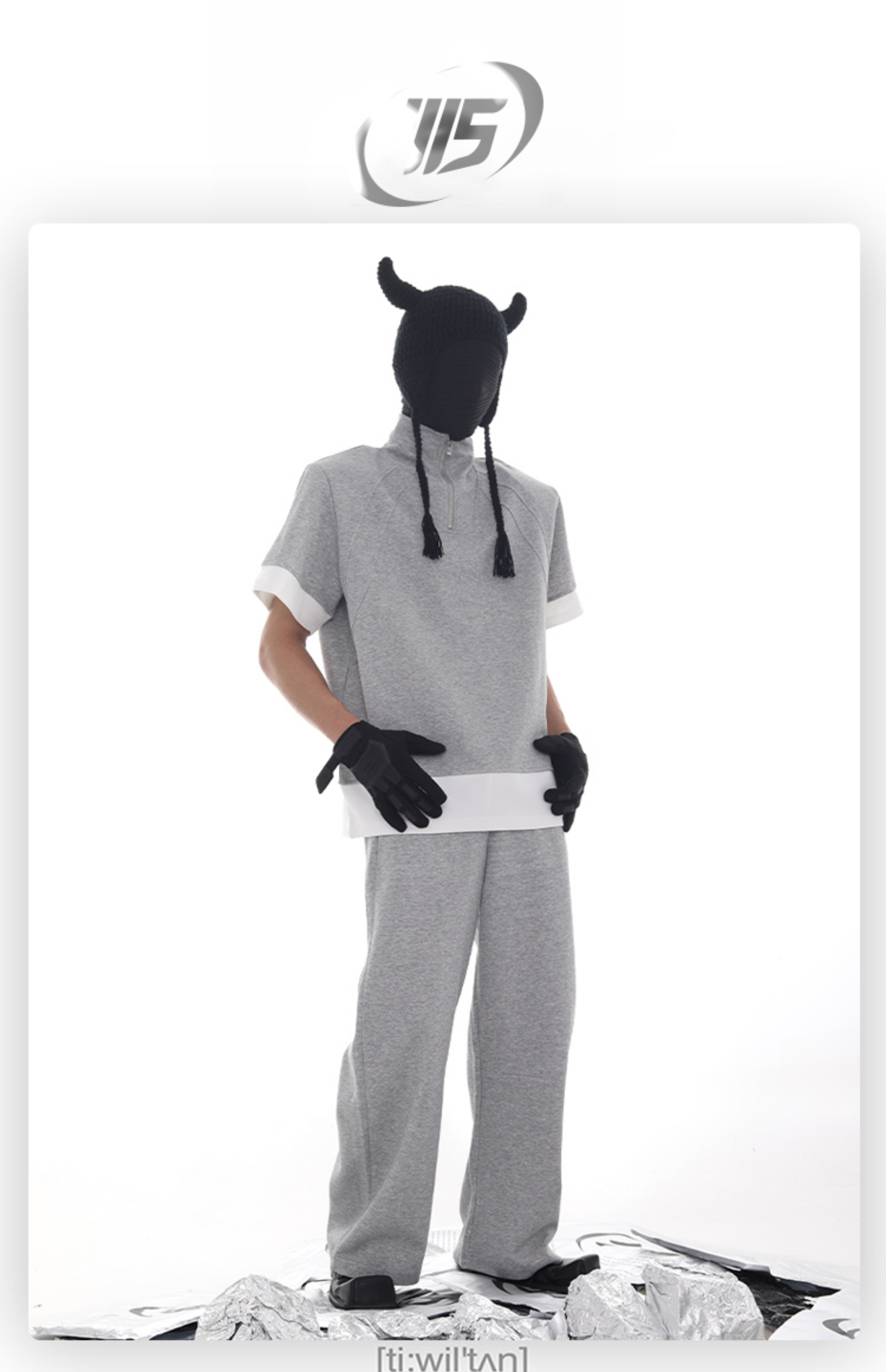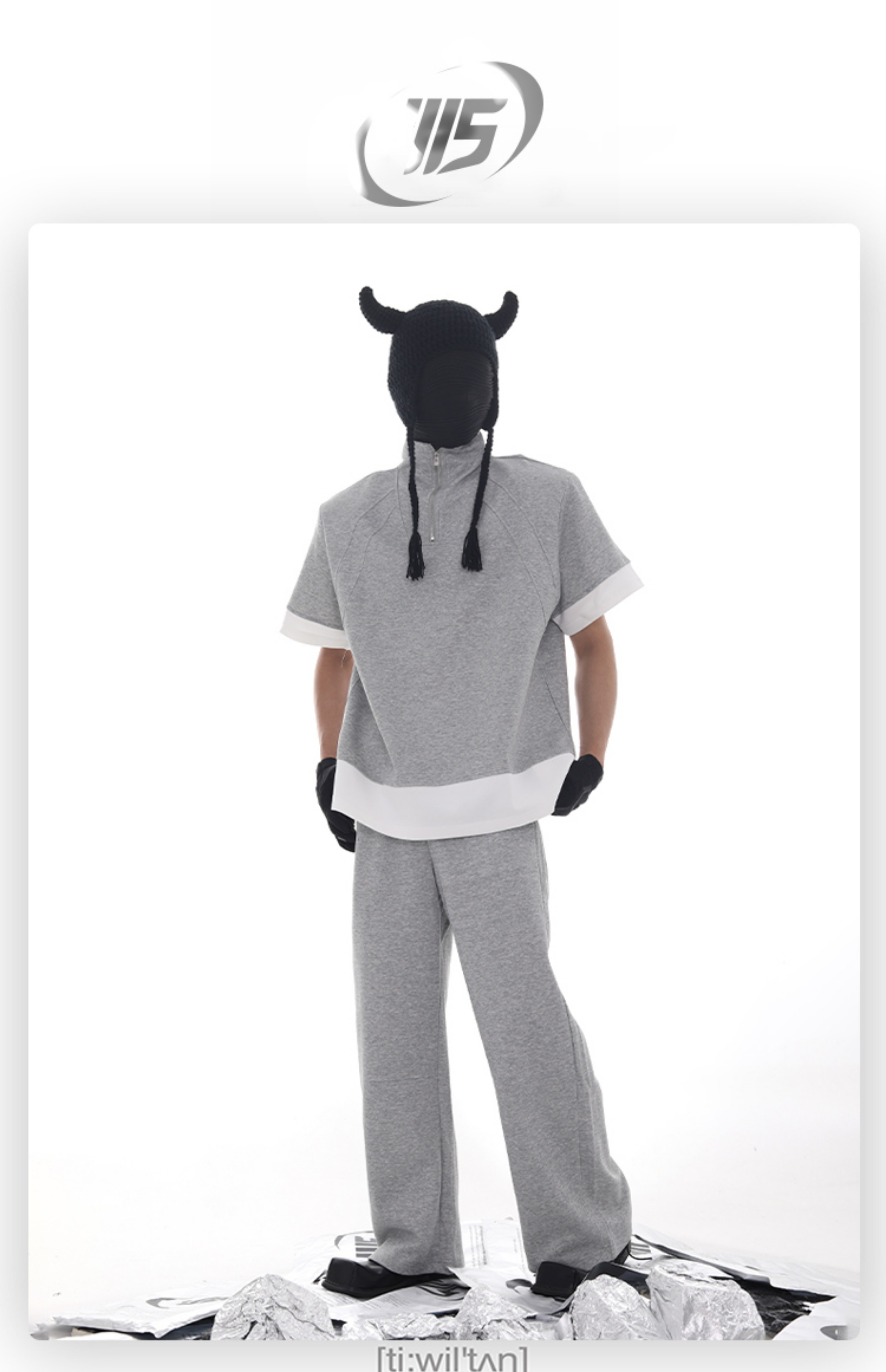 Half Zipper Stand Neck Shoulder-Pad Short Sleeve T-Shirt & Sweatpants Setup WN18620