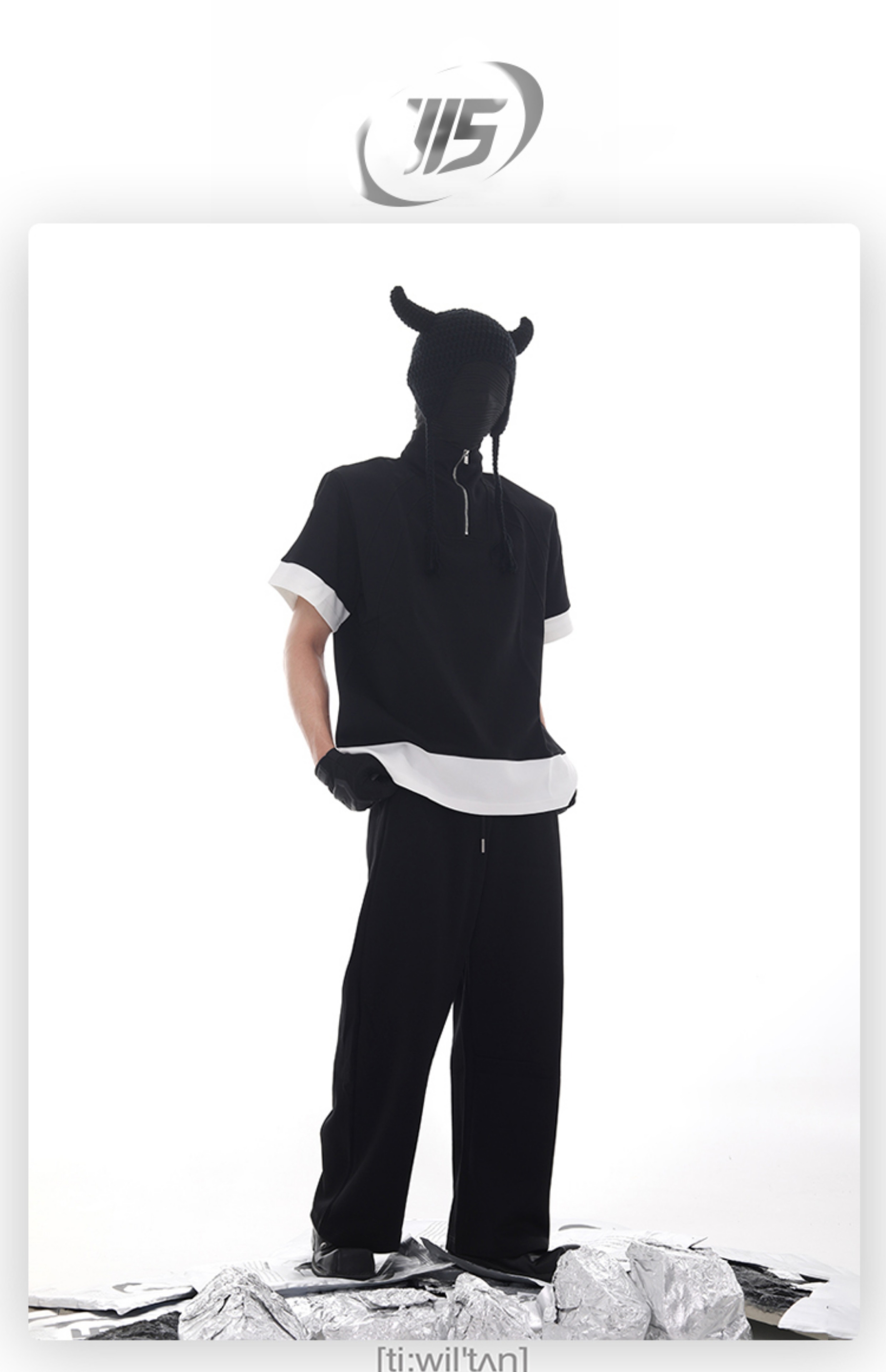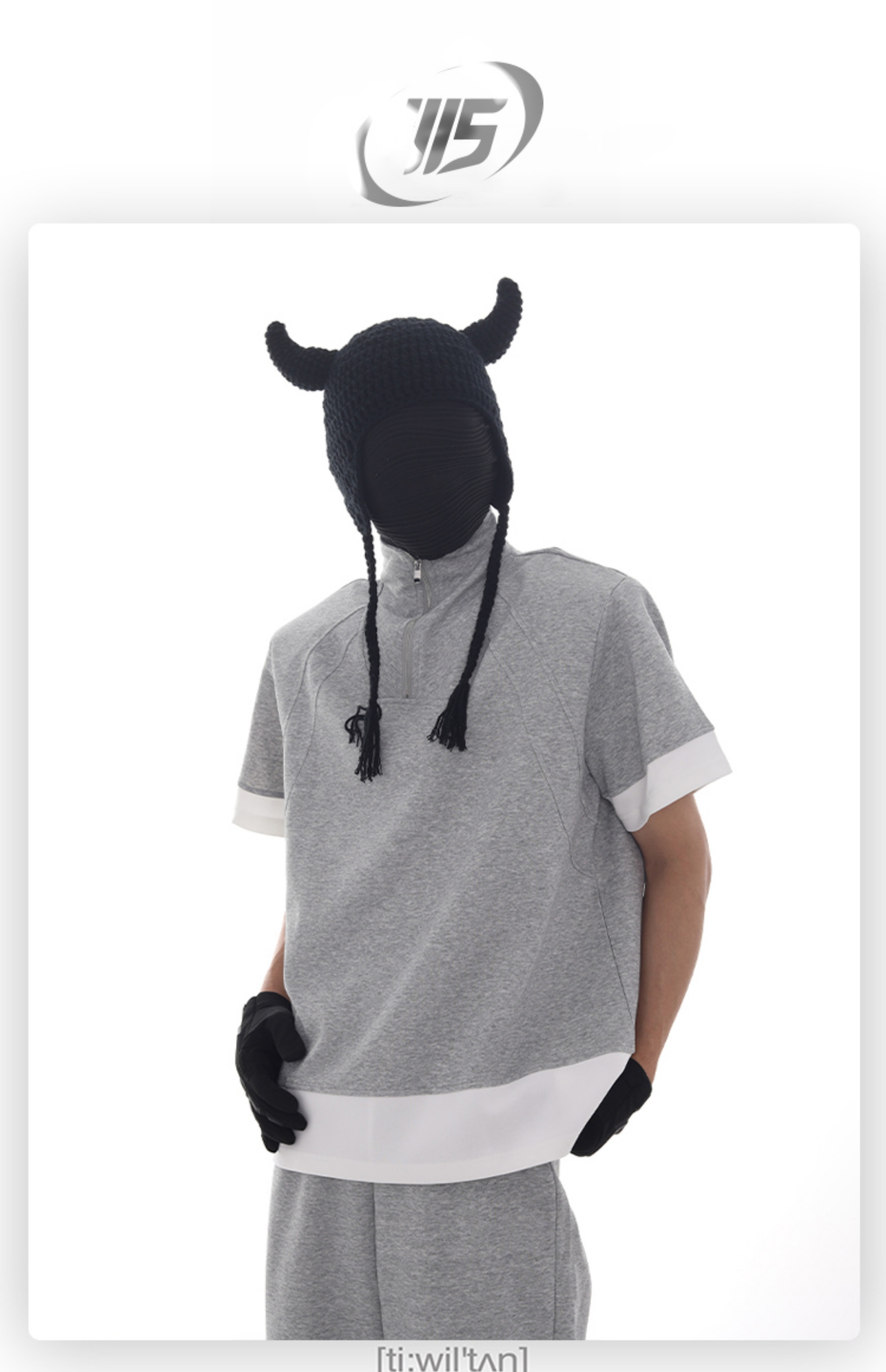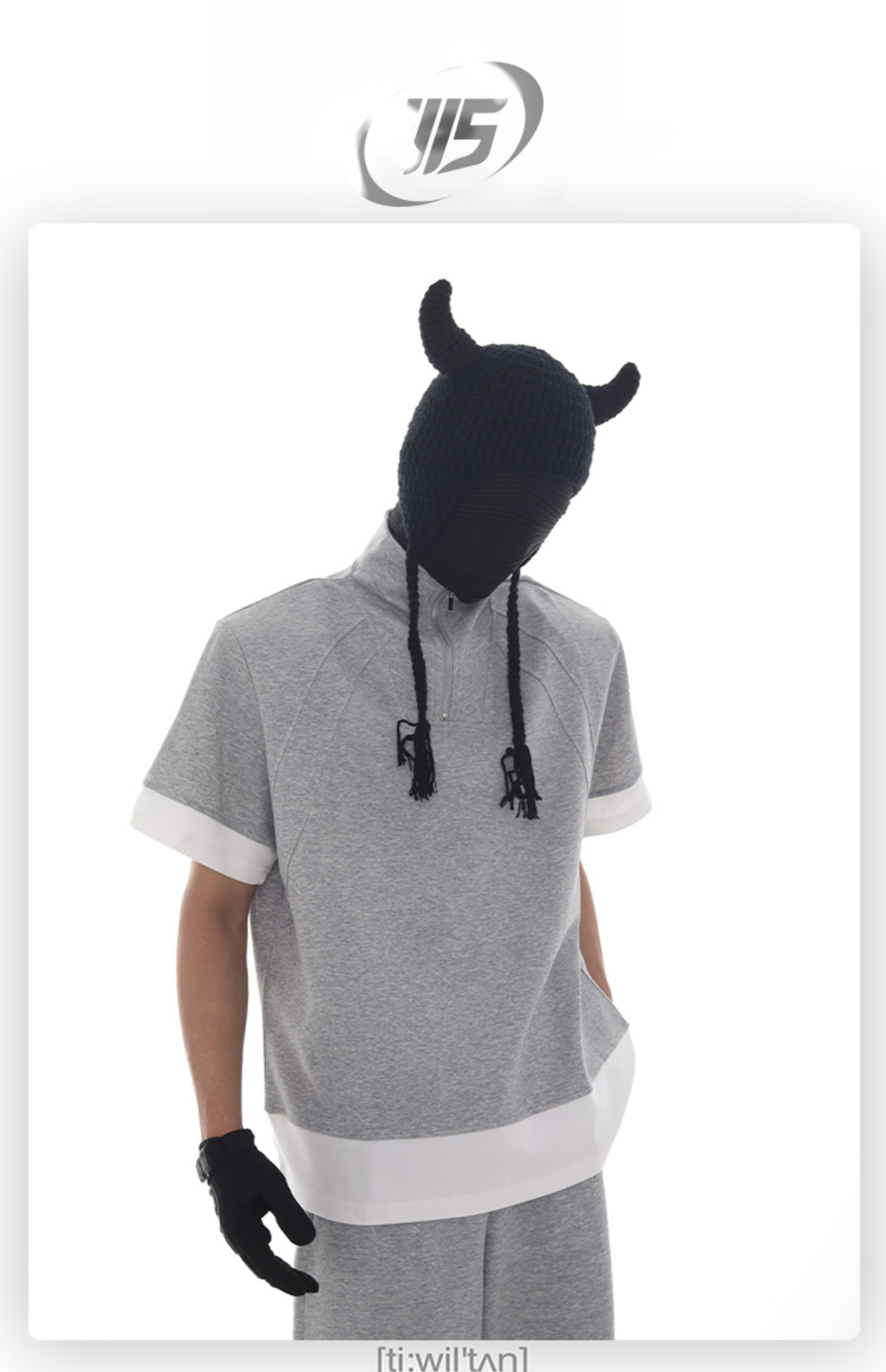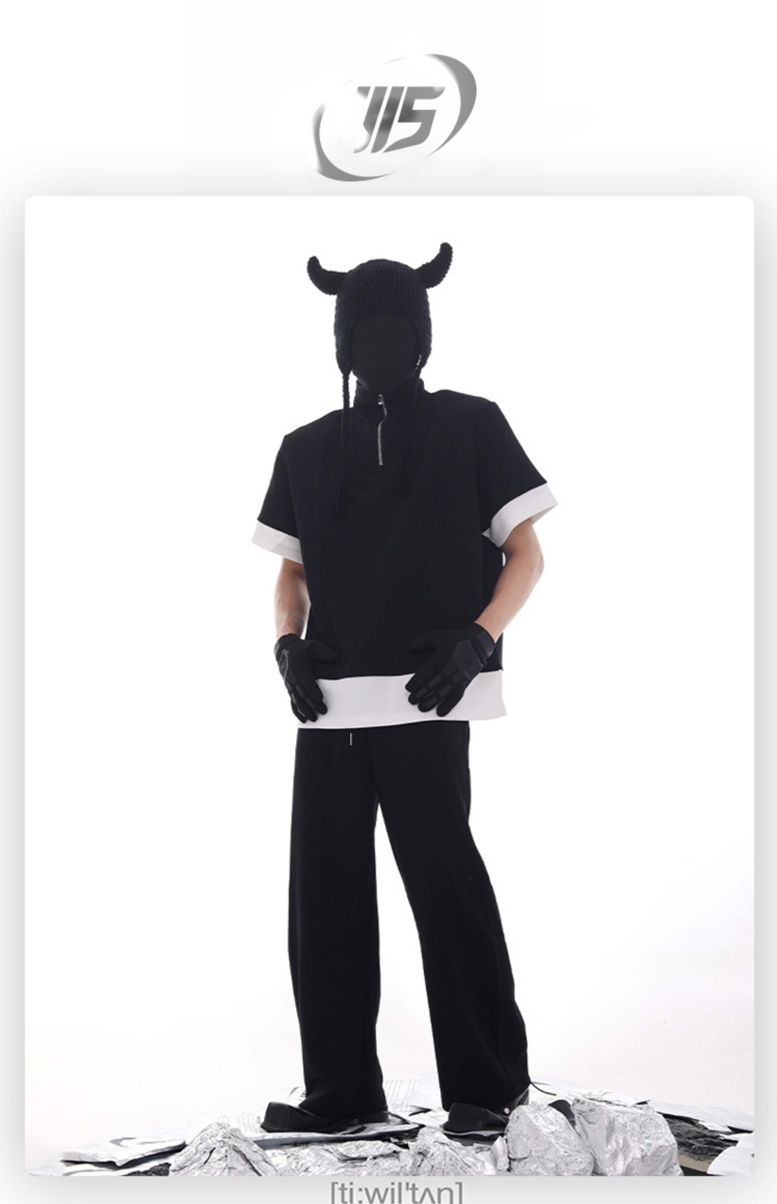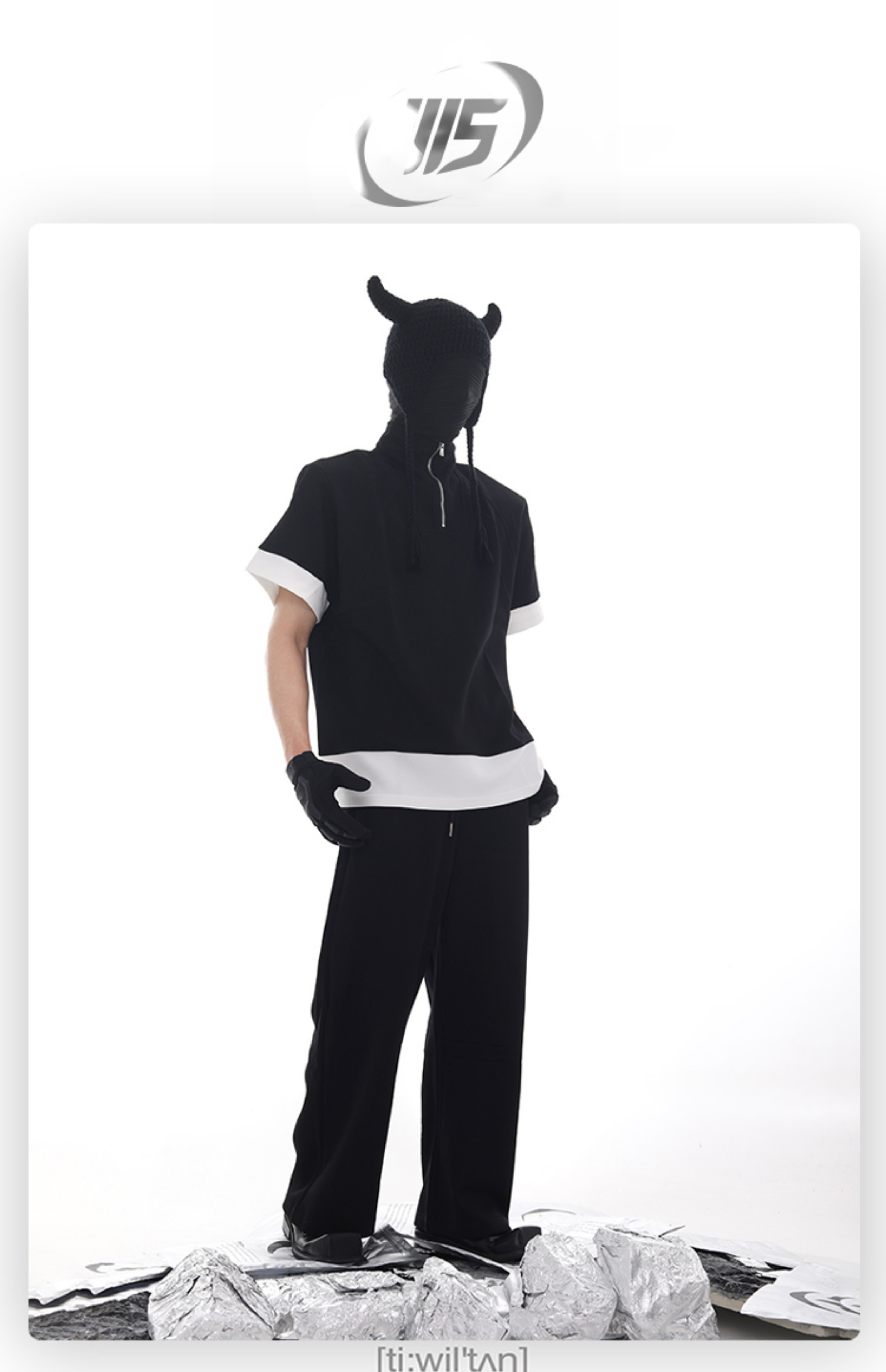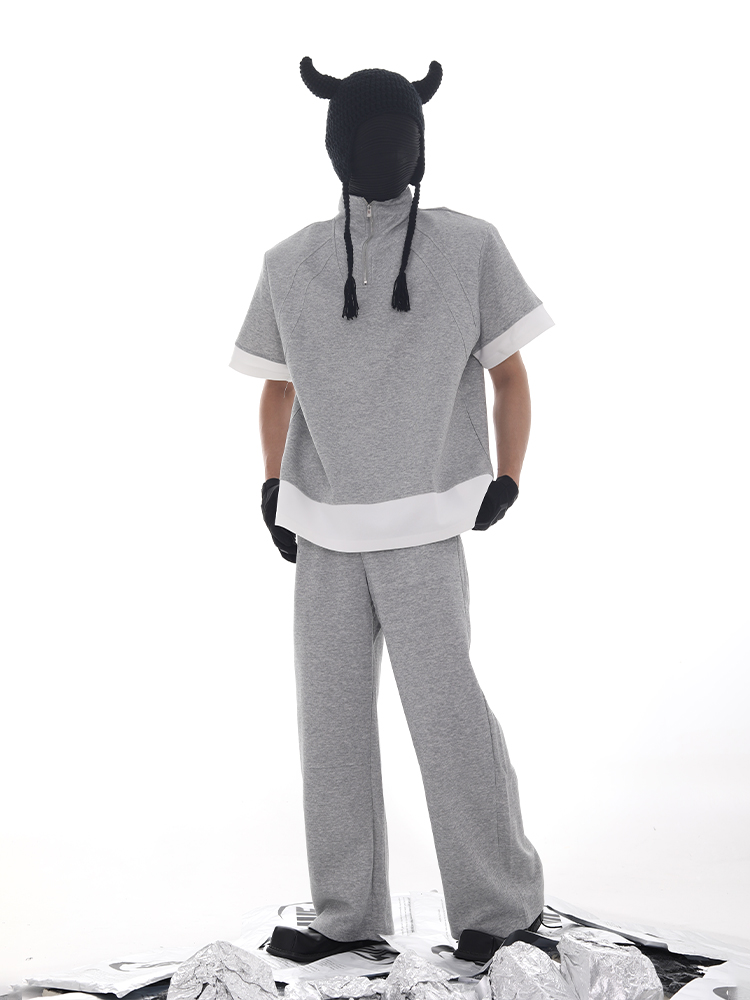 Half Zipper Stand Neck Shoulder-Pad Short Sleeve T-Shirt & Sweatpants Setup WN18620