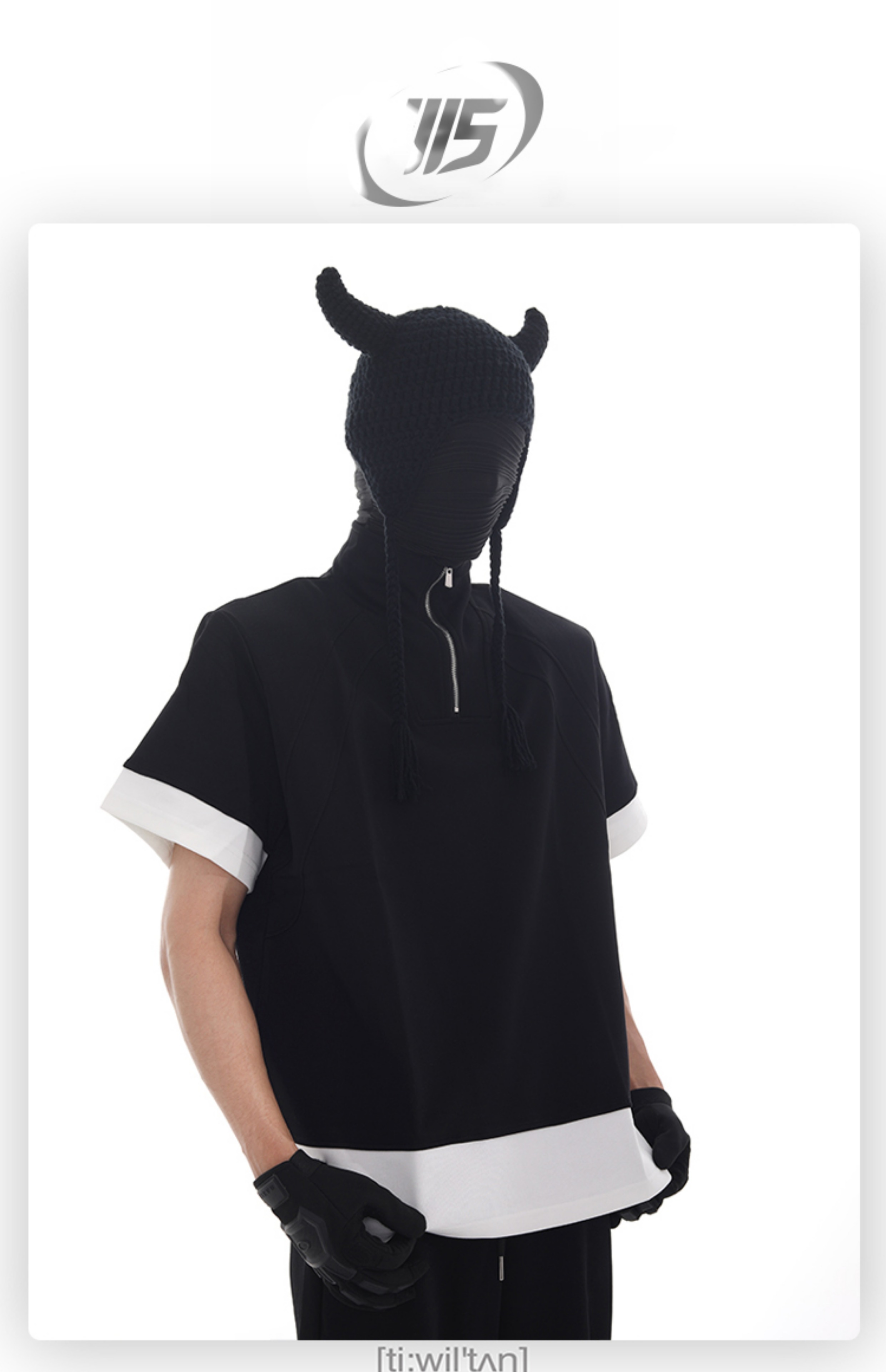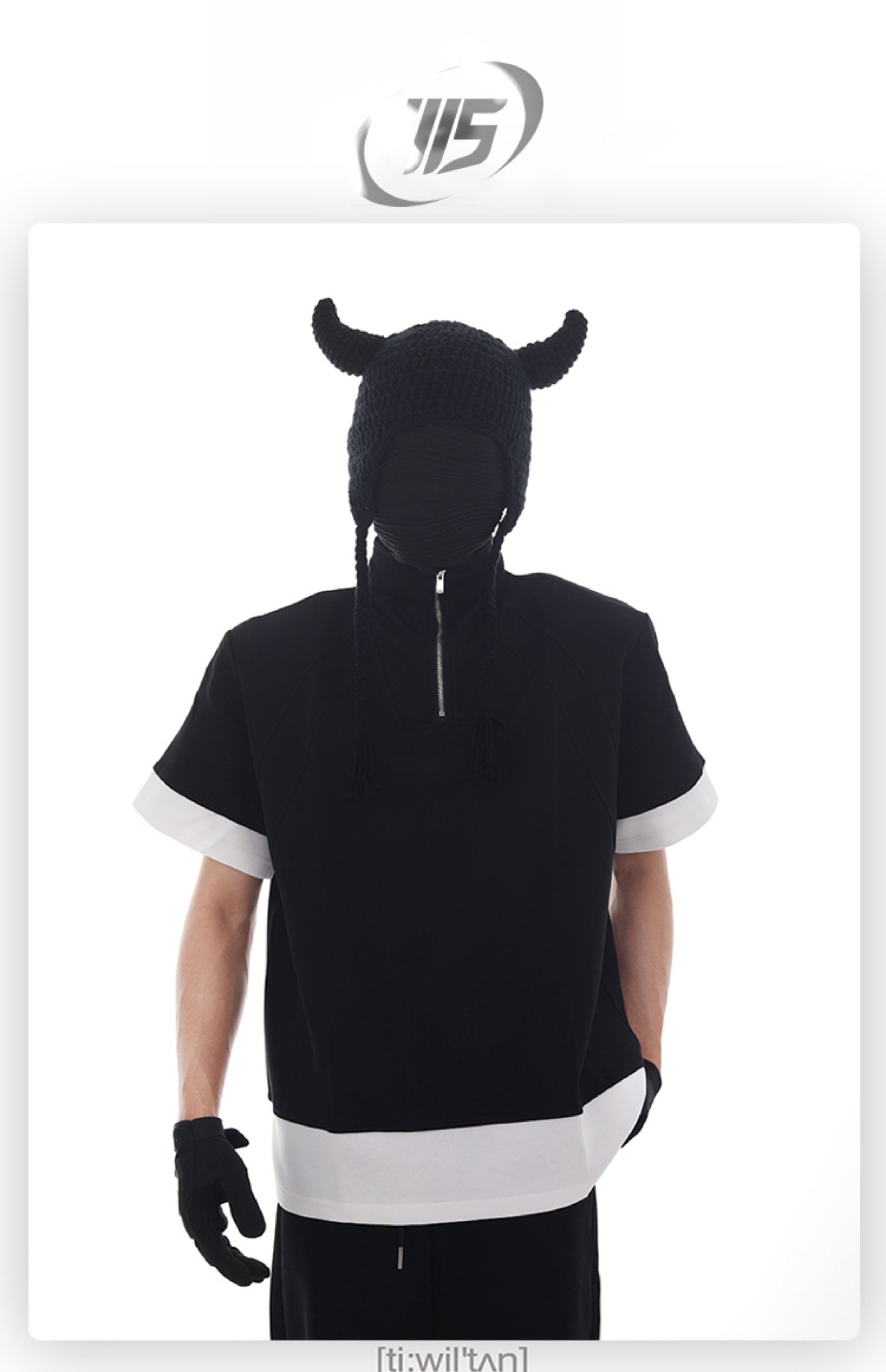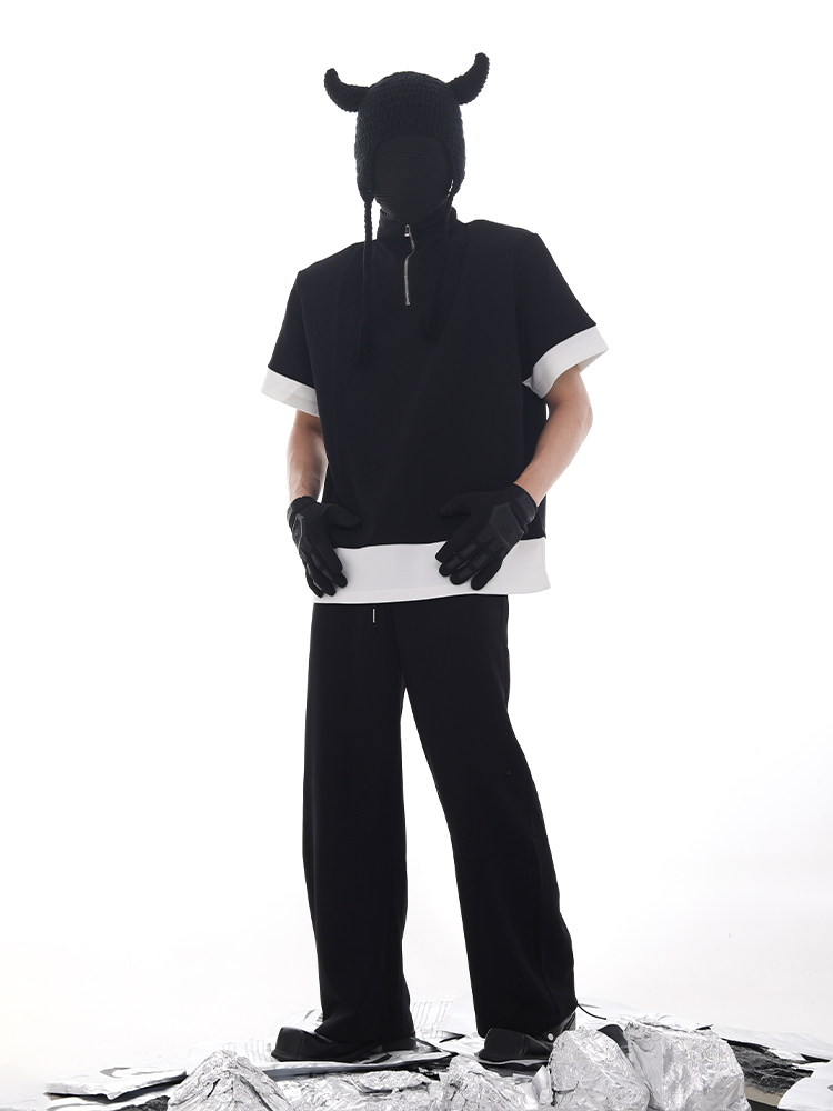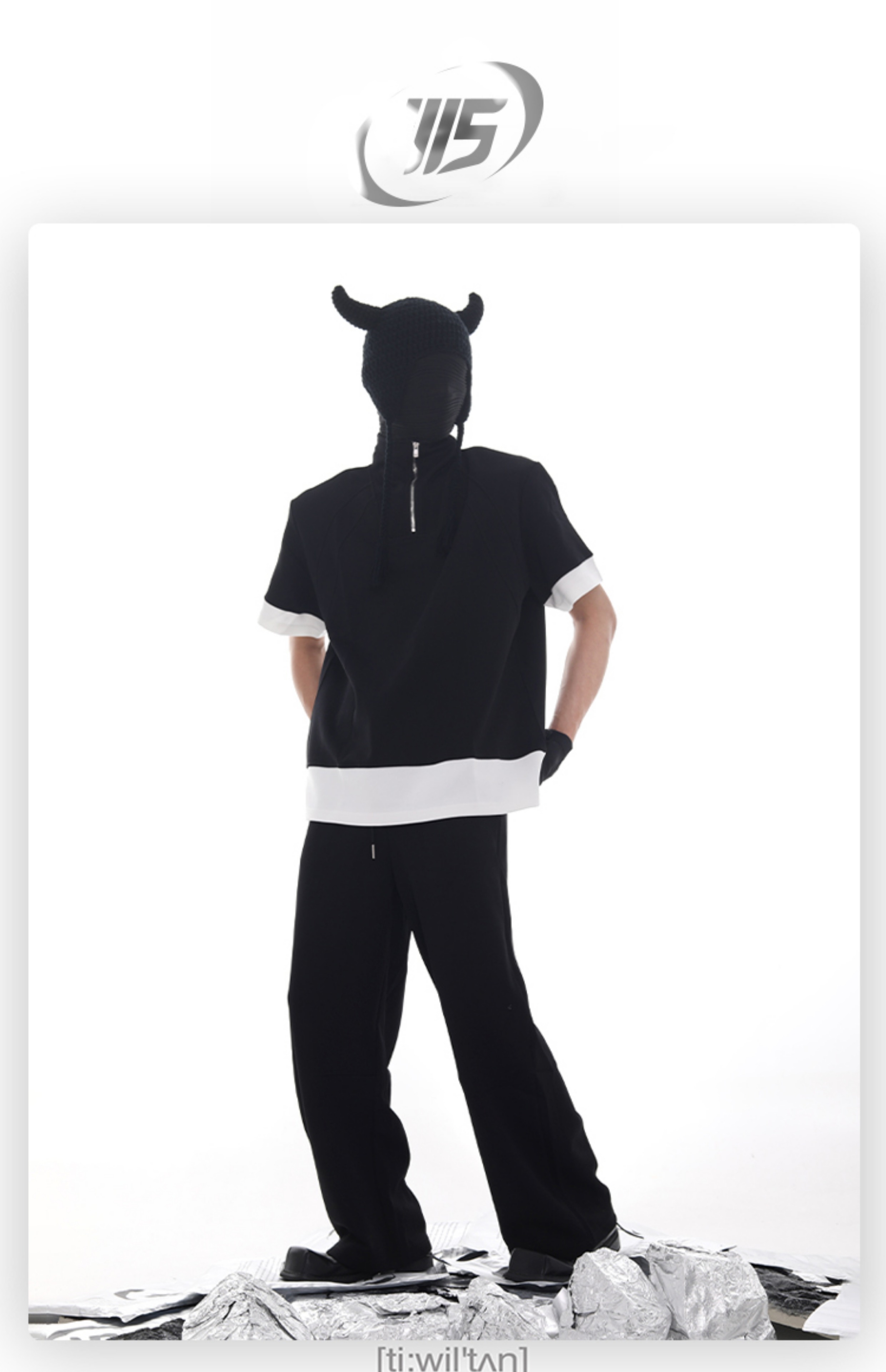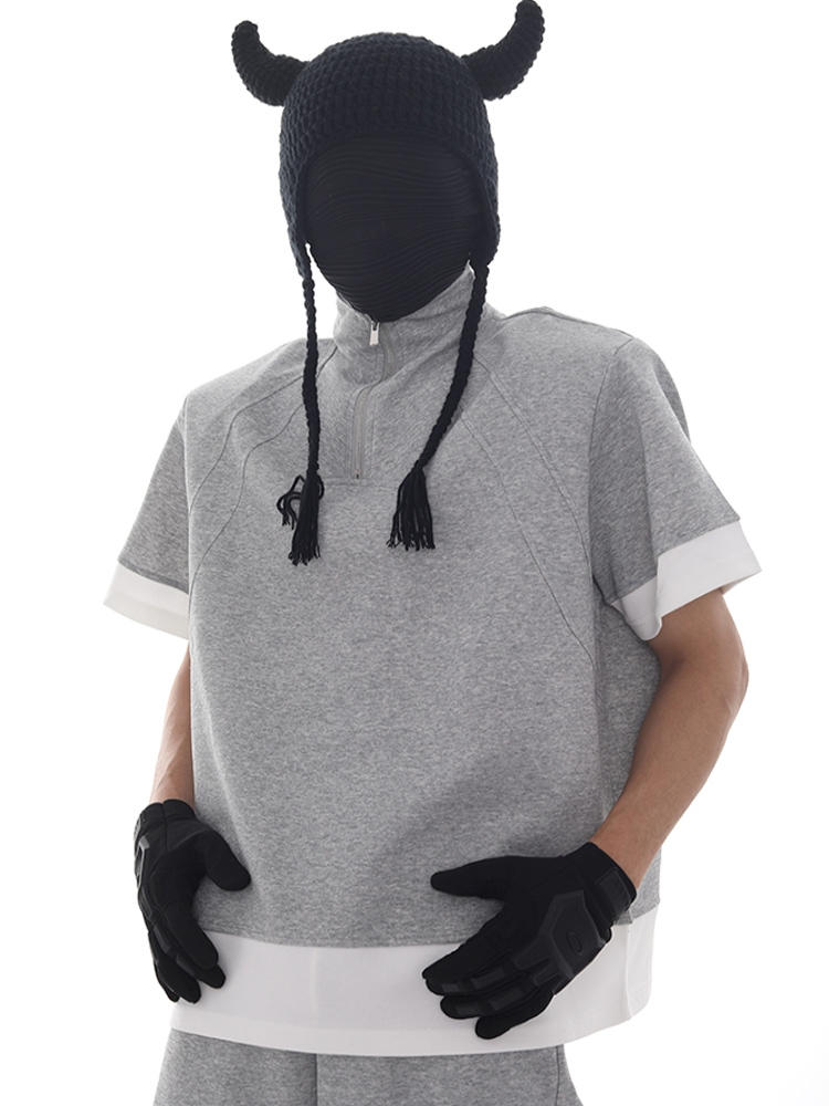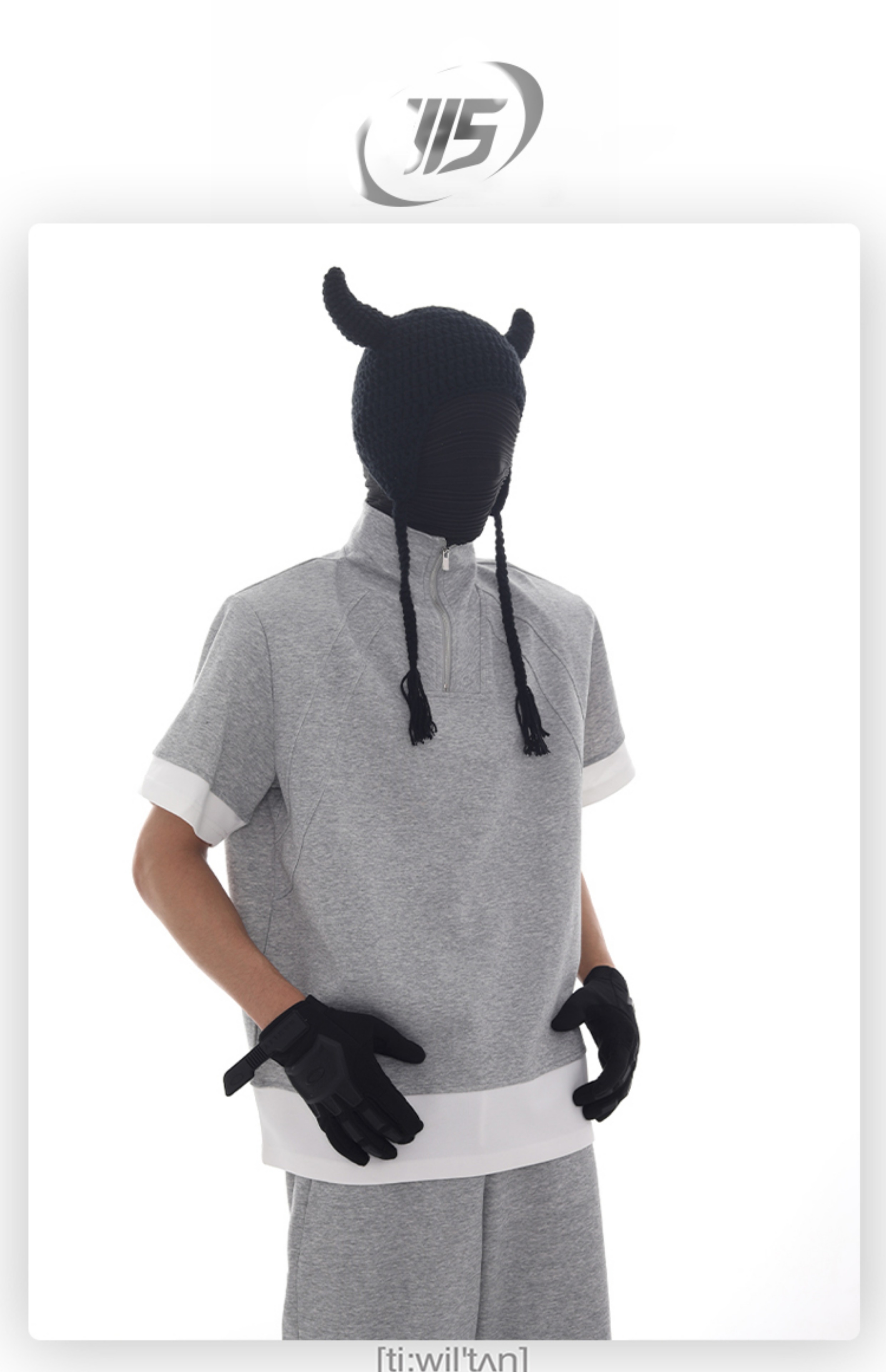 Half Zipper Stand Neck Shoulder-Pad Short Sleeve T-Shirt & Sweatpants Setup WN18620
