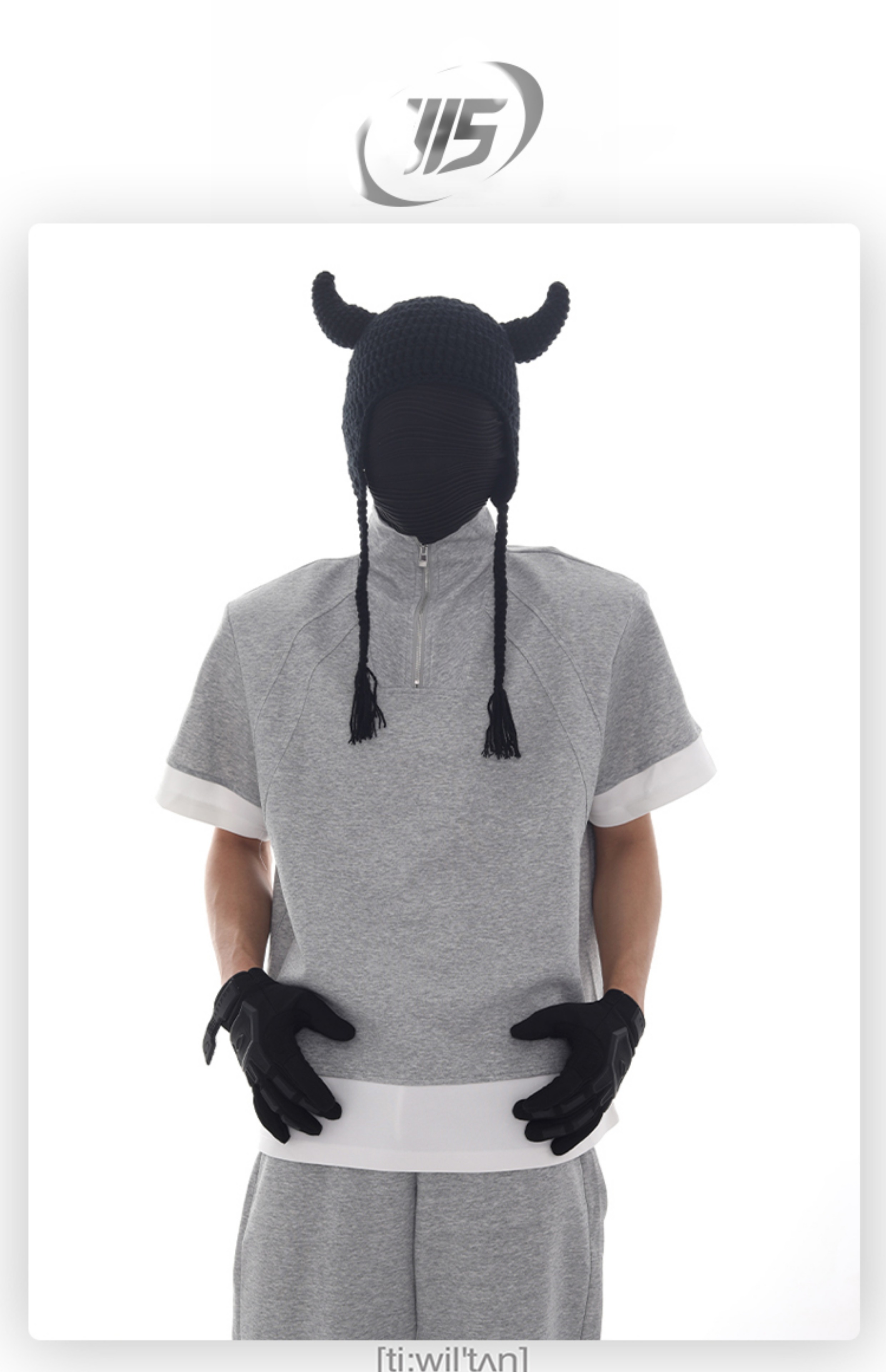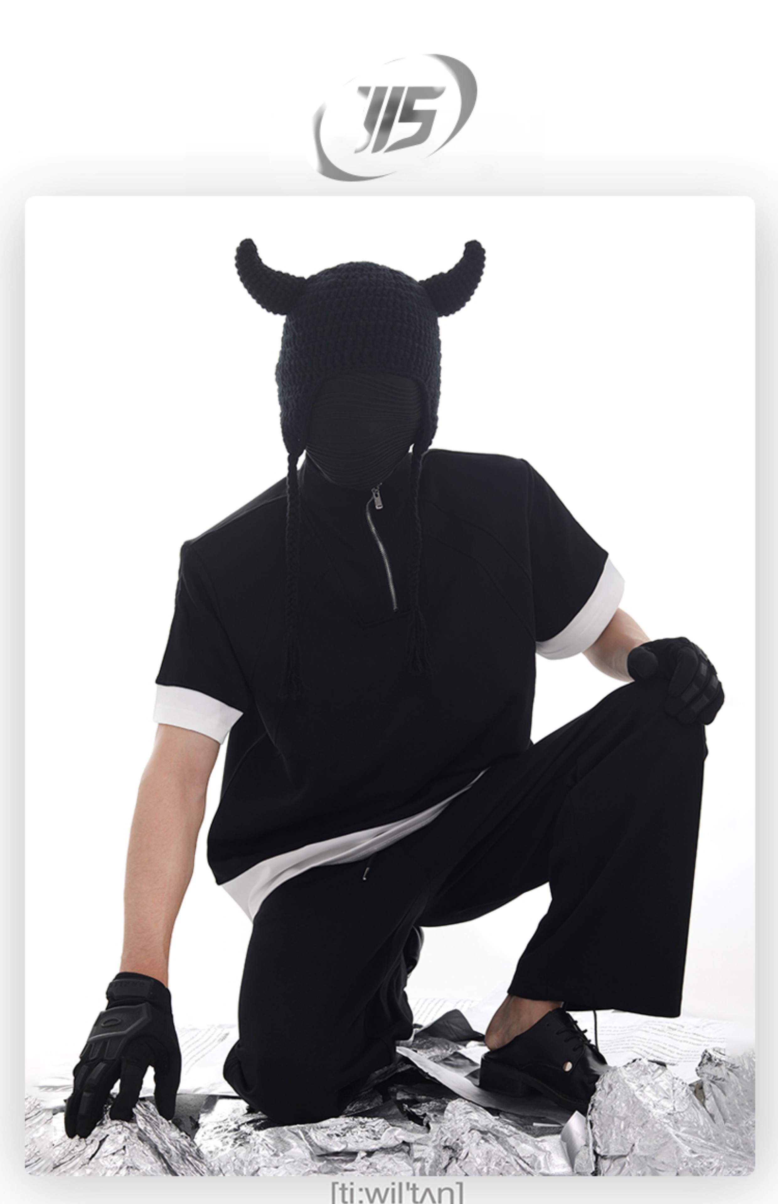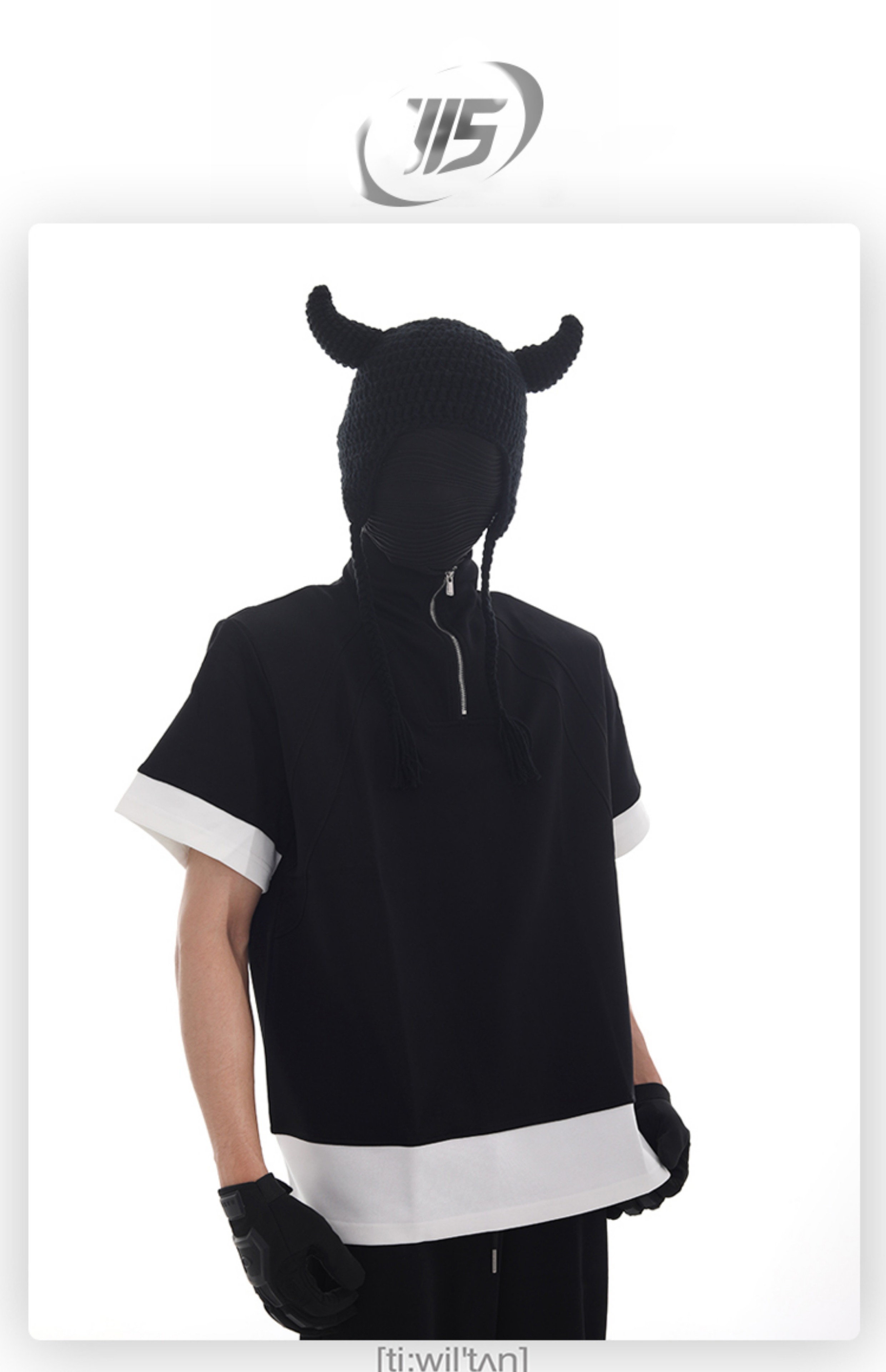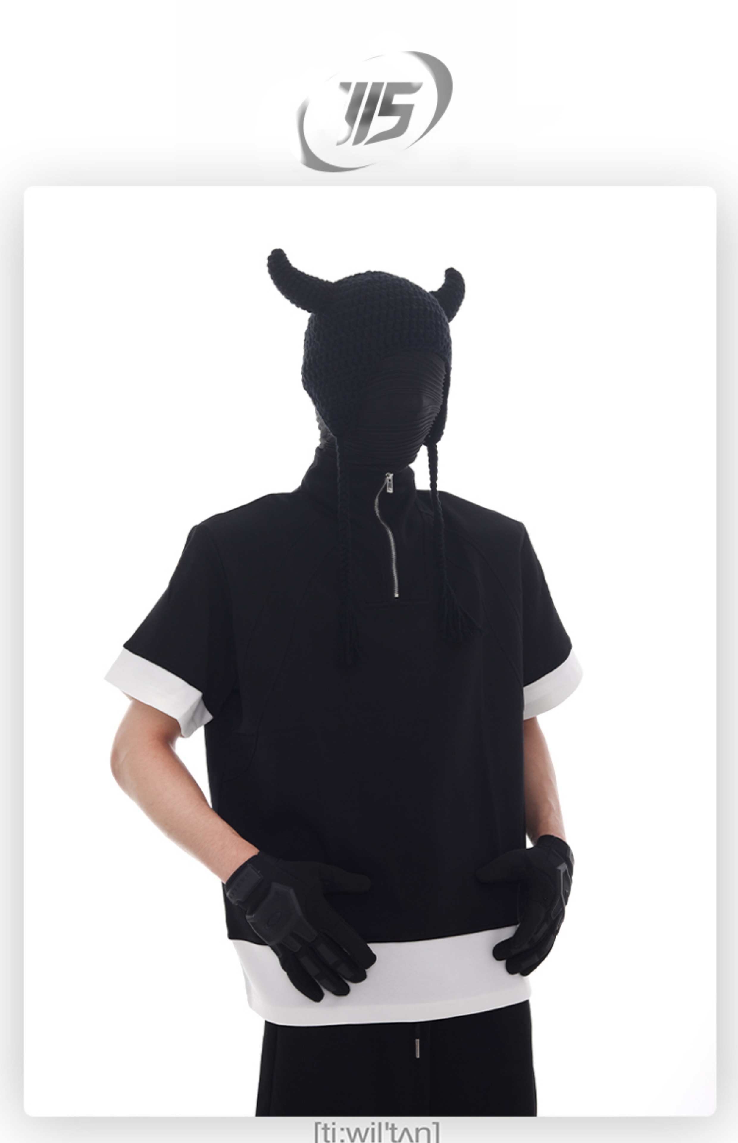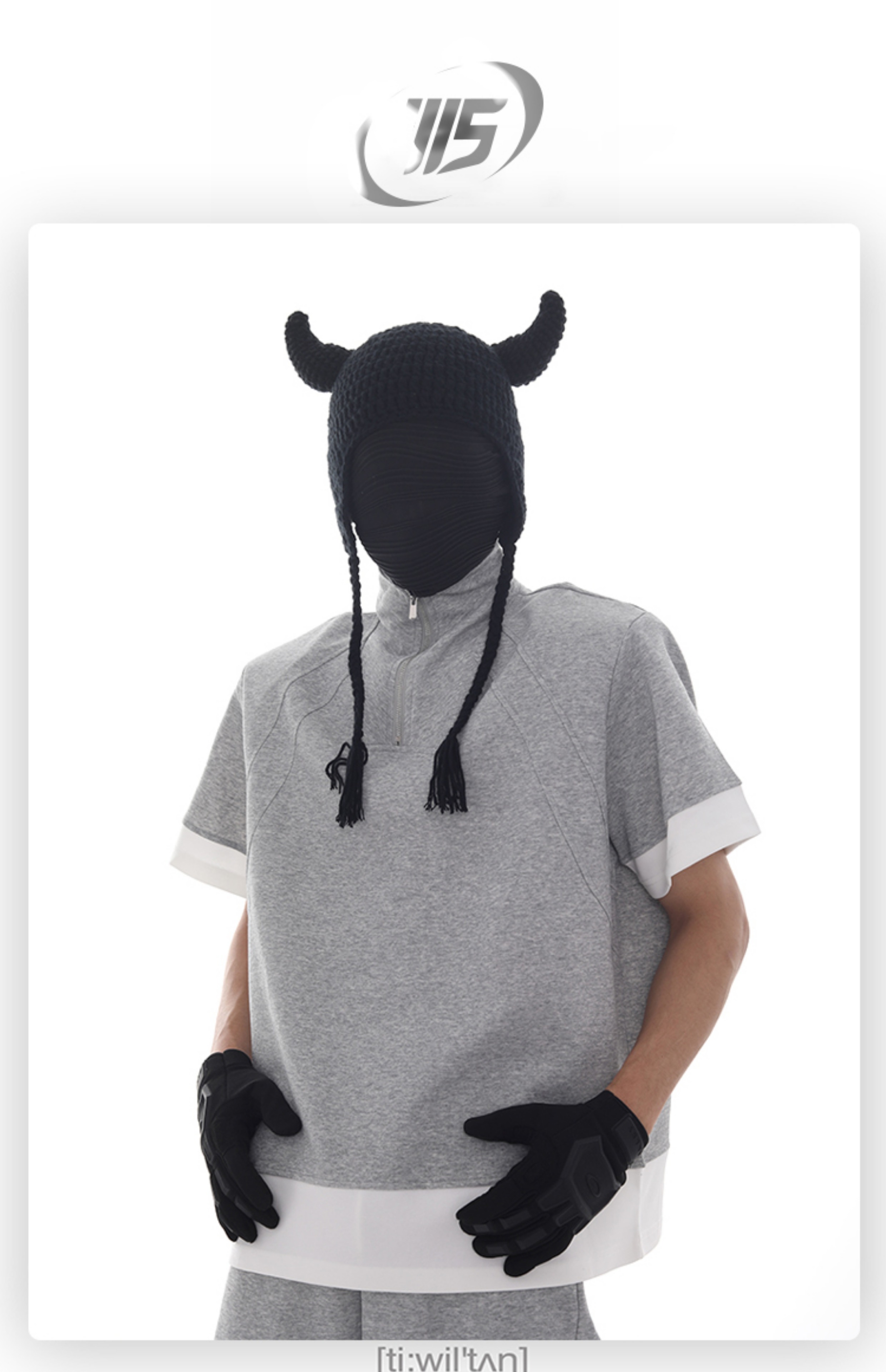 Half Zipper Stand Neck Shoulder-Pad Short Sleeve T-Shirt & Sweatpants Setup WN18620