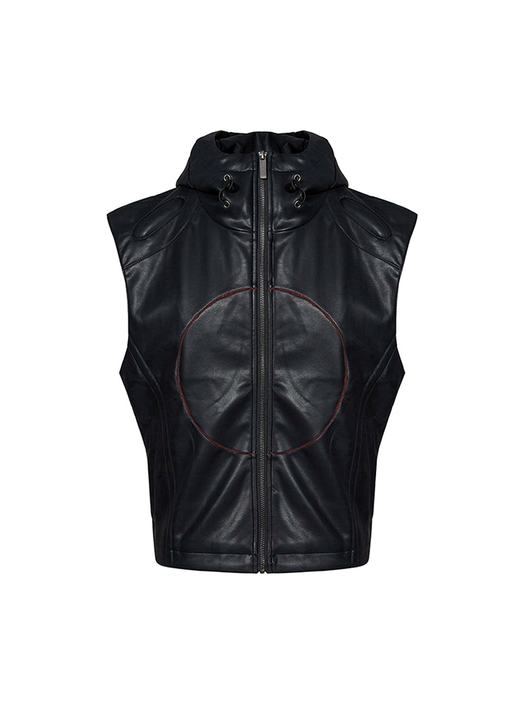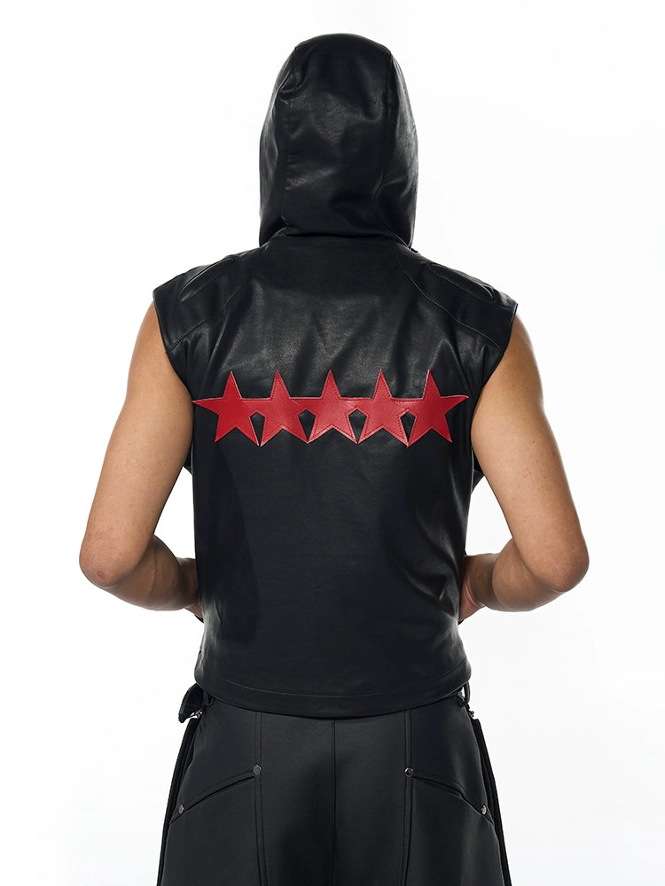 Star Patch PU Leather Hooded Zipper Vest WN18800