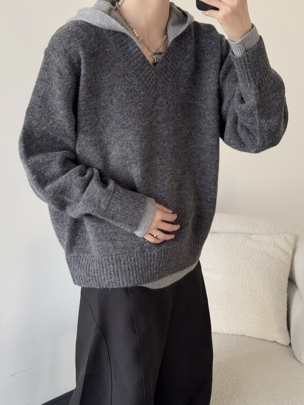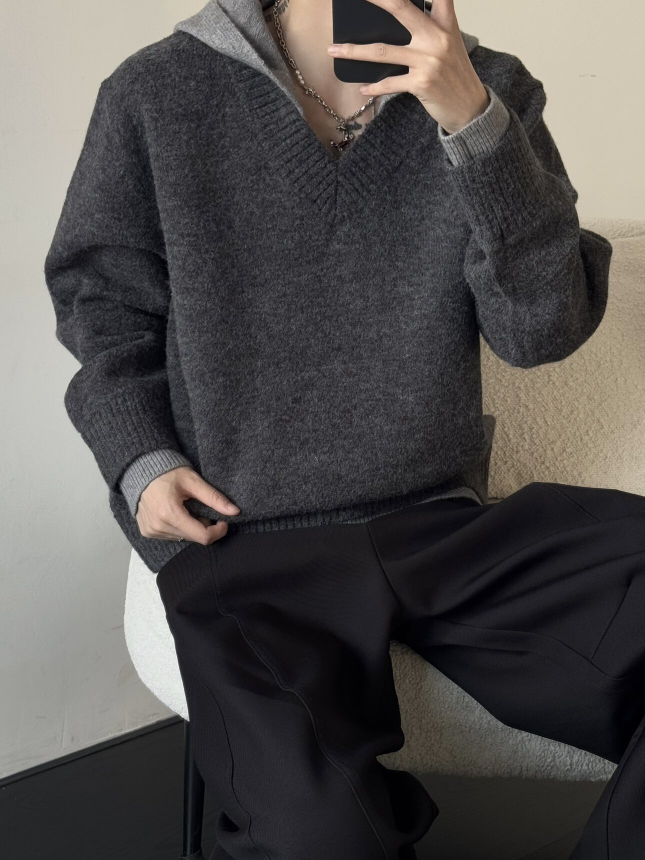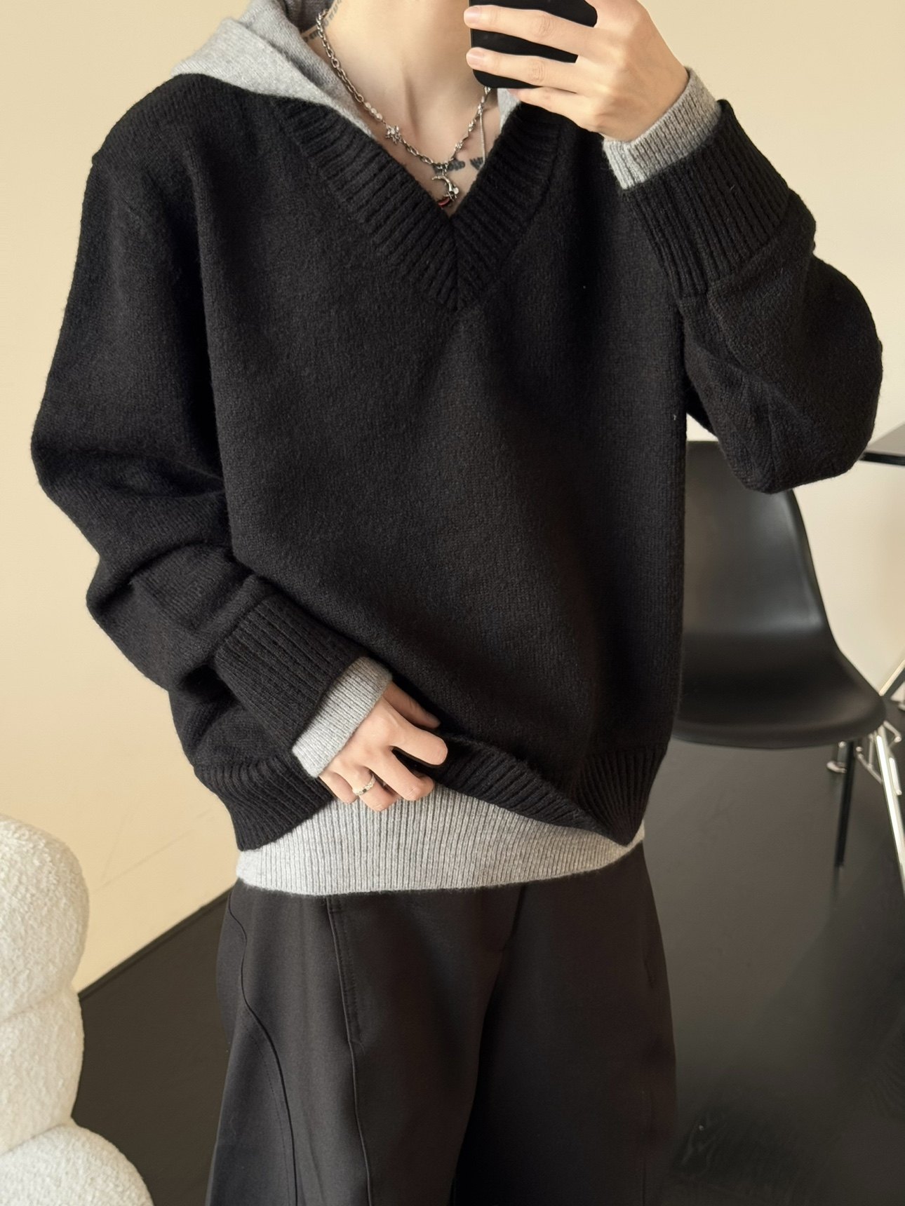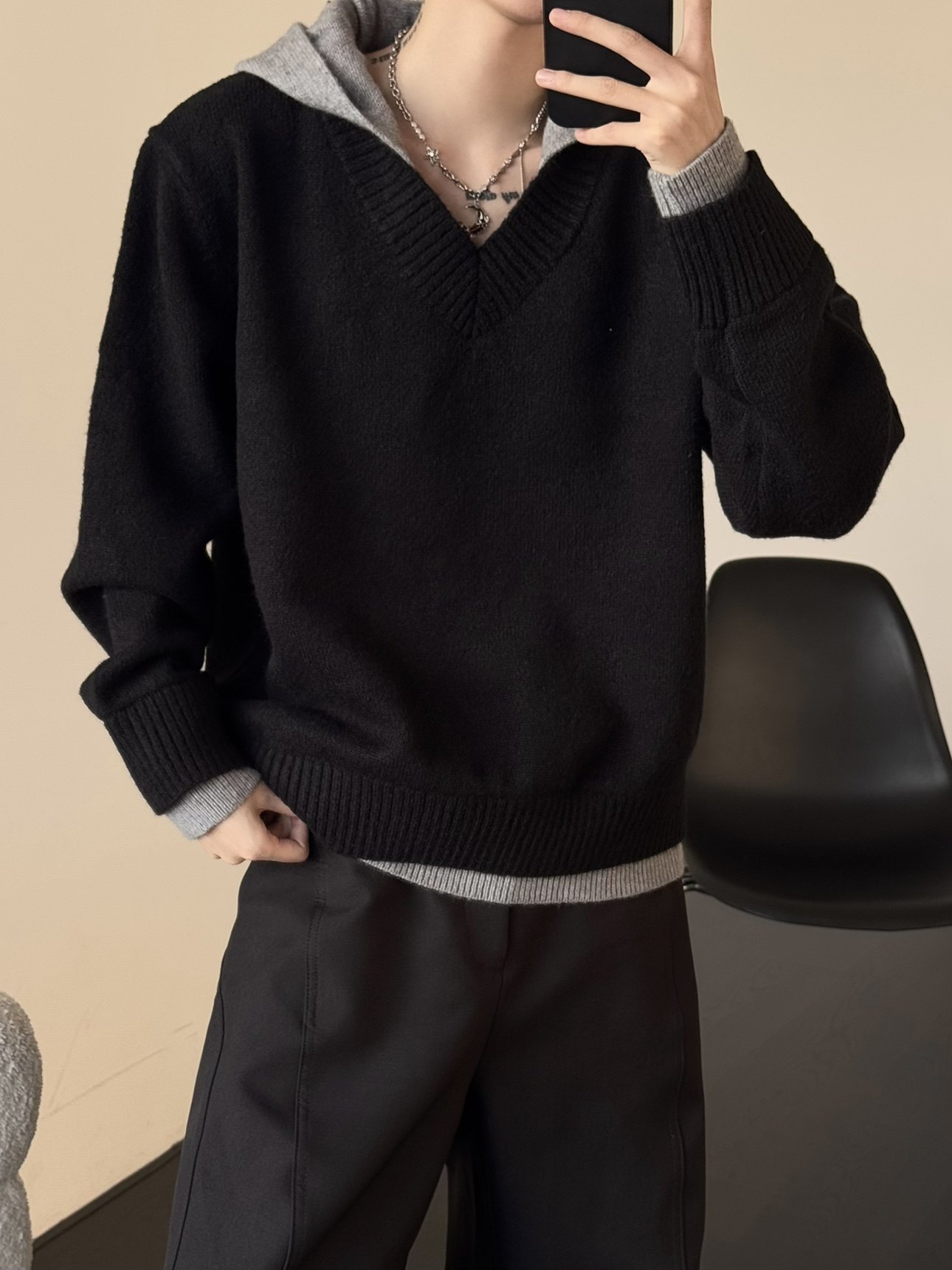 Fake Layered V-Neck Drop Shoulder Hooded Oversize Knit Sweater WN23186
