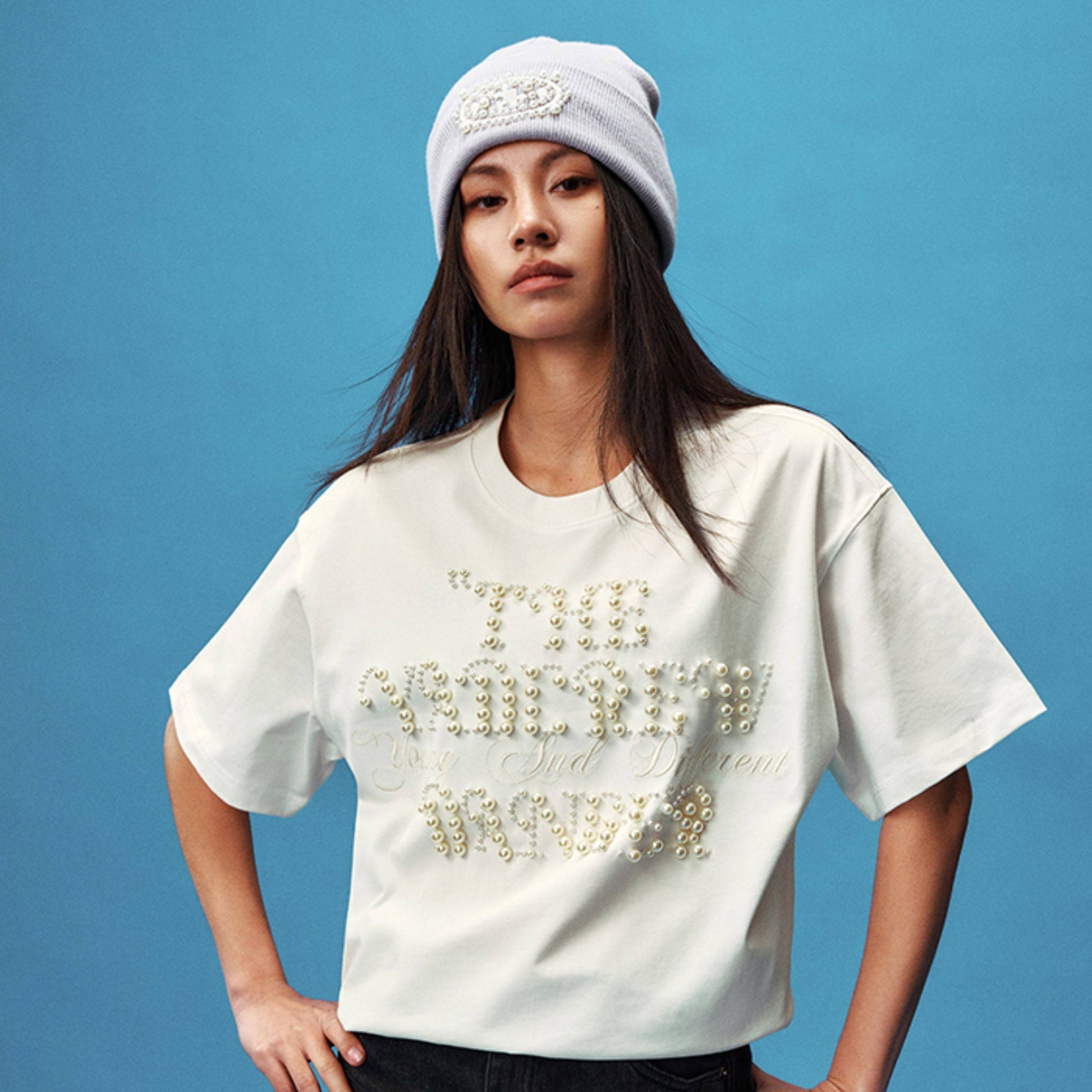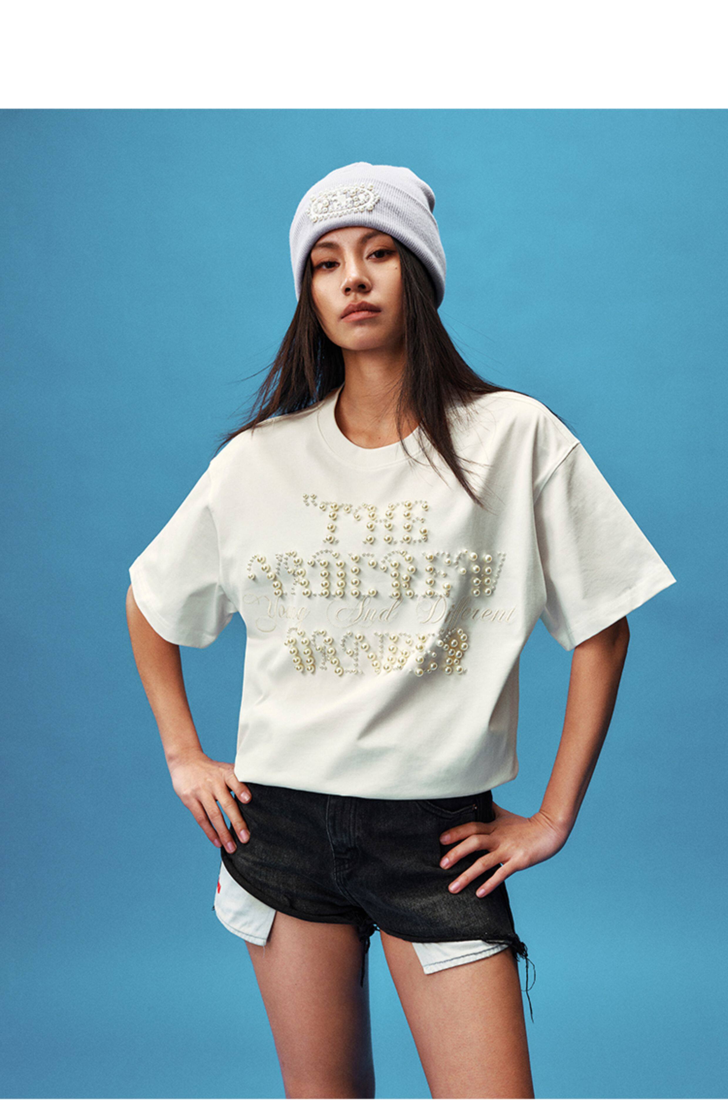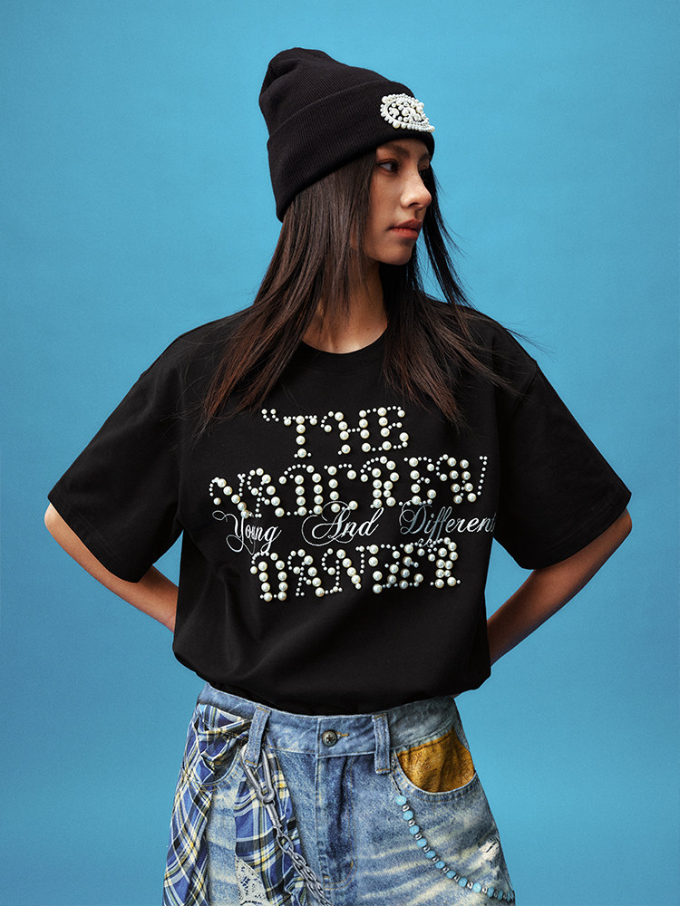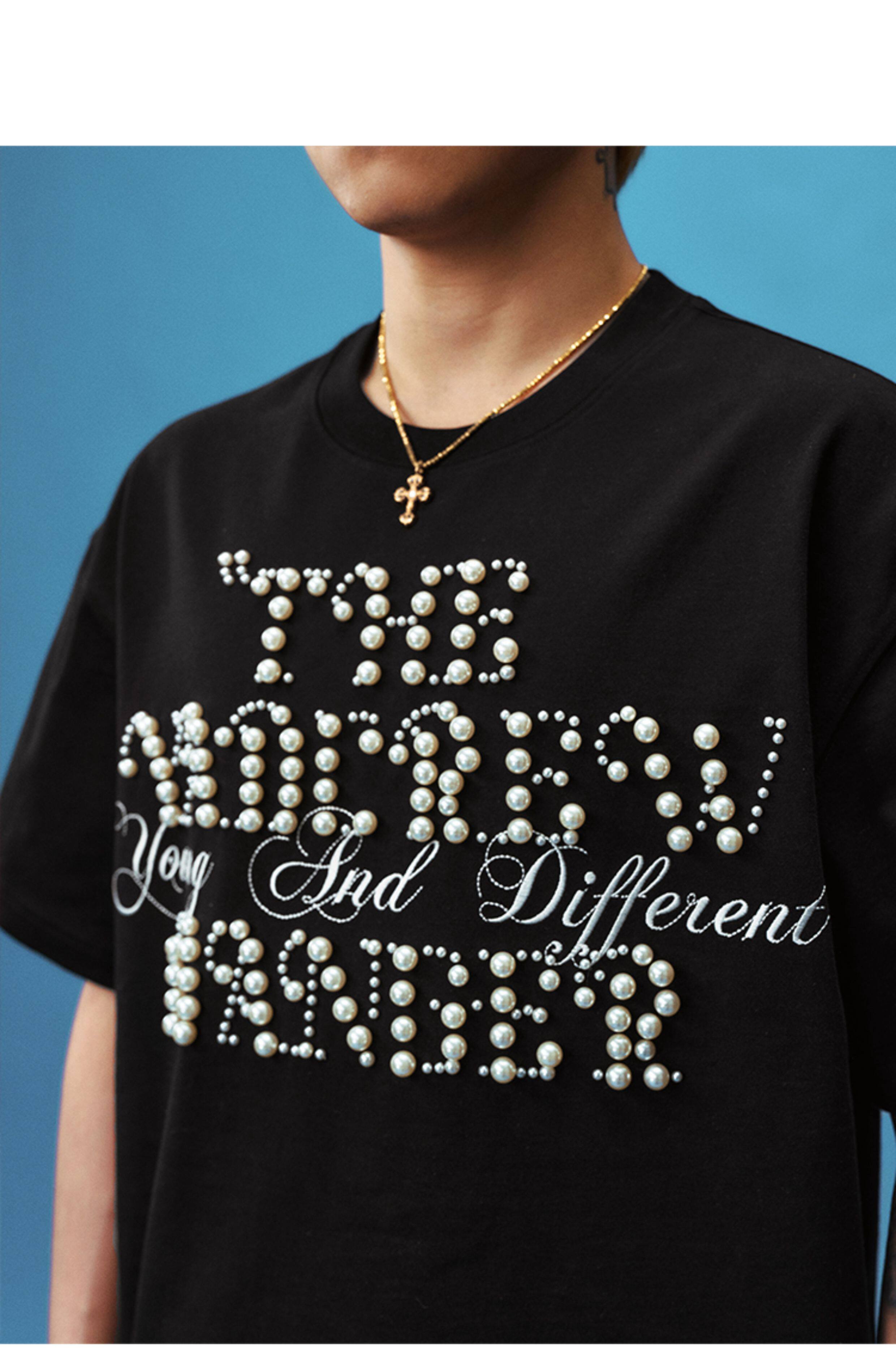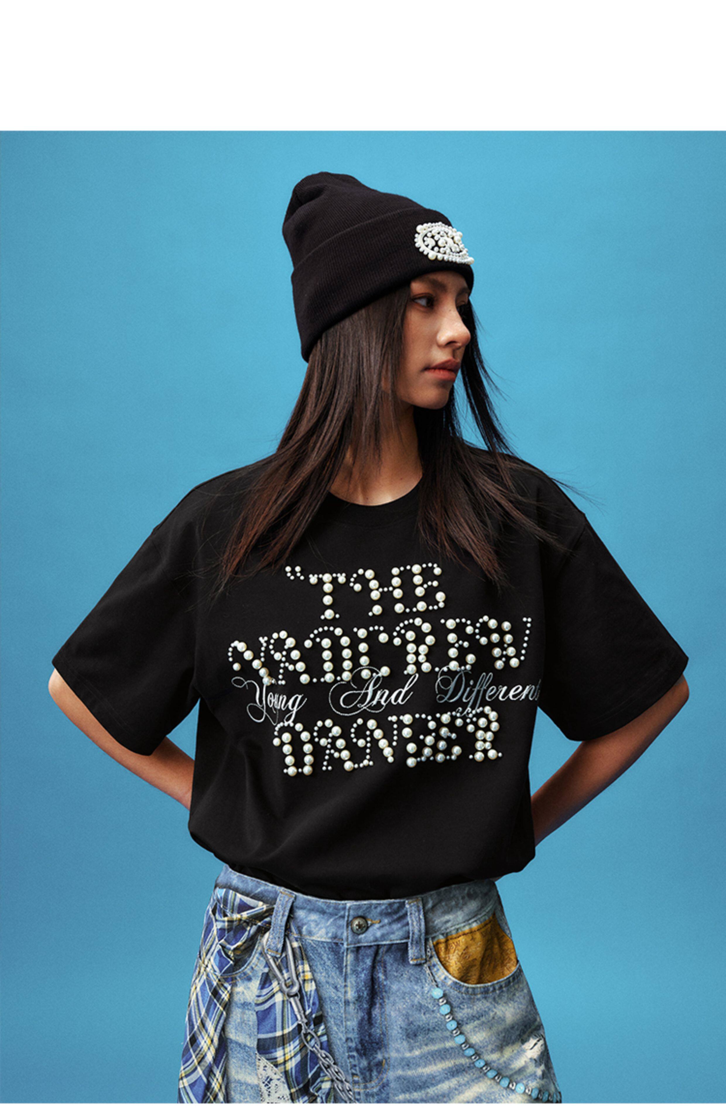 Pearl Letter Embroidery Oversize Short Sleeve T-Shirt WN23246