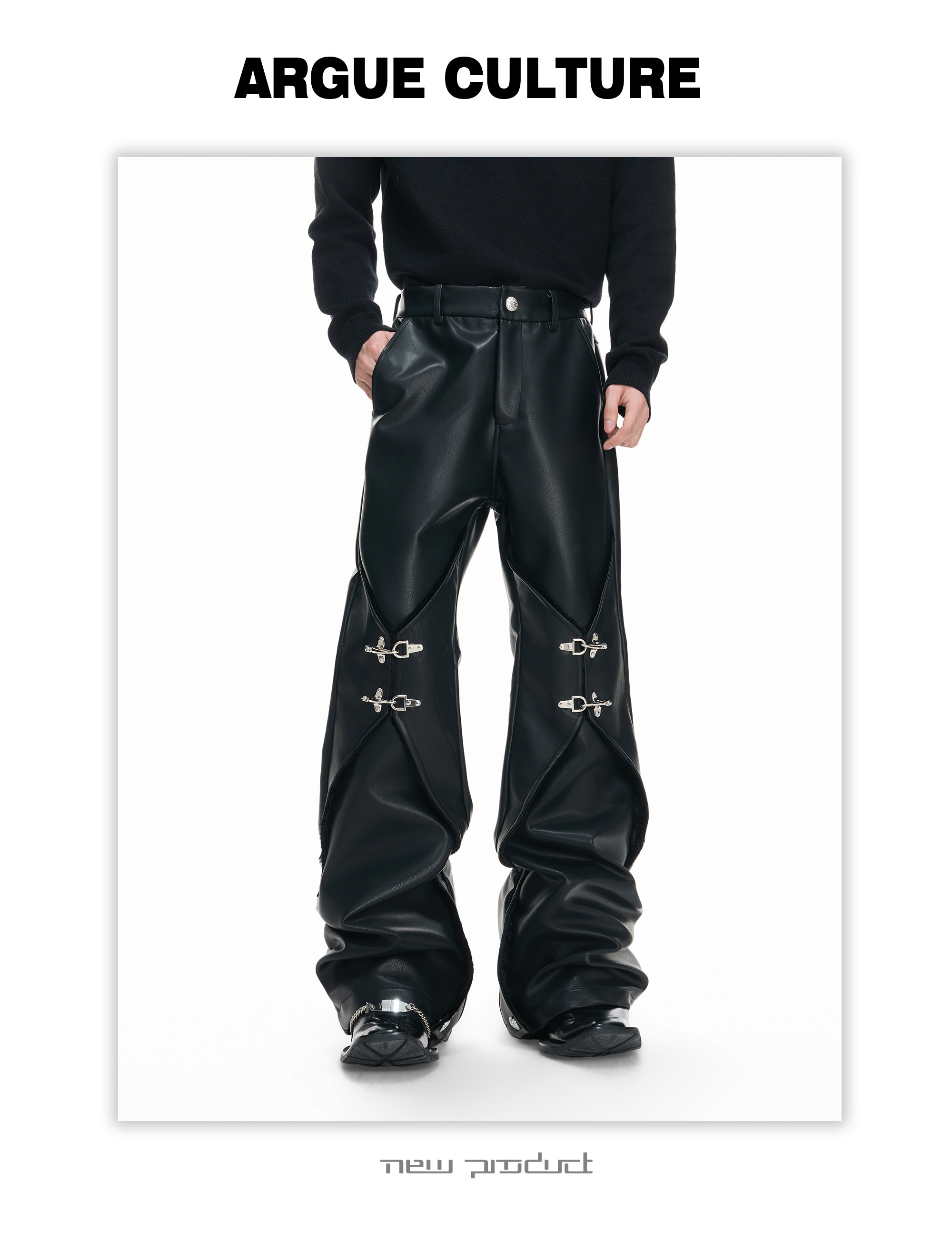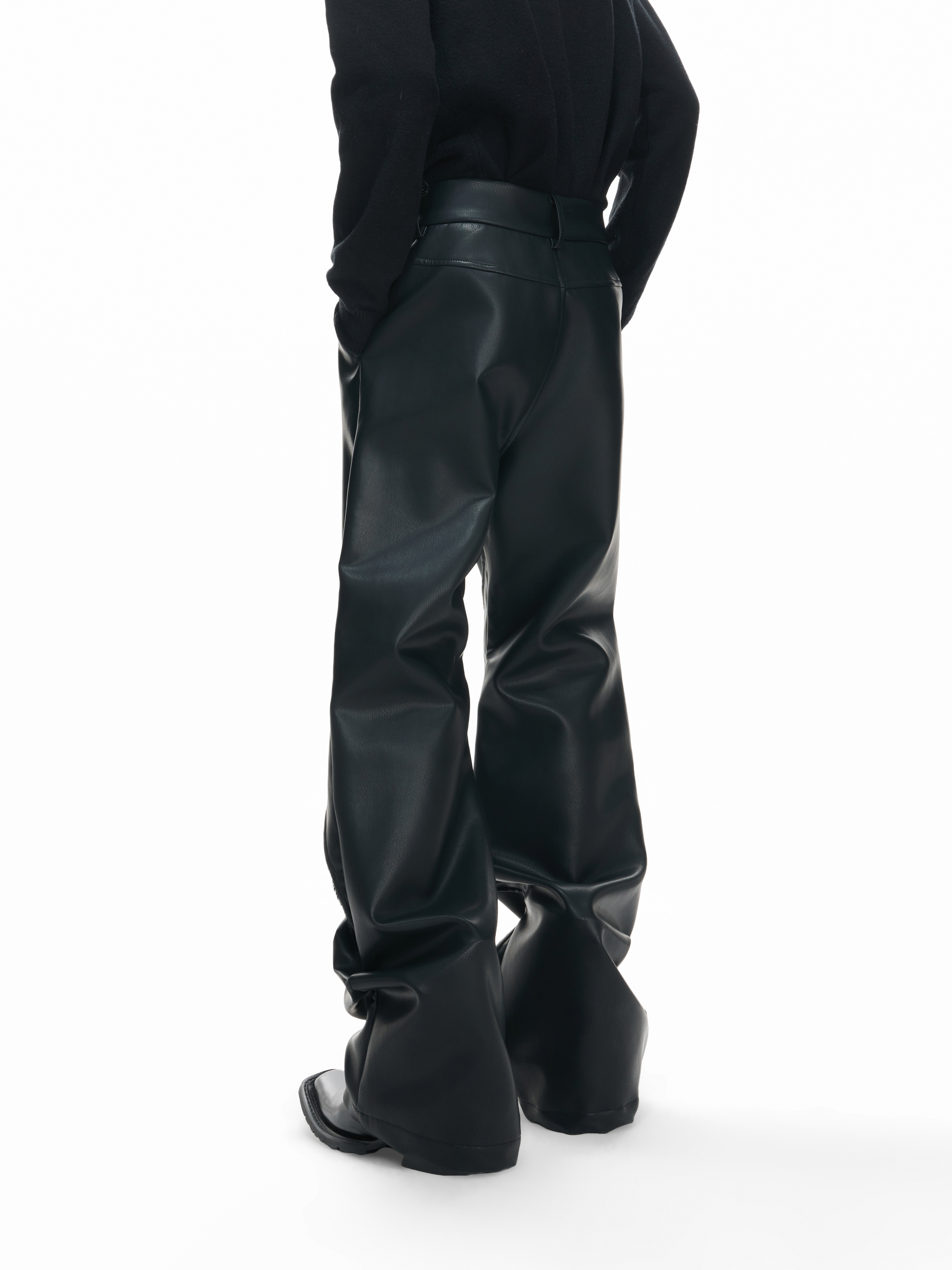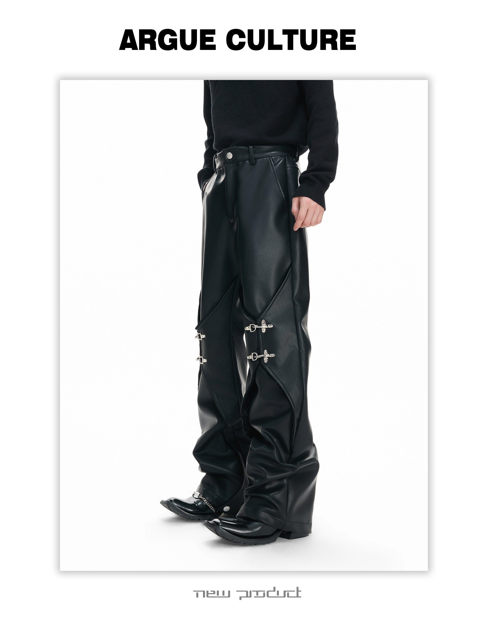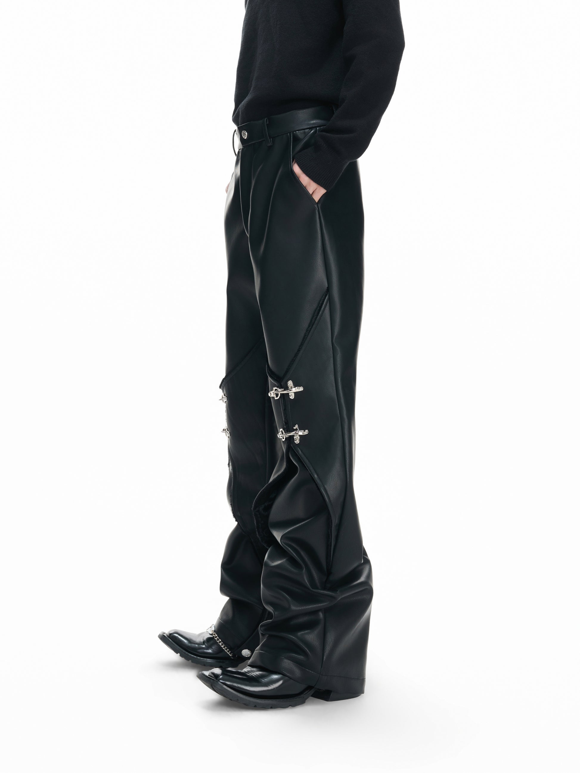Wax Coating Panel Metal Buckle Straight PU Leather Pants WN23324