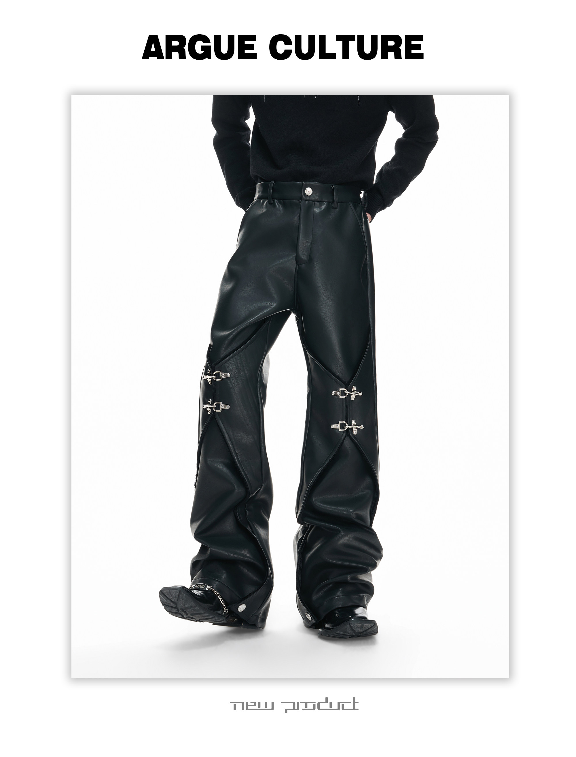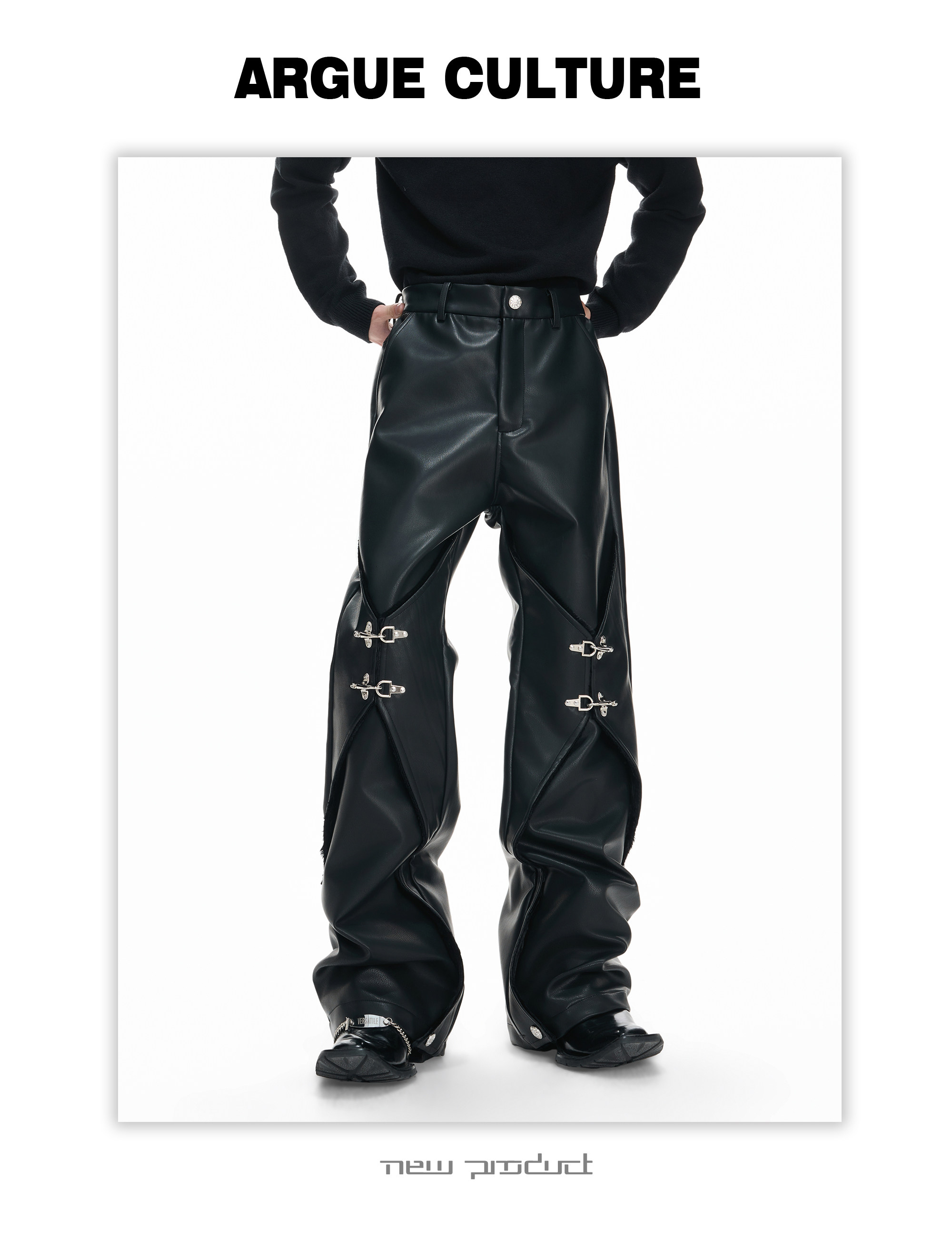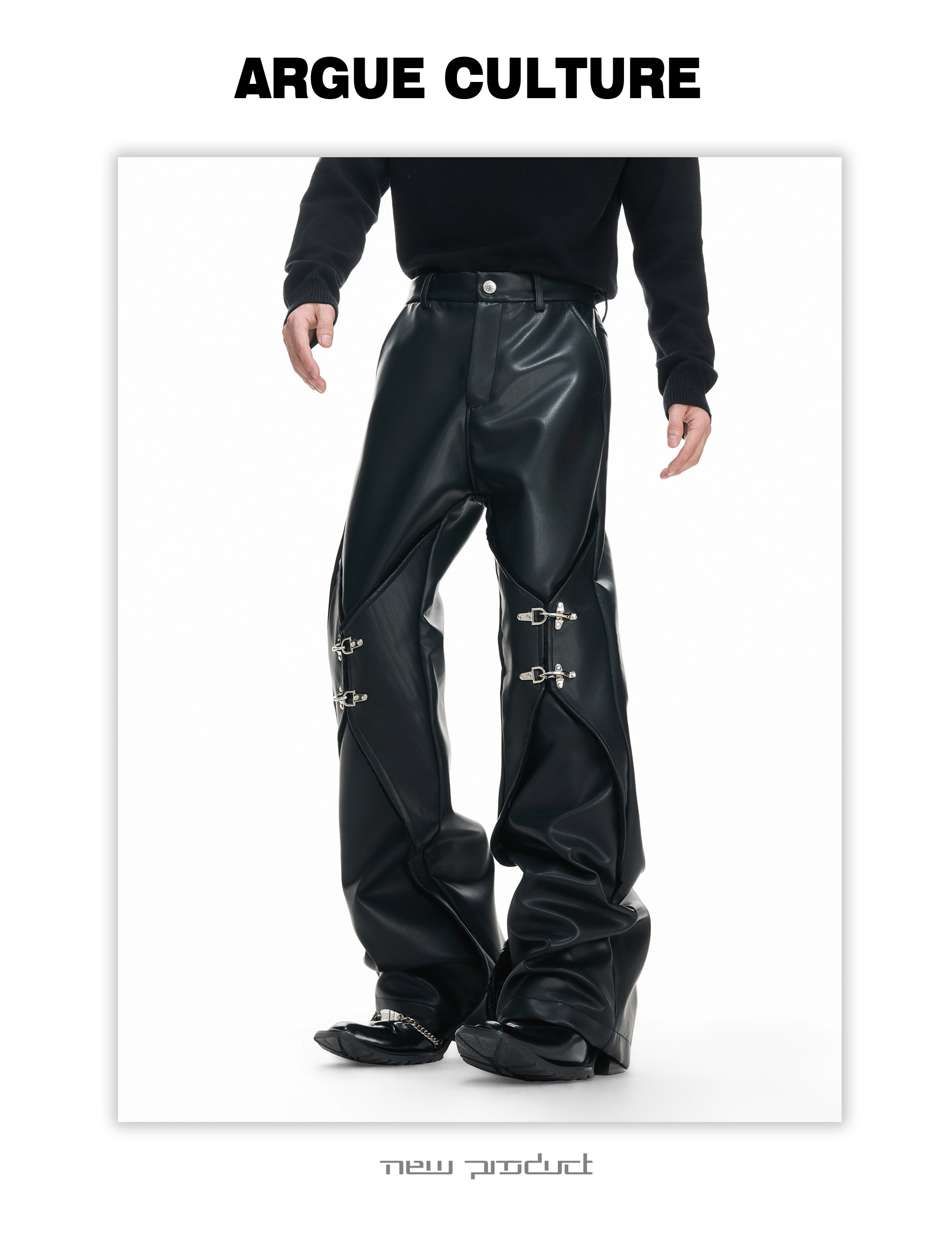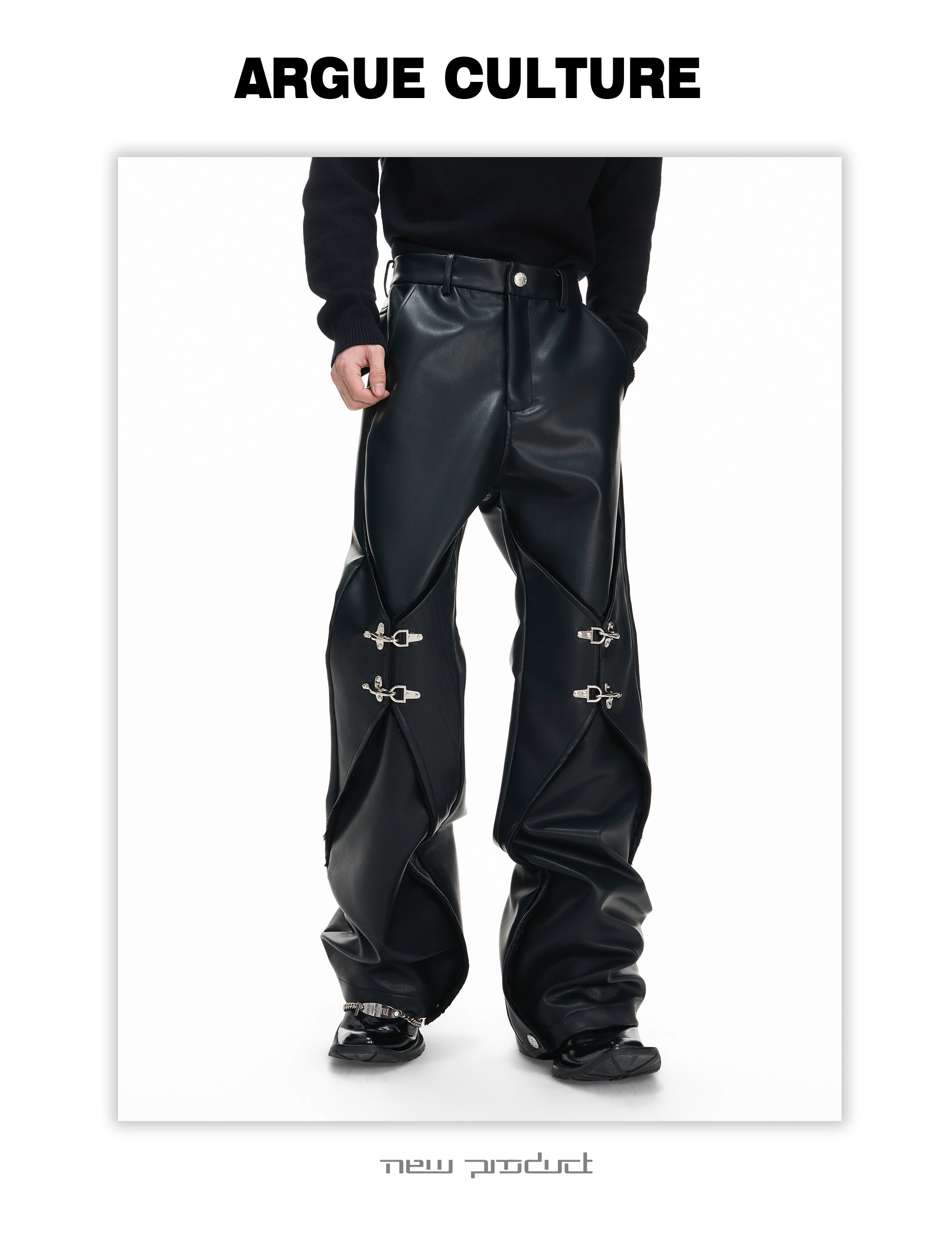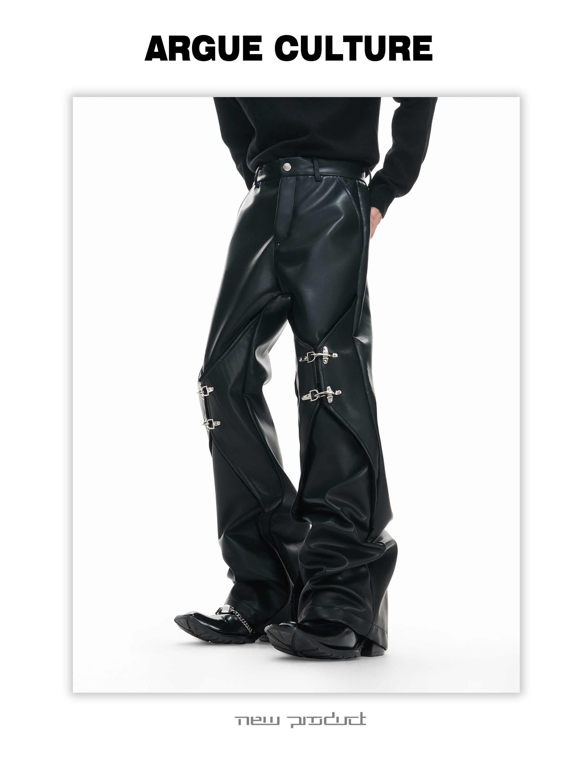 Wax Coating Panel Metal Buckle Straight PU Leather Pants WN23324