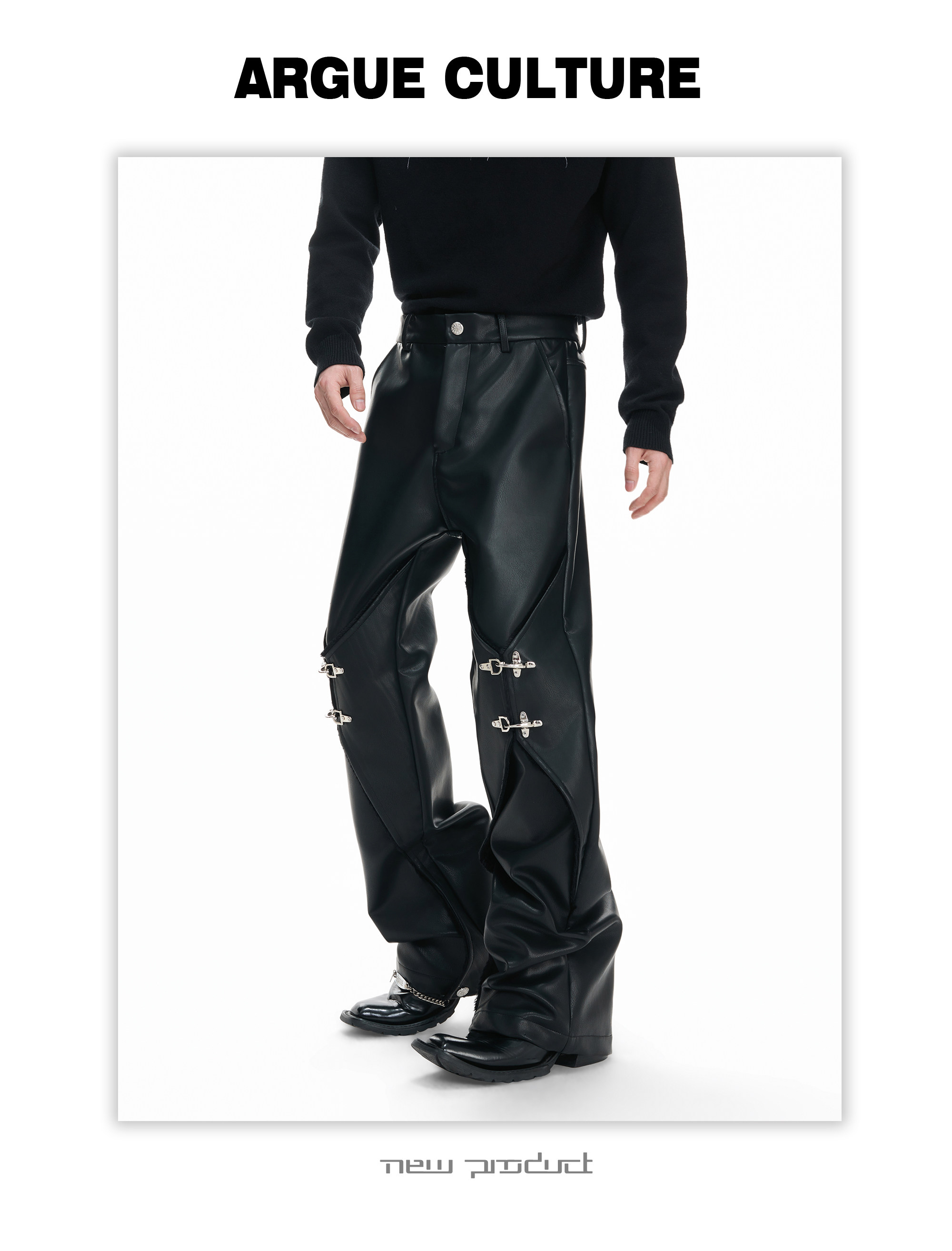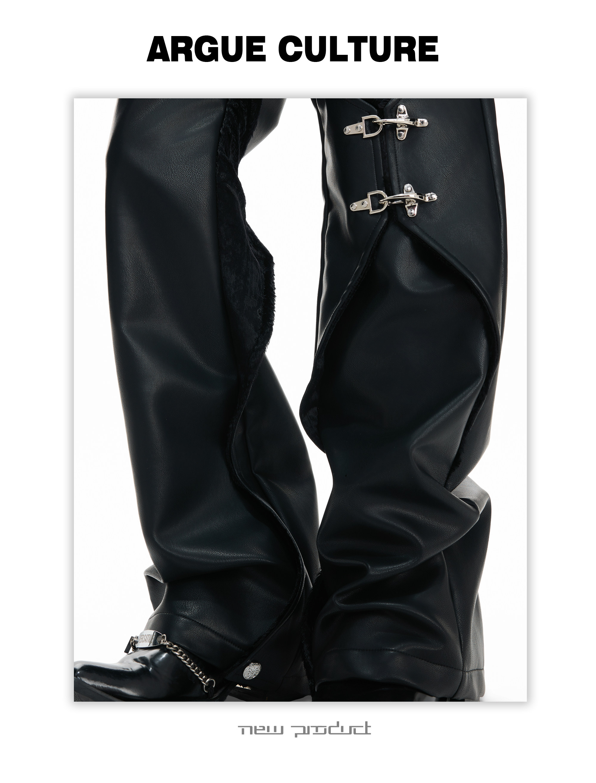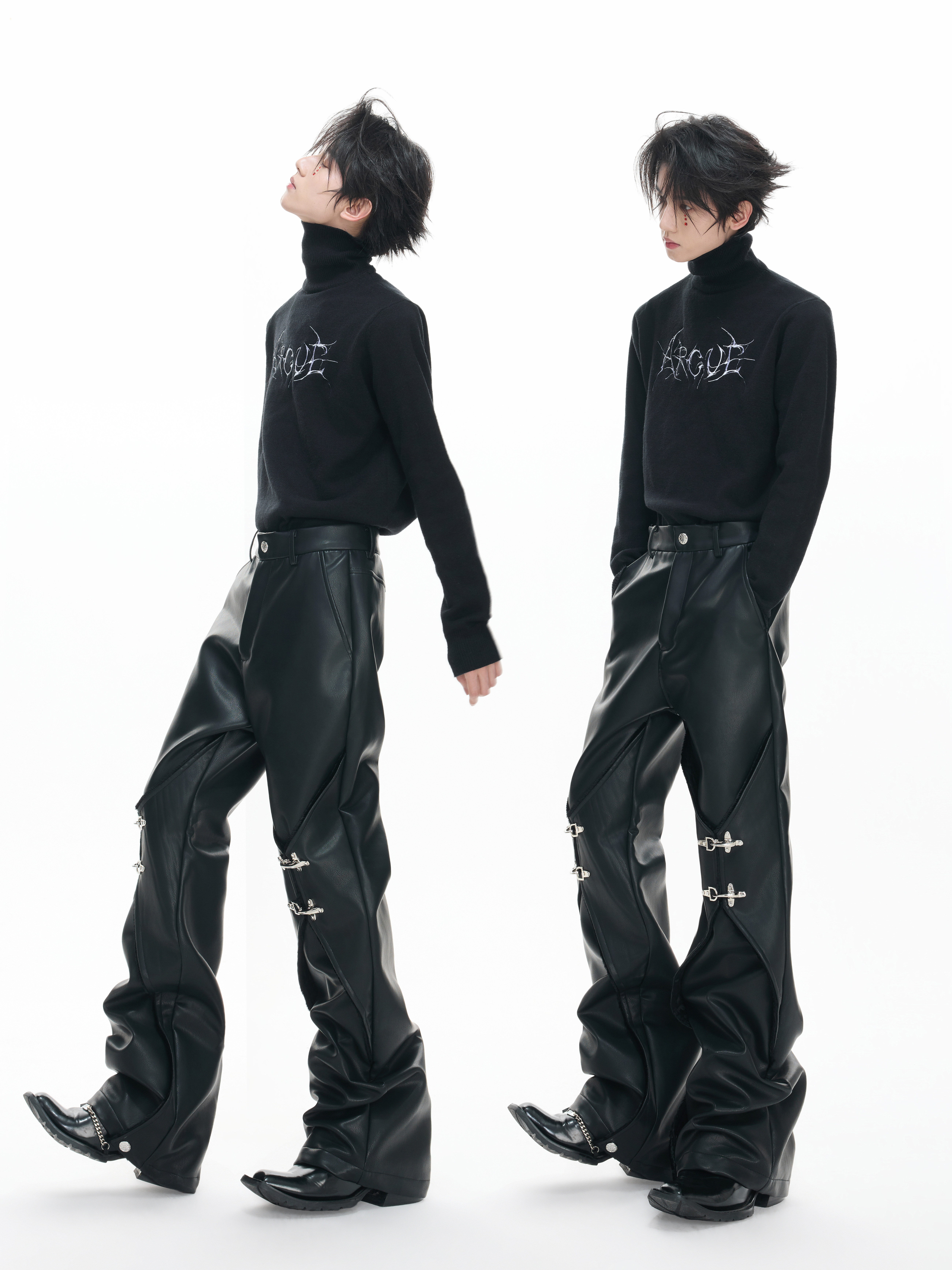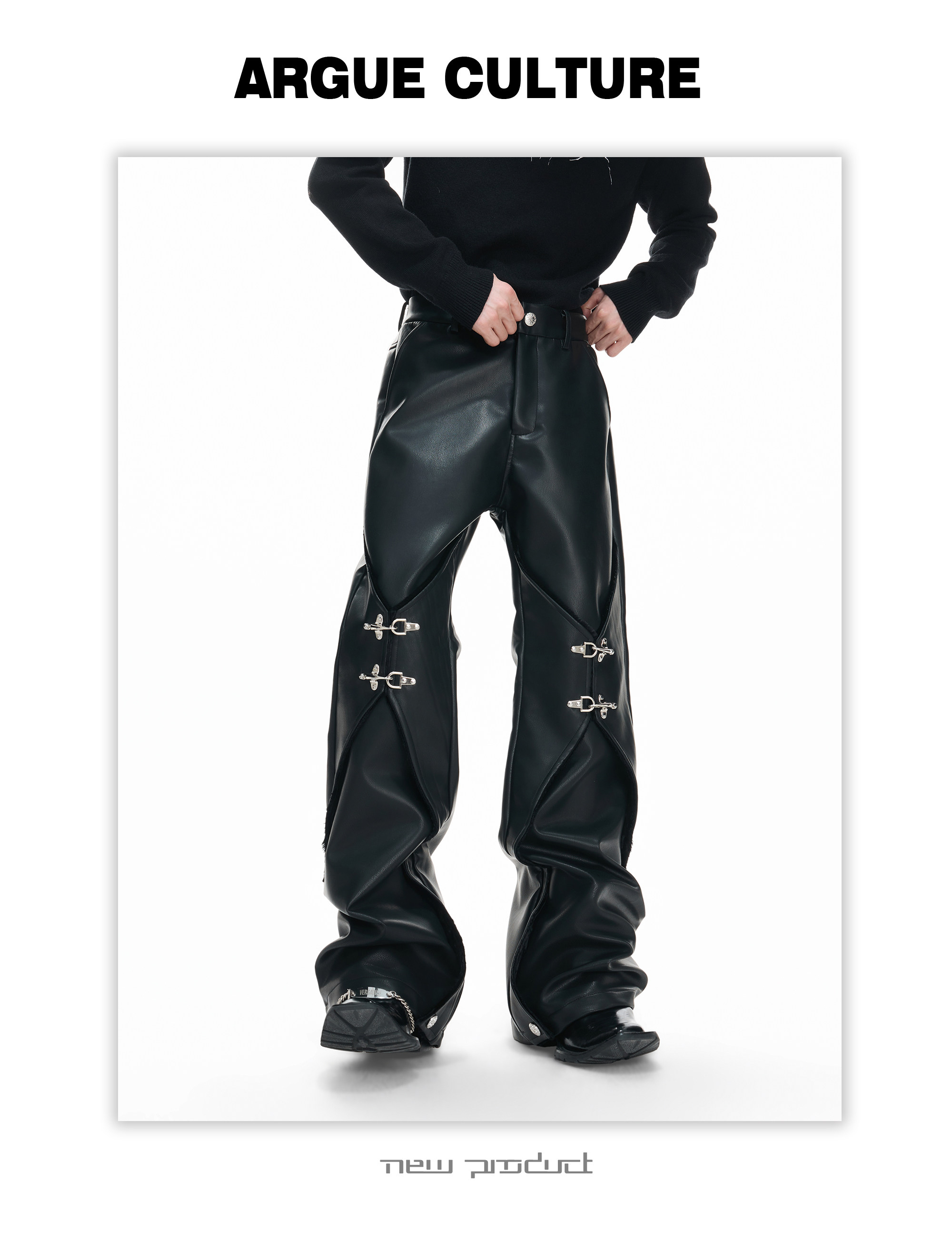Wax Coating Panel Metal Buckle Straight PU Leather Pants WN23324