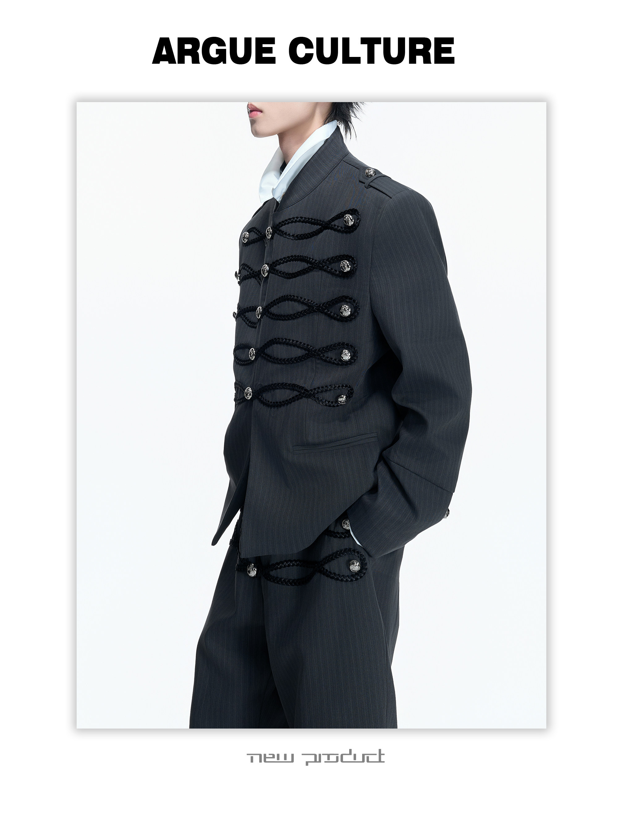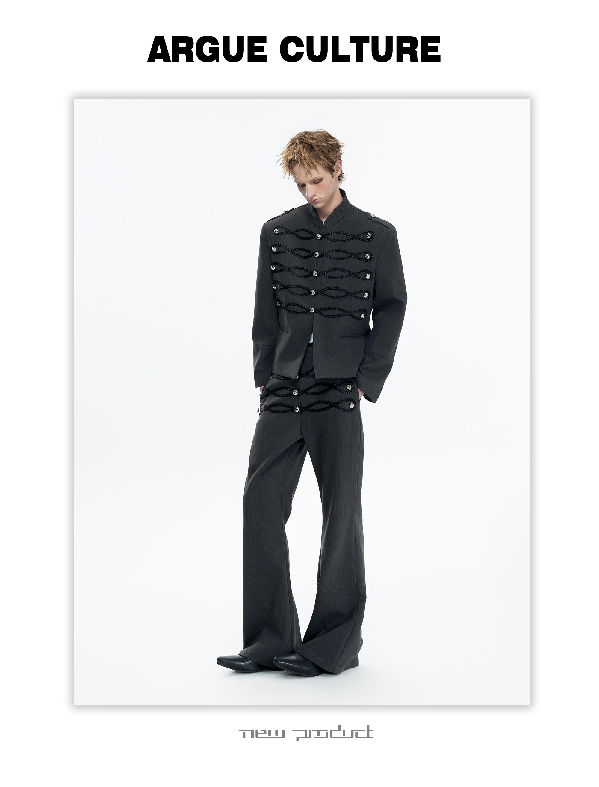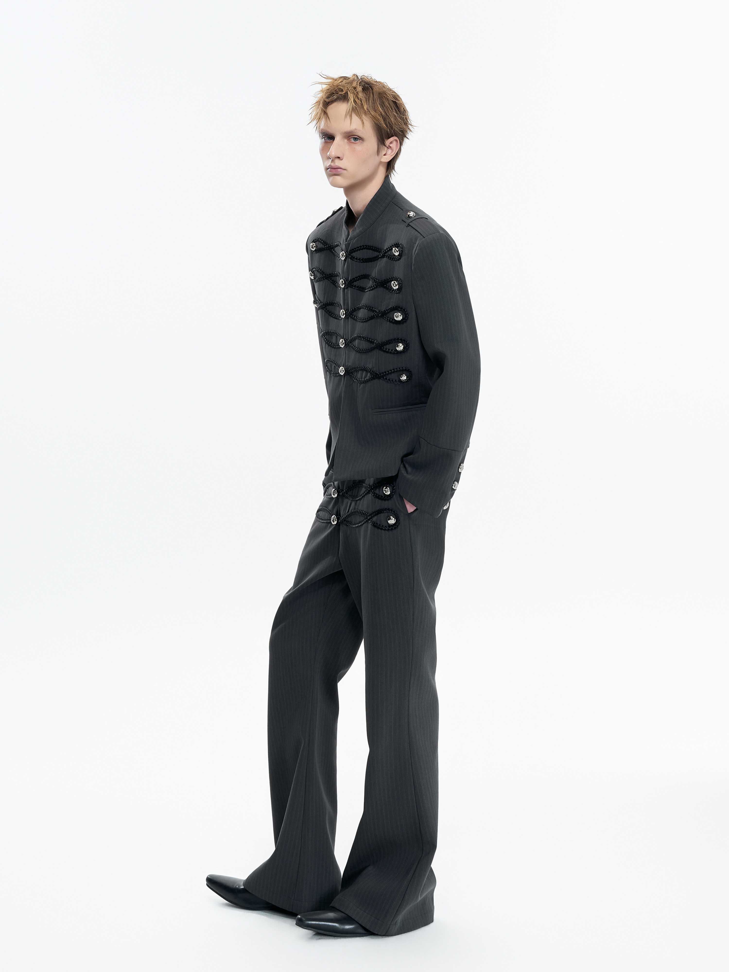 Leather Weave Metal Button Stripe Jacket & Flare Trousers Setup WN23546