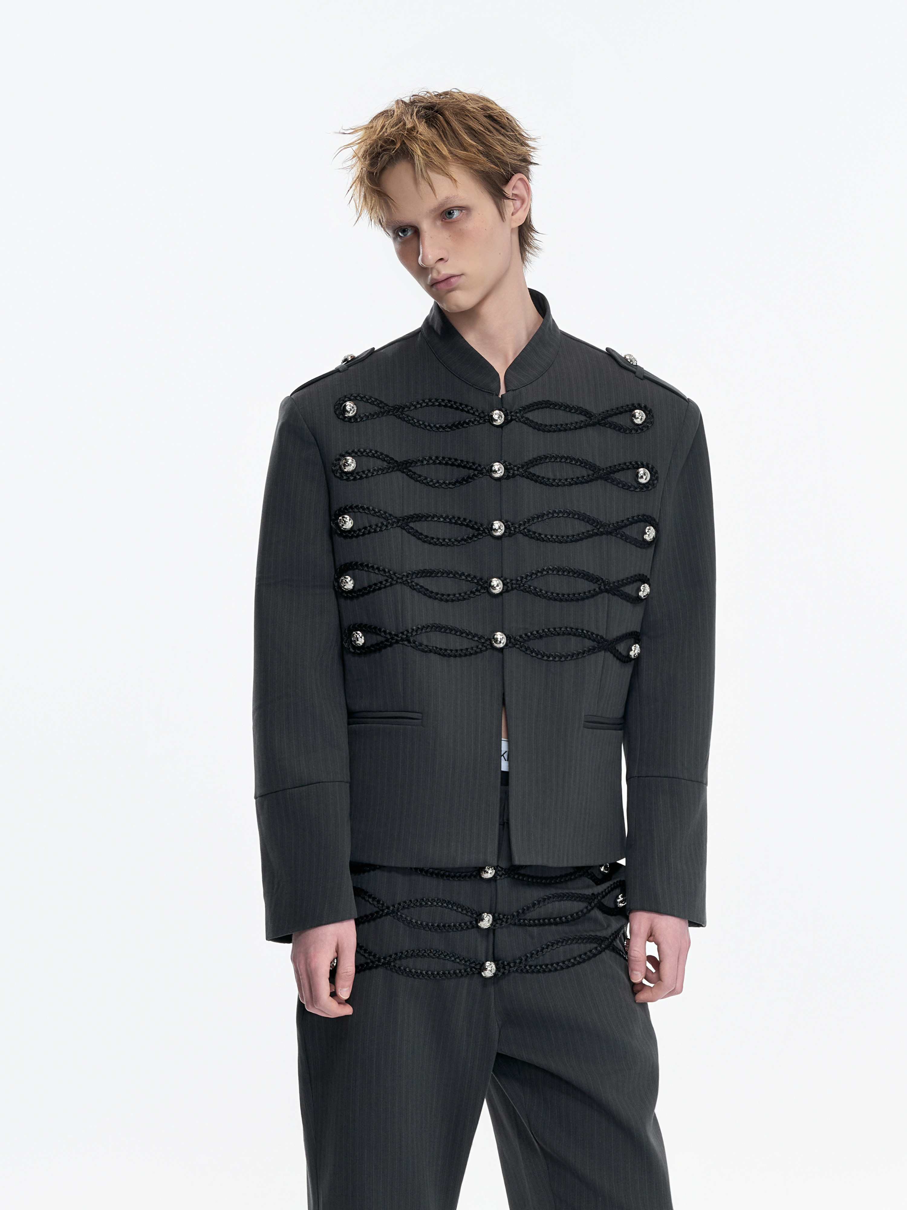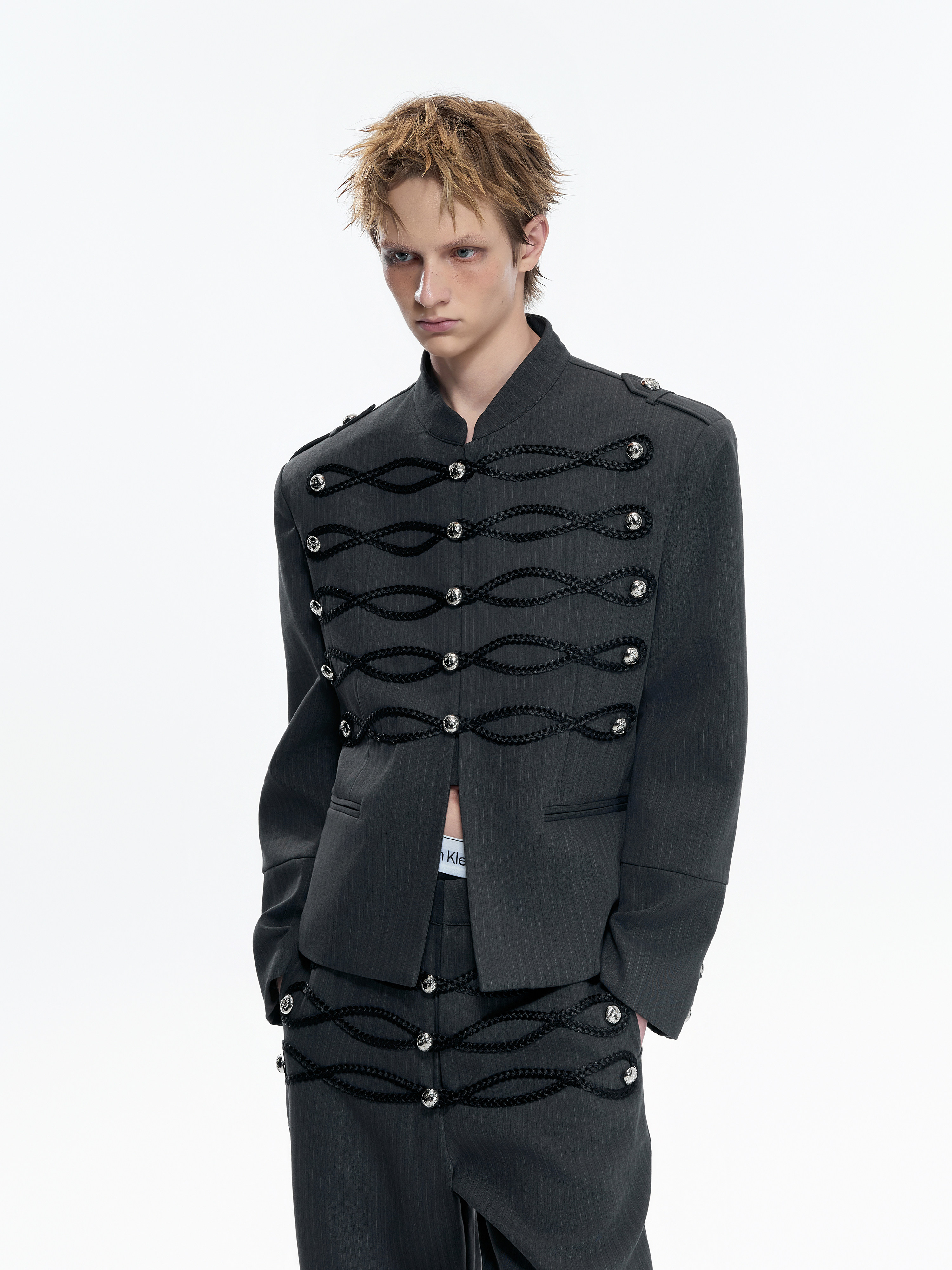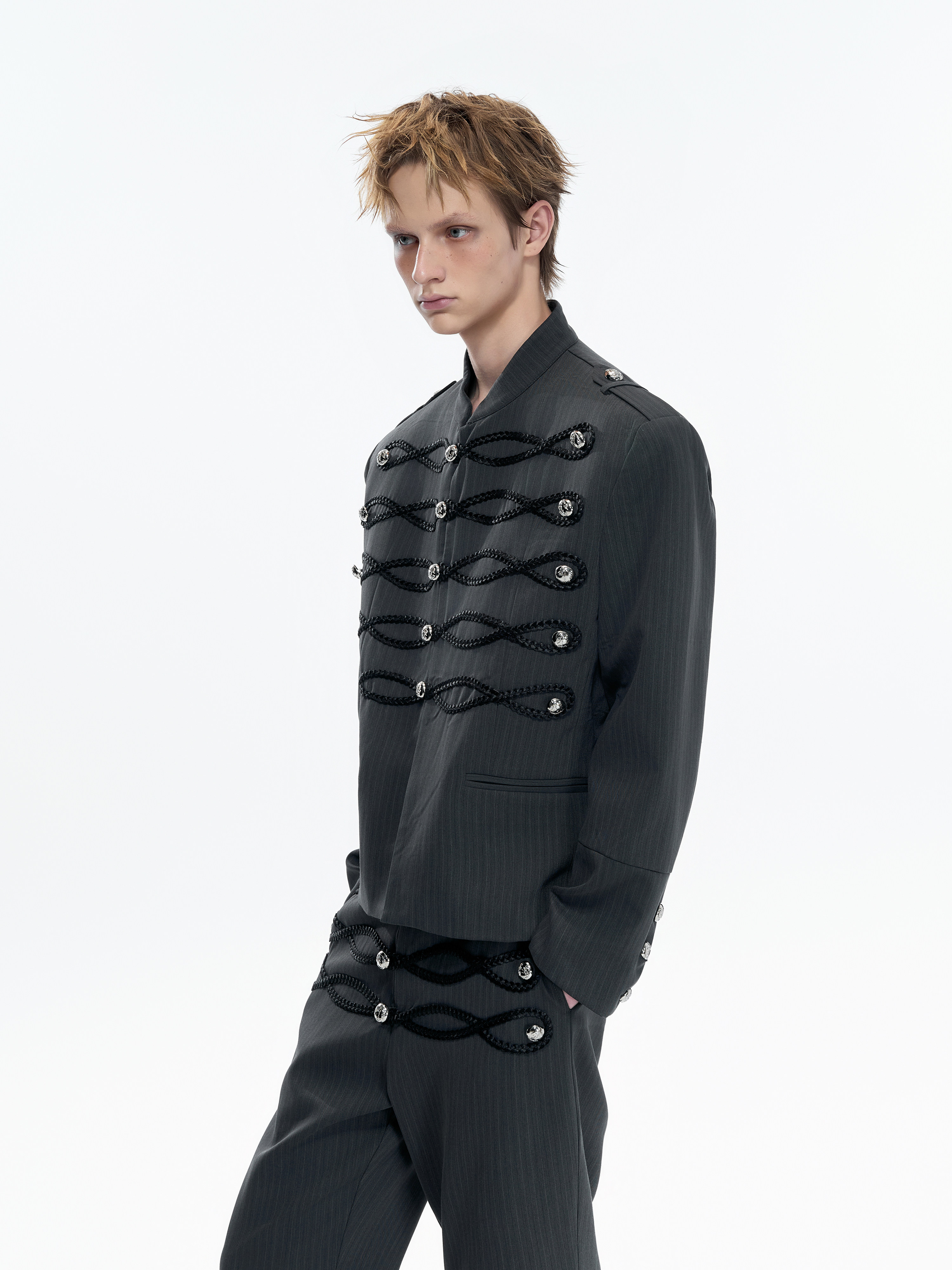 Leather Weave Metal Button Stripe Jacket & Flare Trousers Setup WN23546