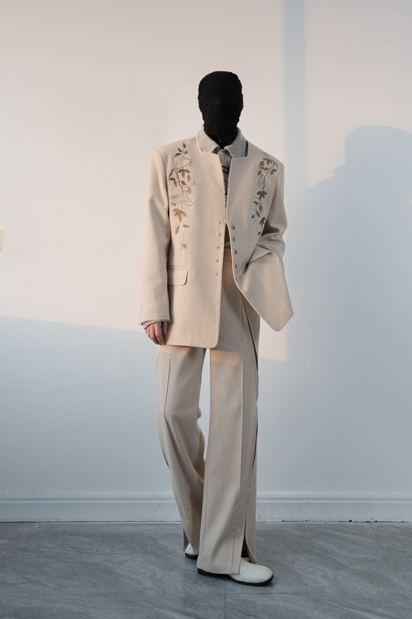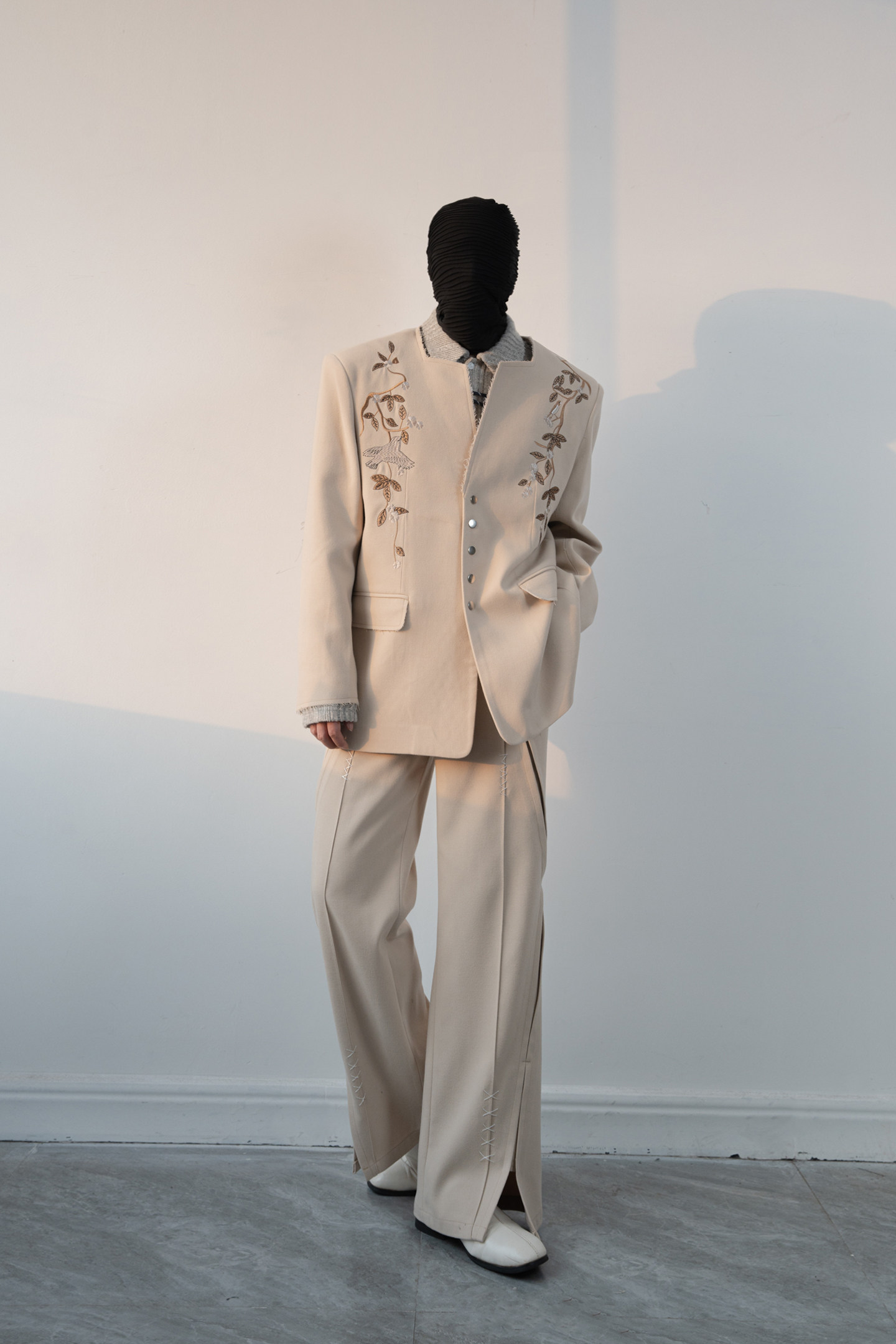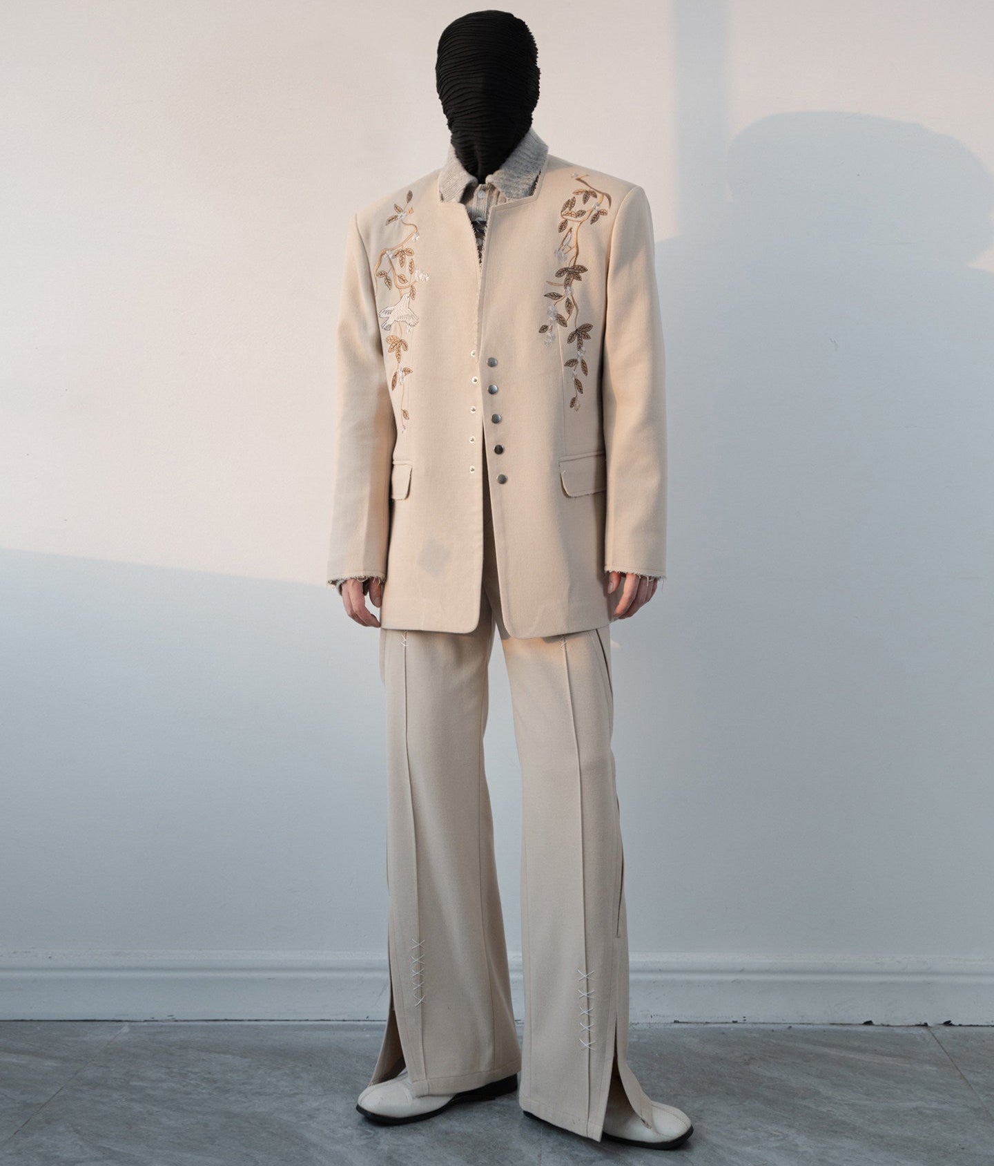 Floral Embroidery Tailored Jacket & Side Slits Wide-Leg Trousers Setup WN23635