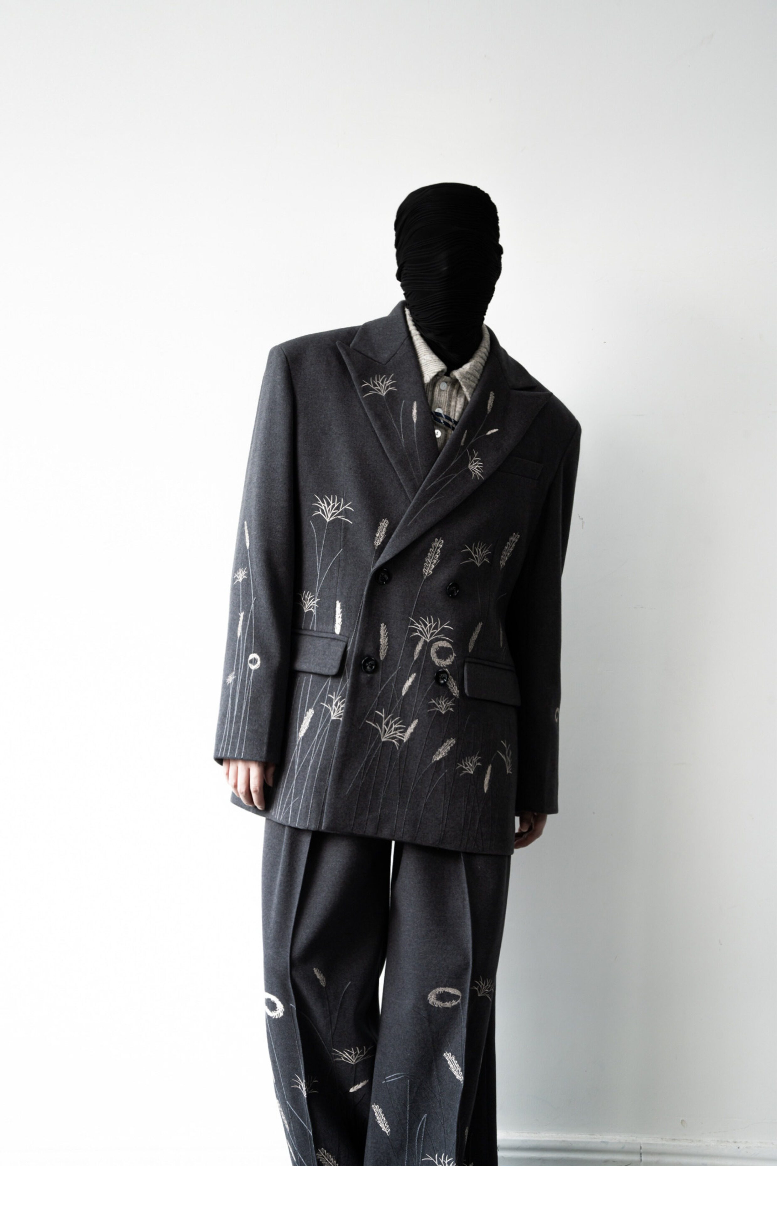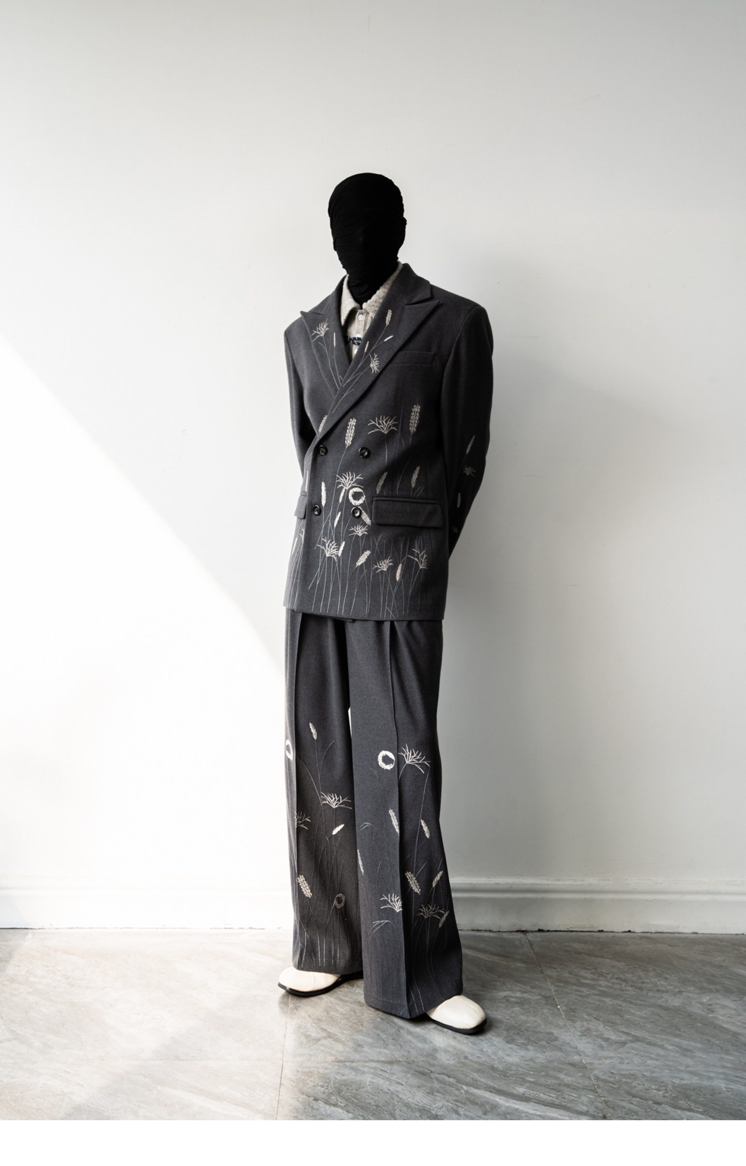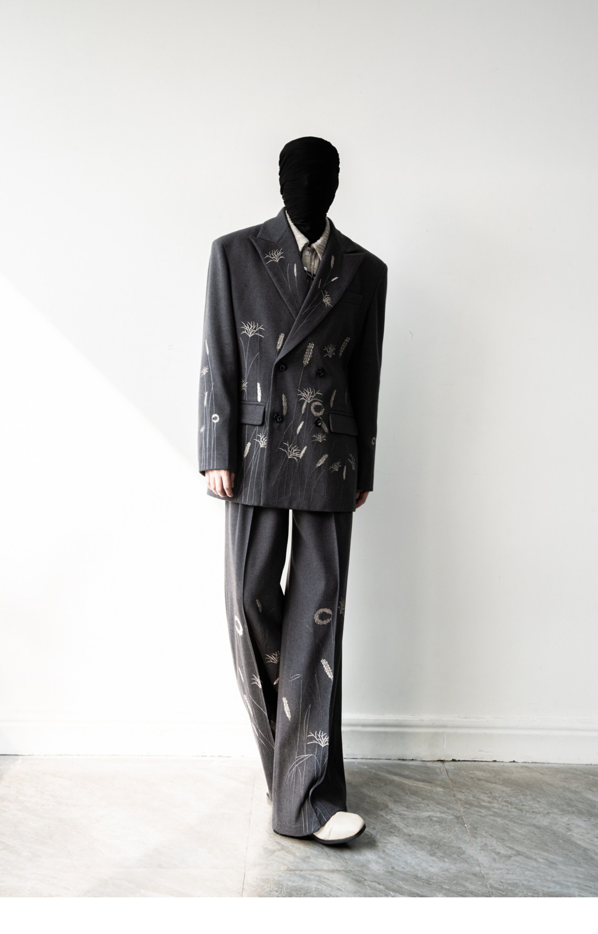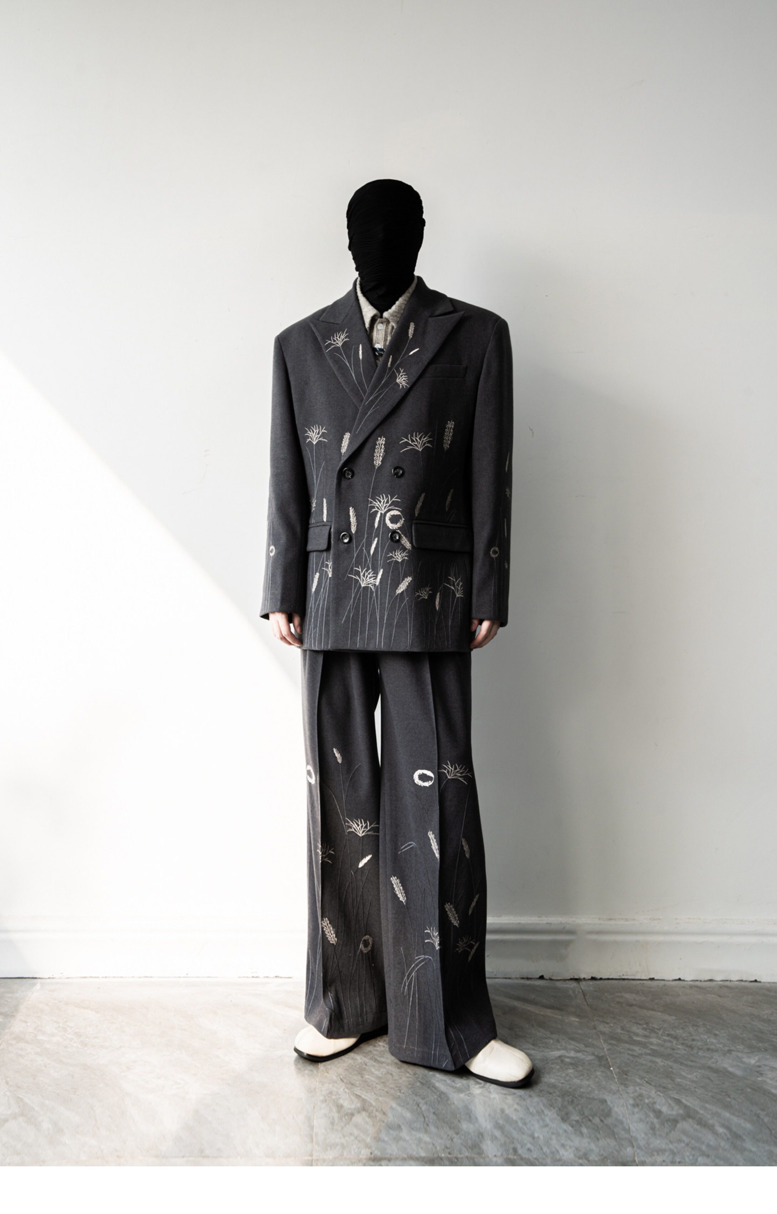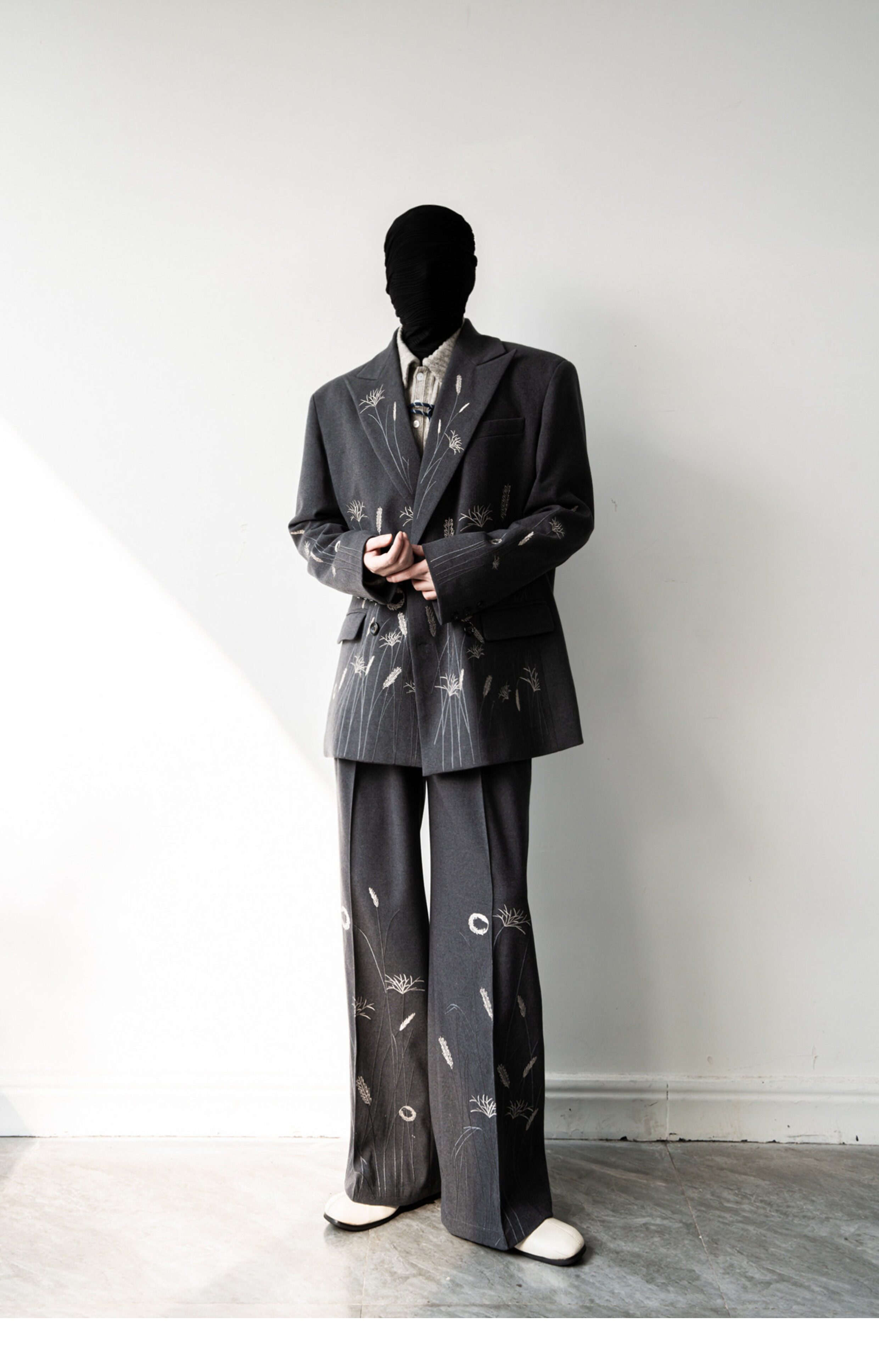 Floral Embroidery Double-Breasted Tailored Jacket & Wide-Leg Trousers Setup WN23641