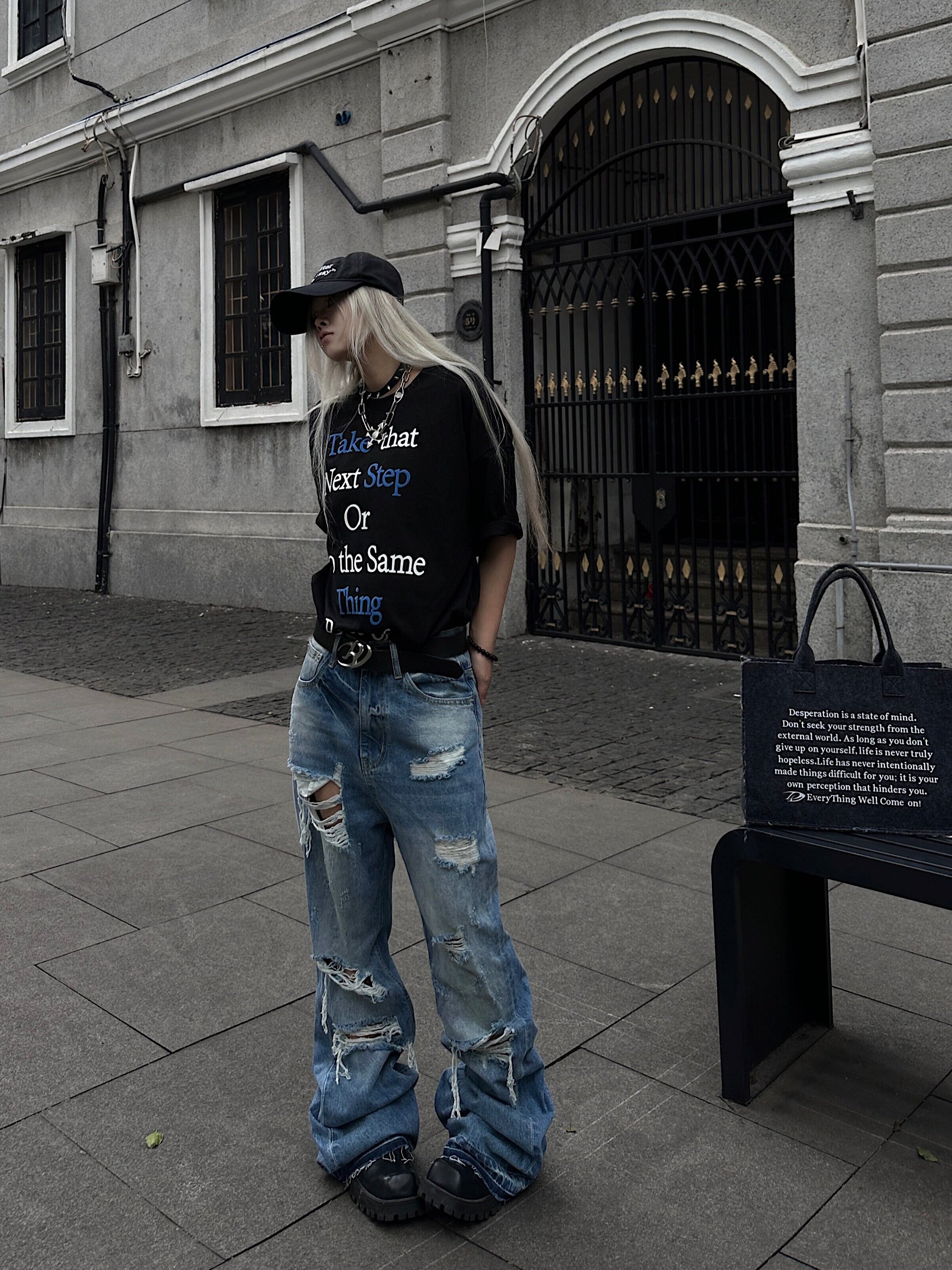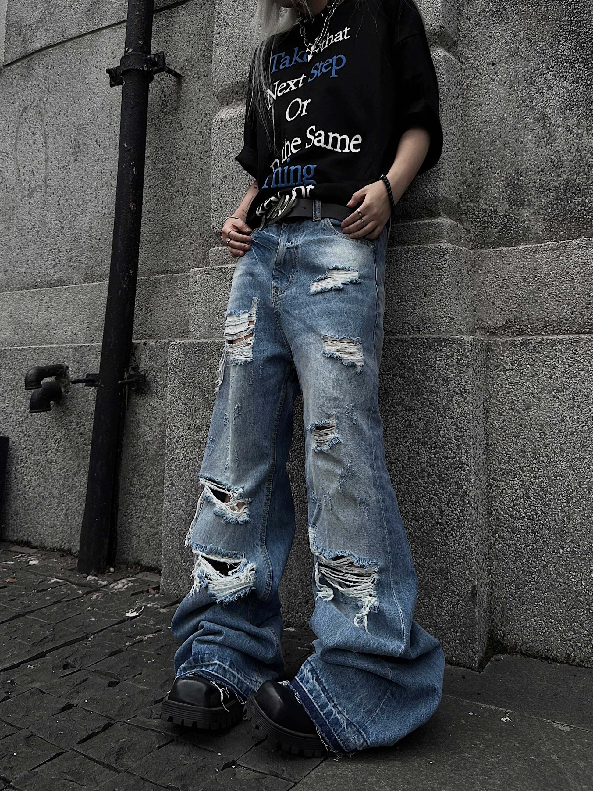 Cutout Damage Fringe Whisker Stacked Flare Denim Jeans WN24226