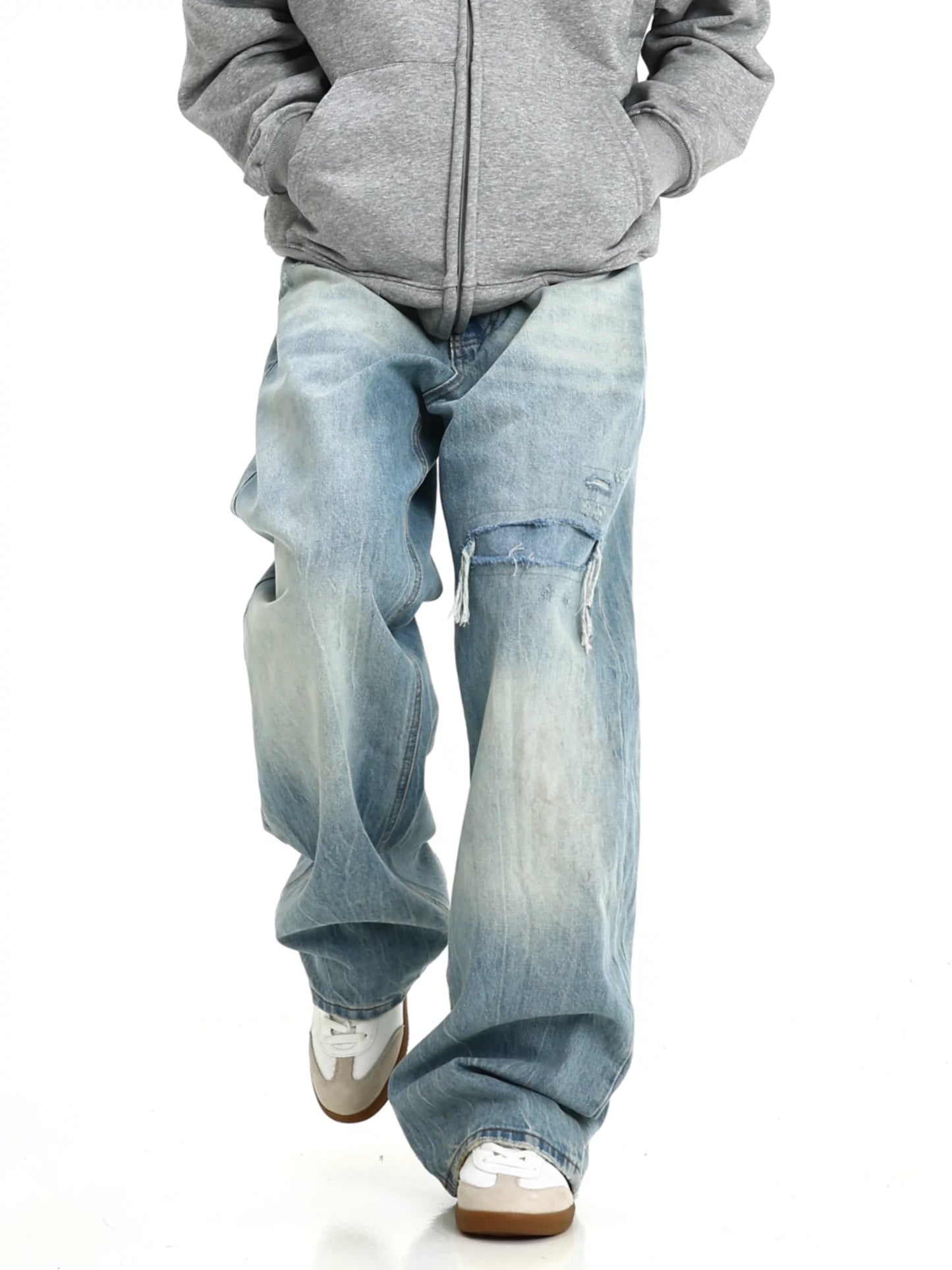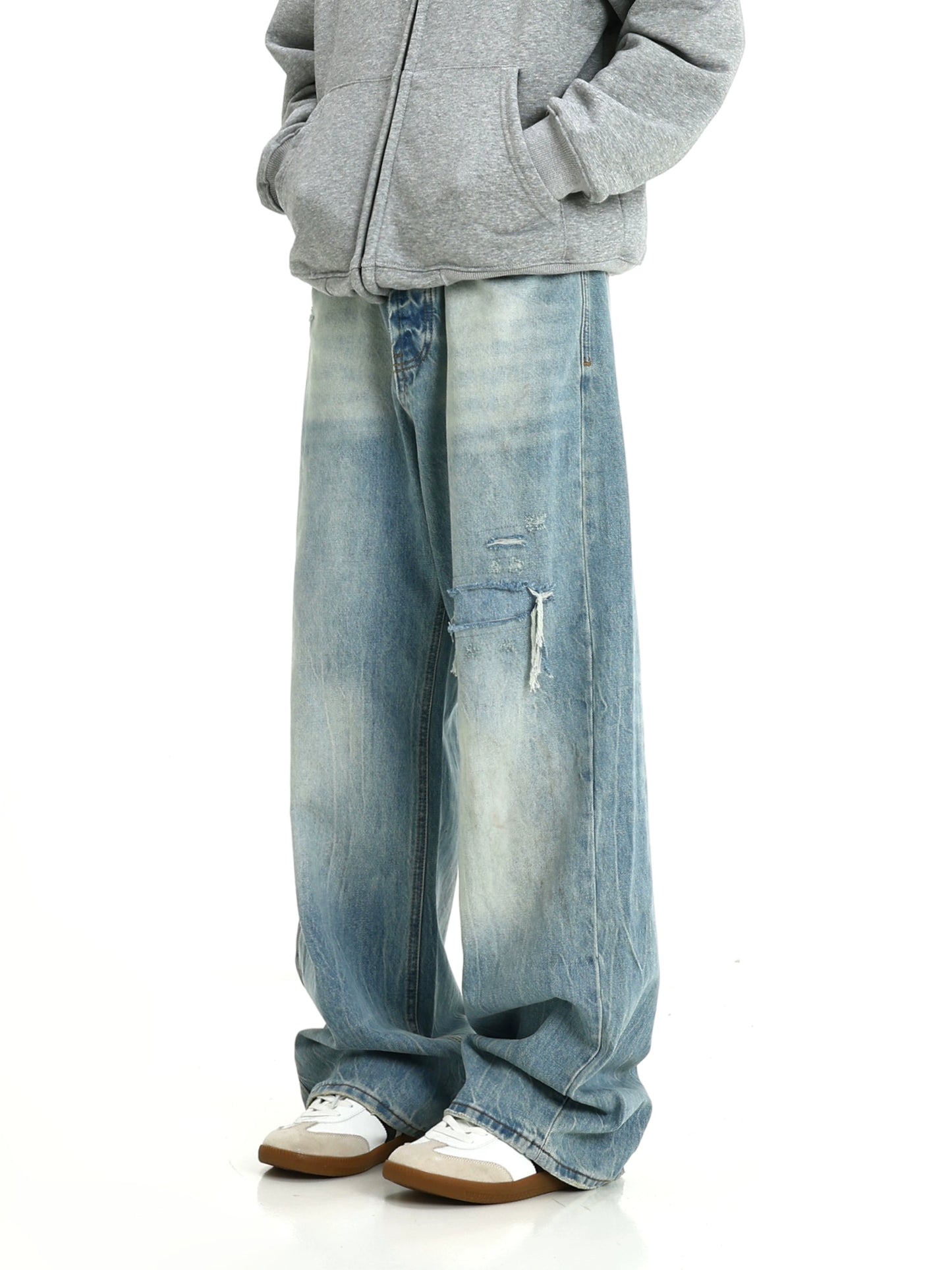 Washed Damage Wide-Leg Straight Denim Jeans WN5783