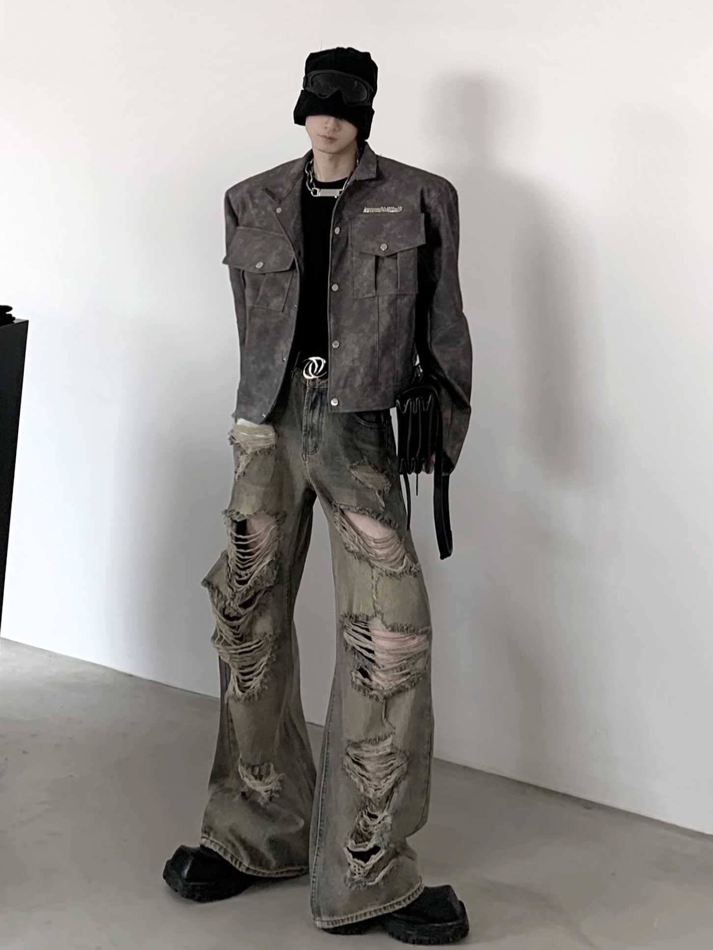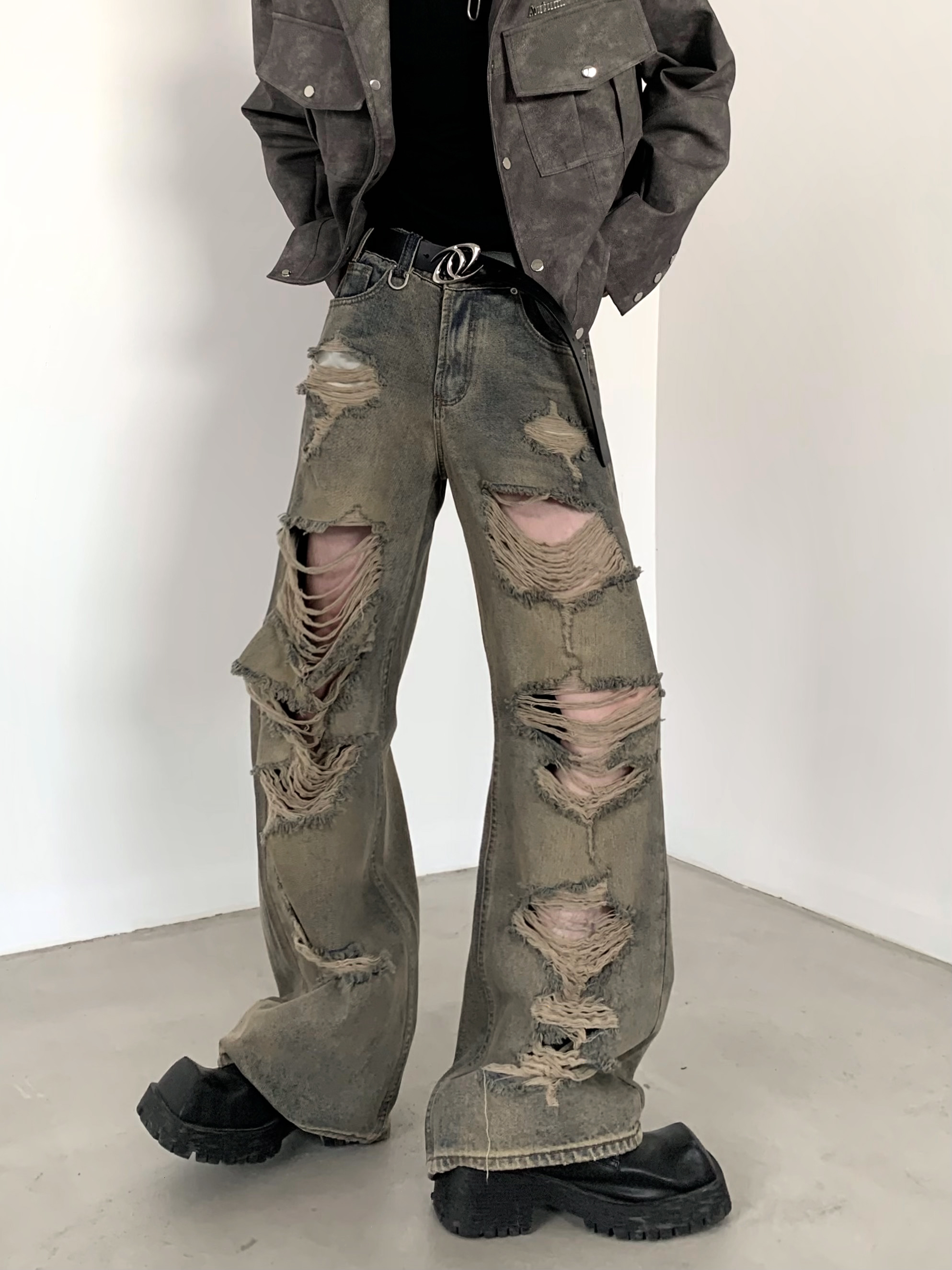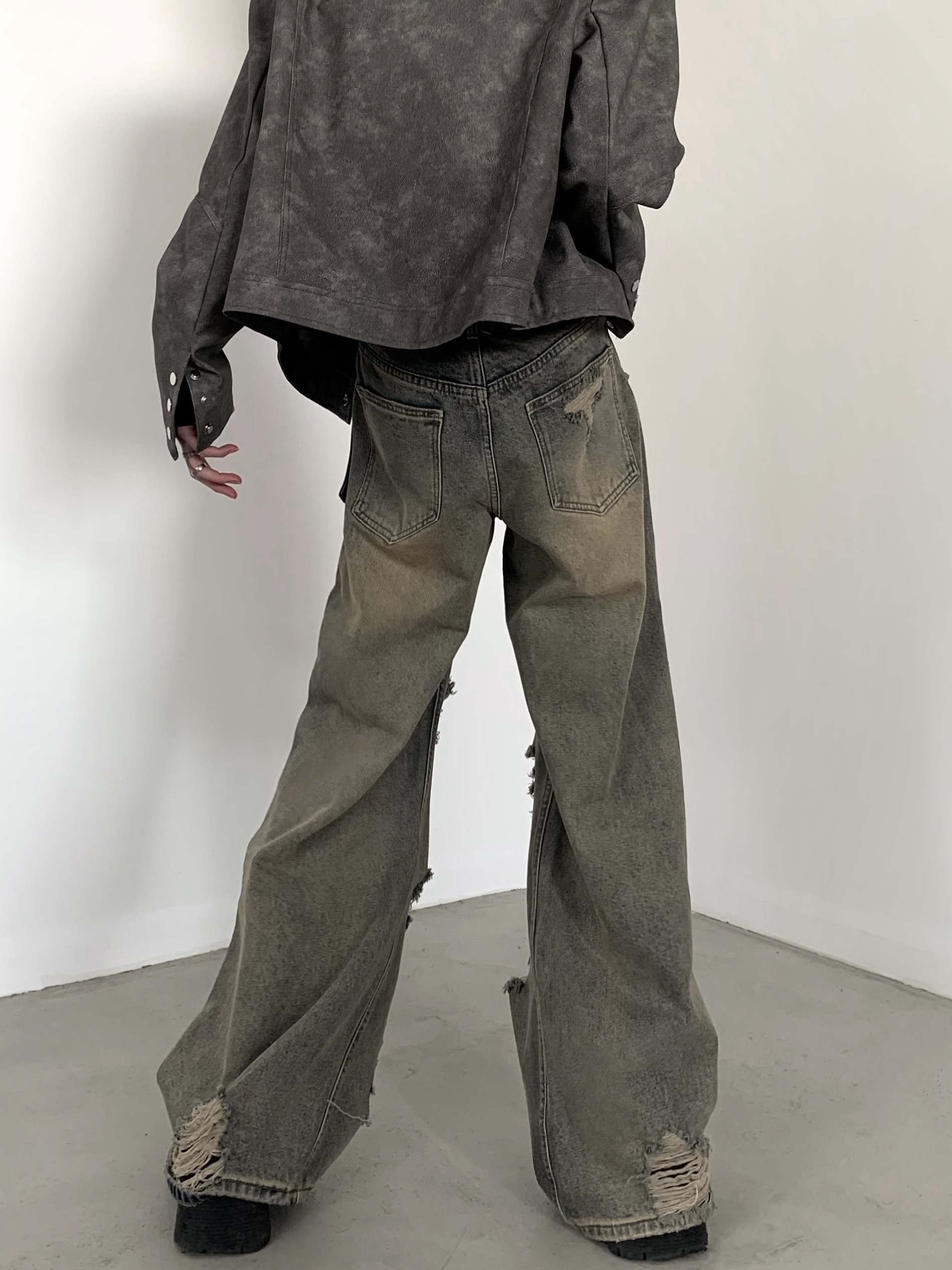 Wash Damaged Wide-Leg Denim Jeans WN5956