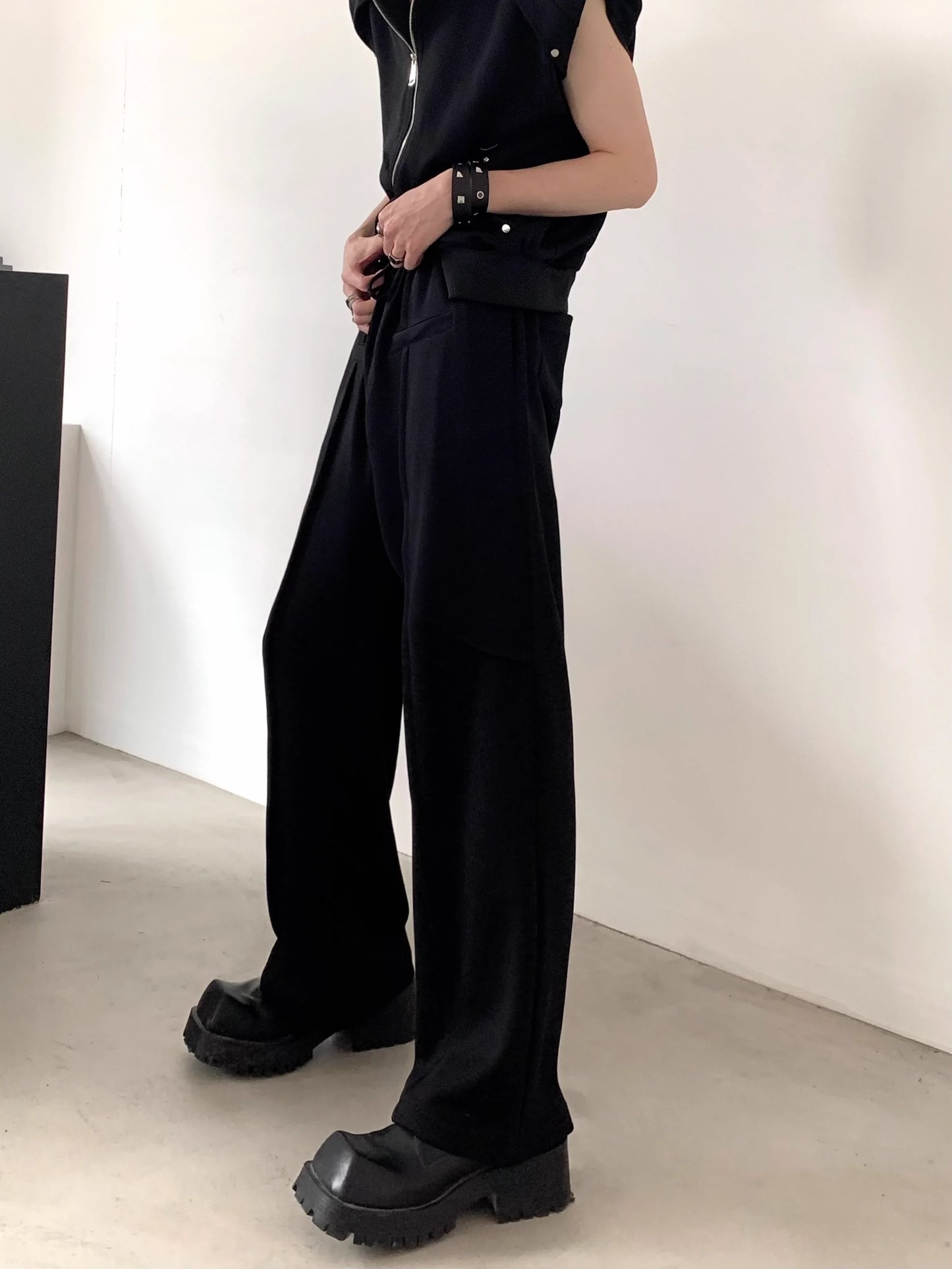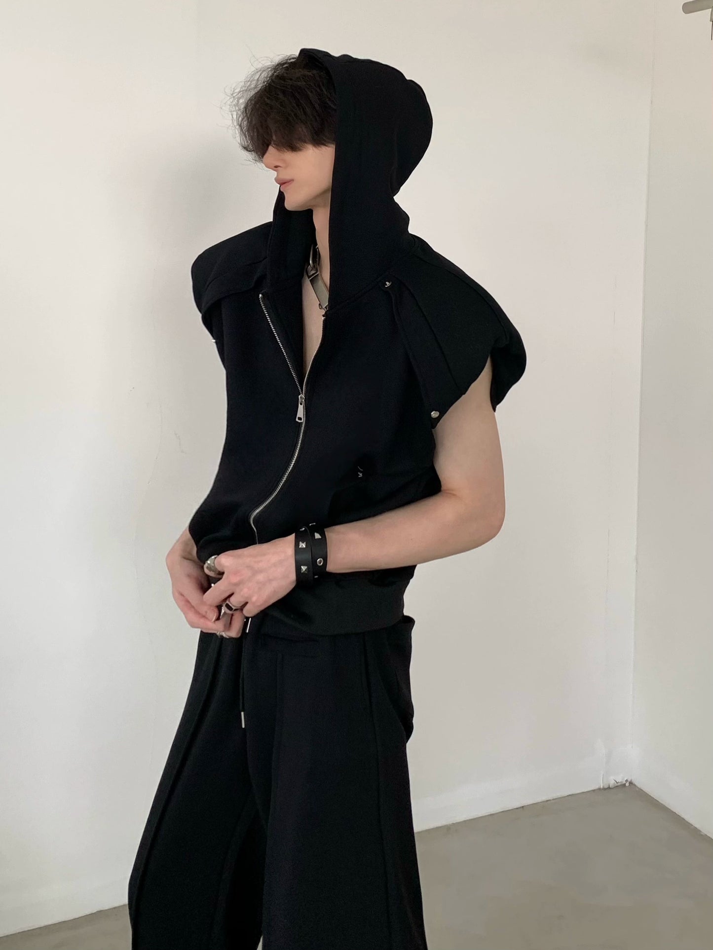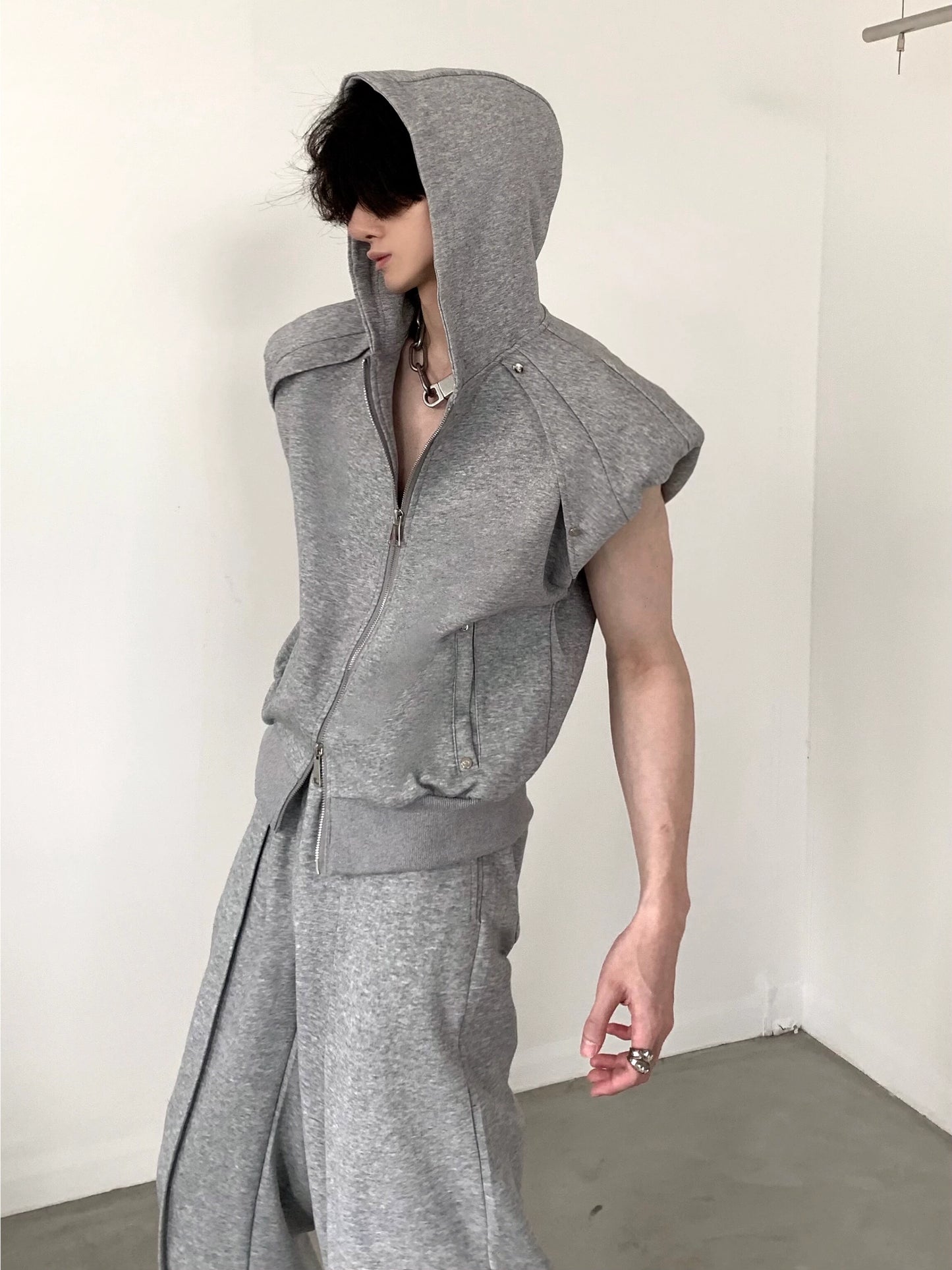 Zipper Shoulder Pad Hooded Sleeveless Vest & Casual Sweatpants Setup WN6001