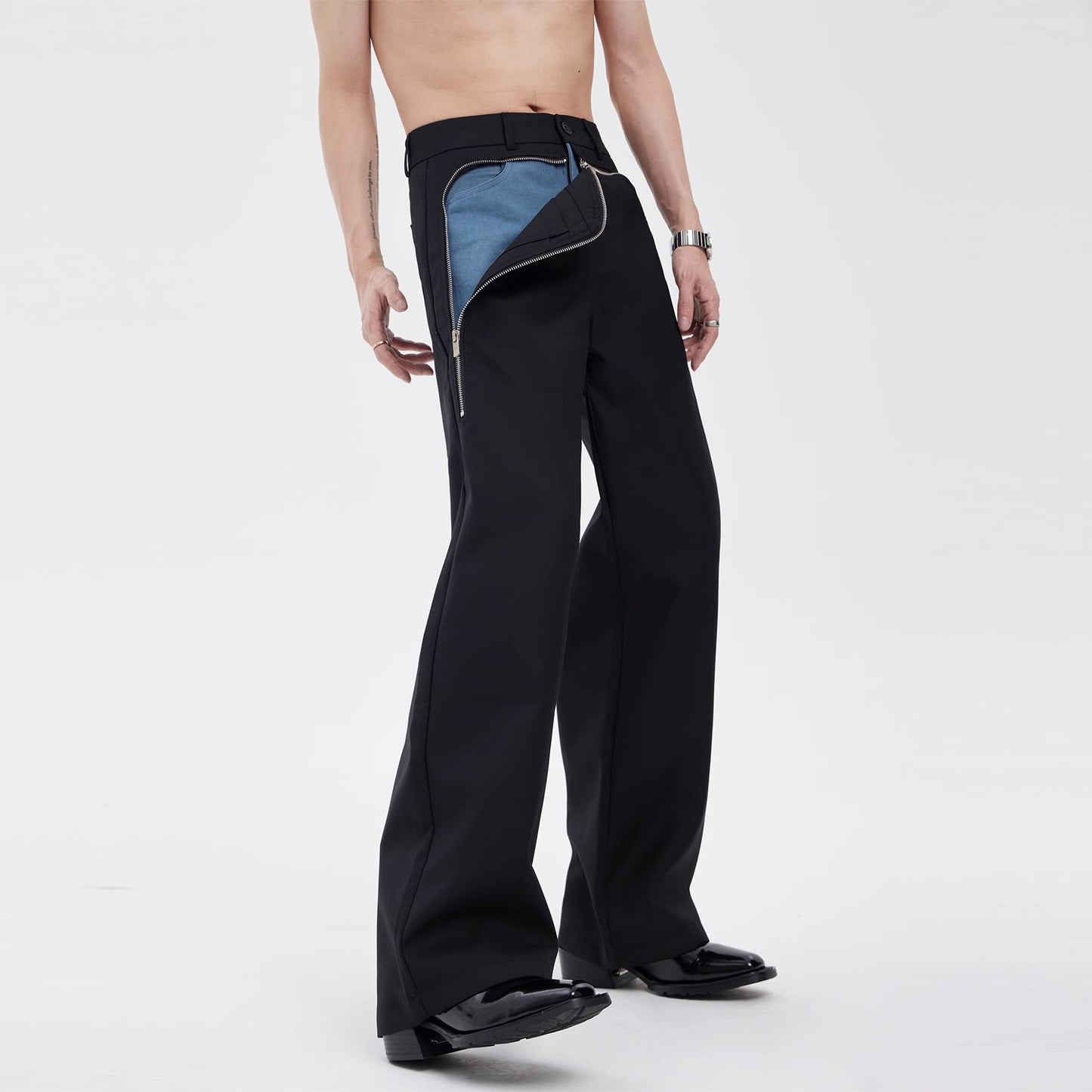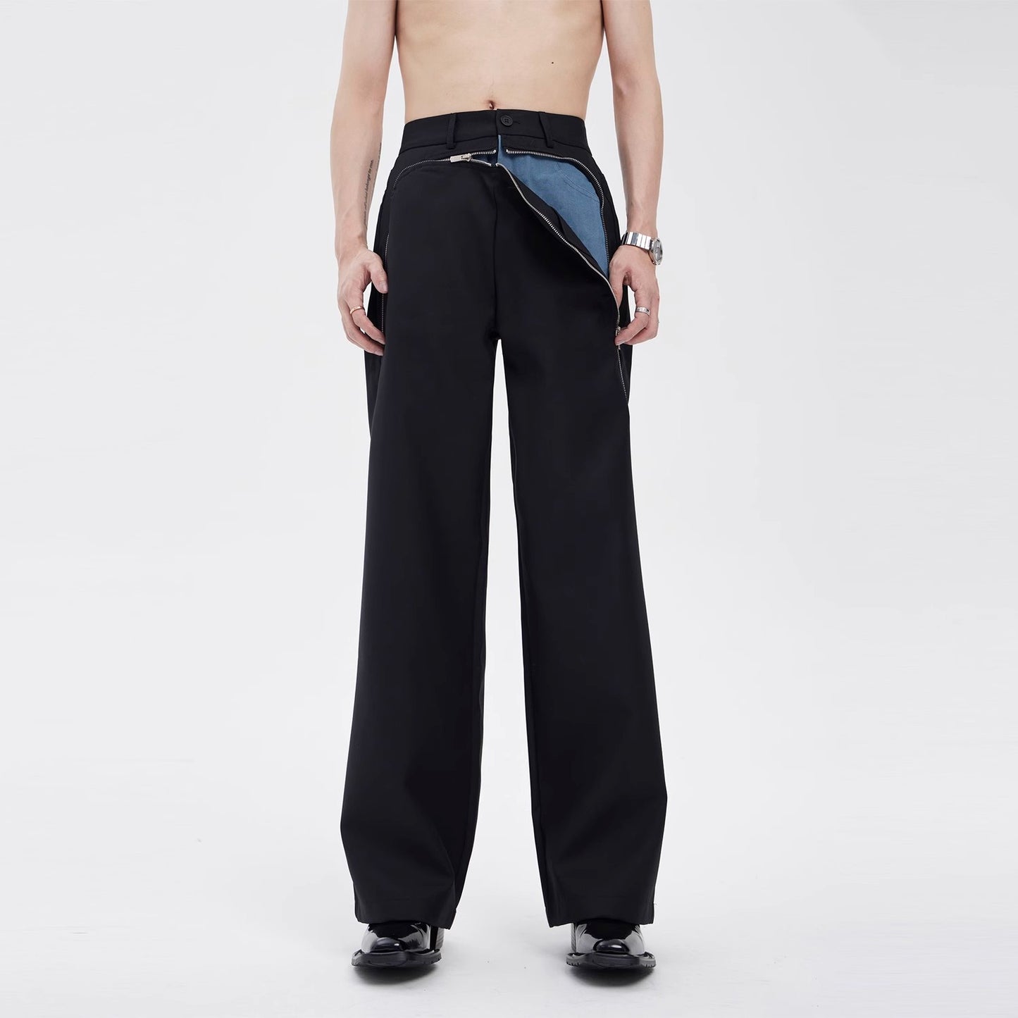 Denim Patchwork Design Wide-Leg Straight Trousers WN6834
