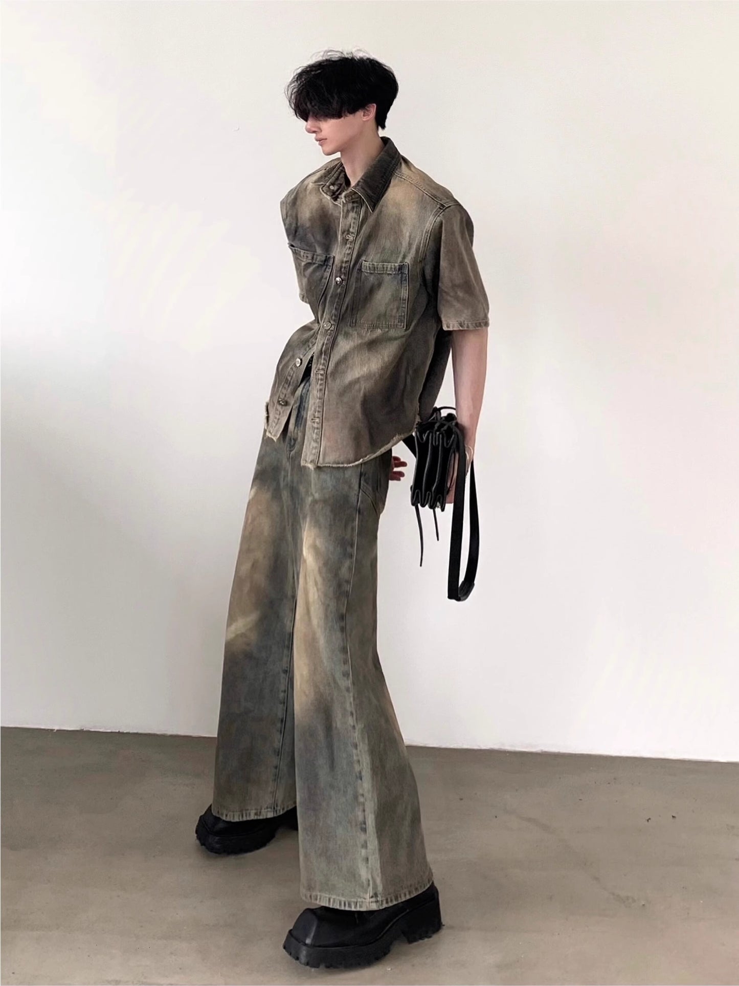 Washed Denim Short Sleeve Shirt & Wide-Leg Denim Jeans Setup WN7047
